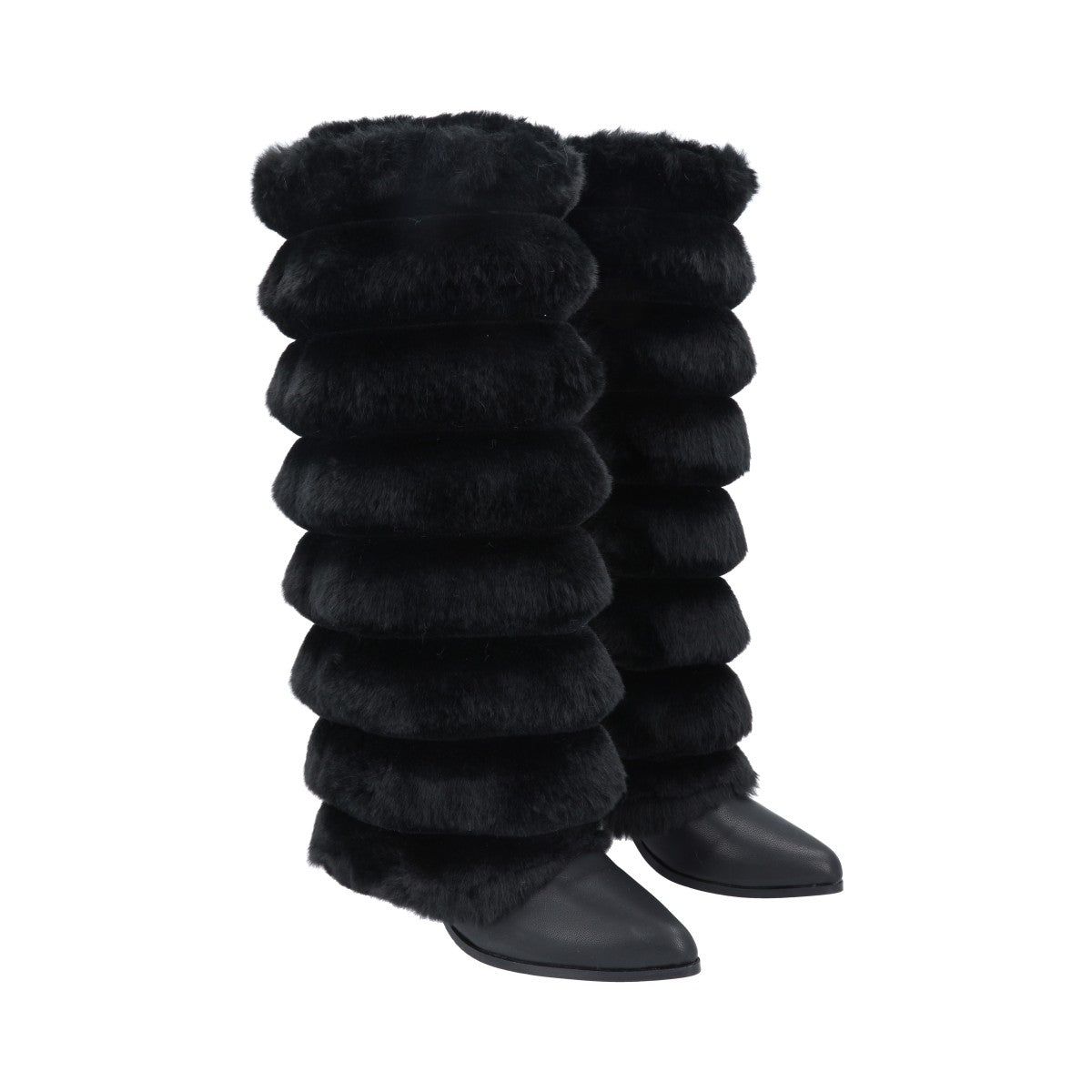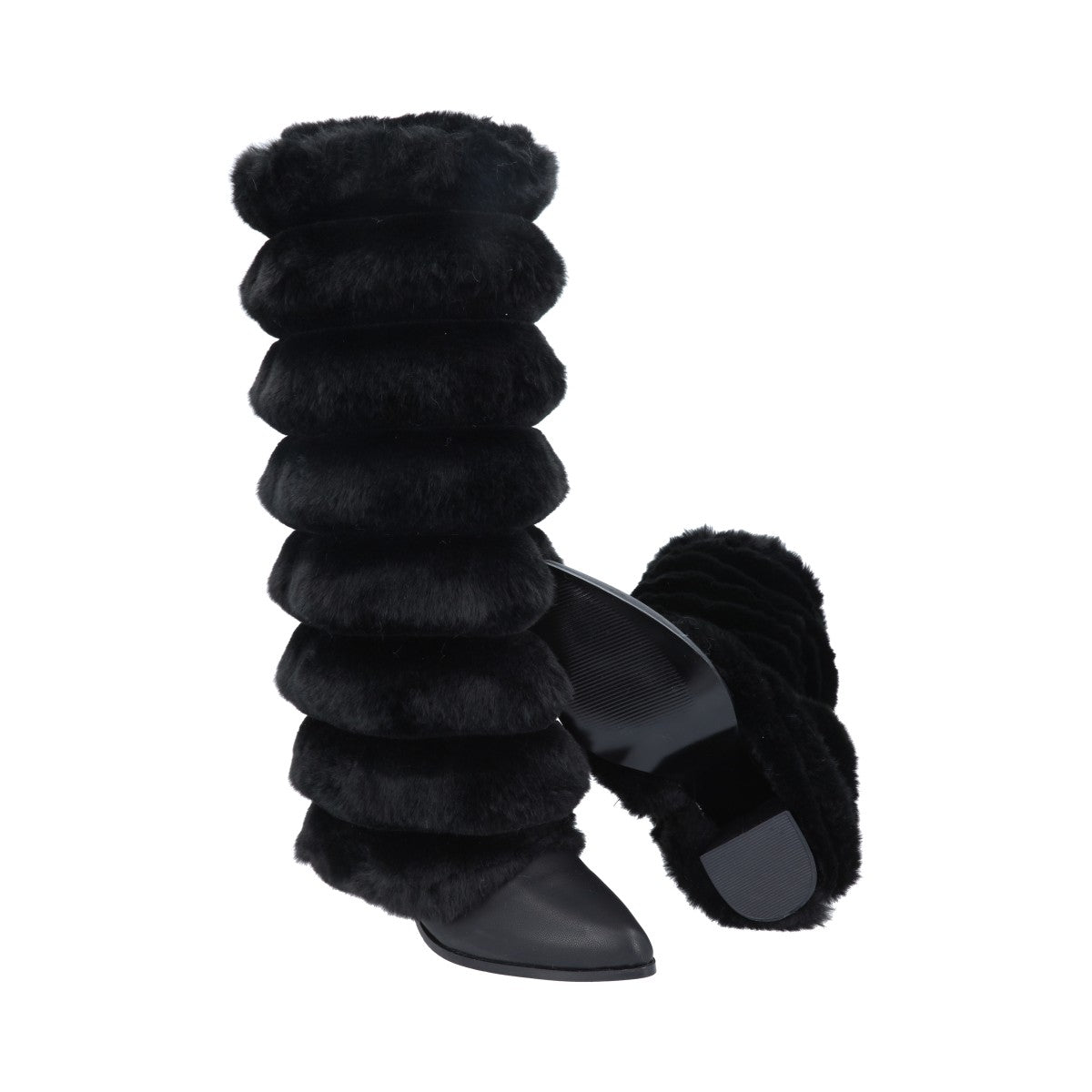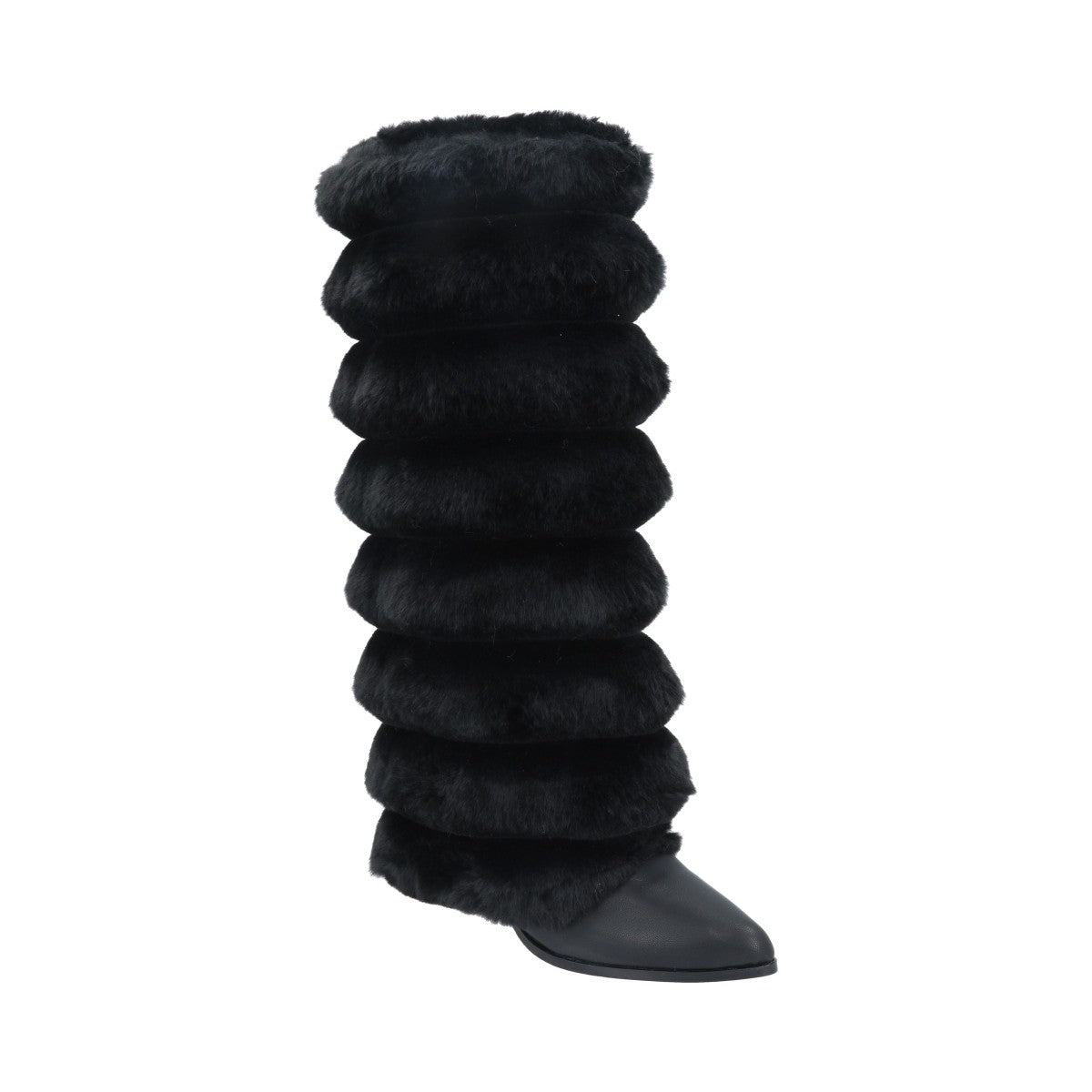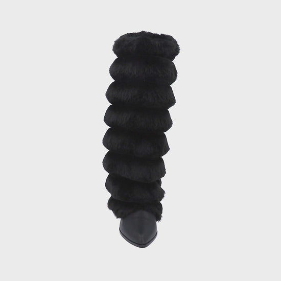Bota puntal de tacón larga maxi con peluche para mujer de material negro cabra piel sintética con cierre reforzado lateral, altura hasta abajo de la rodilla.