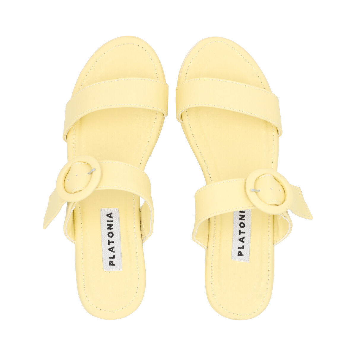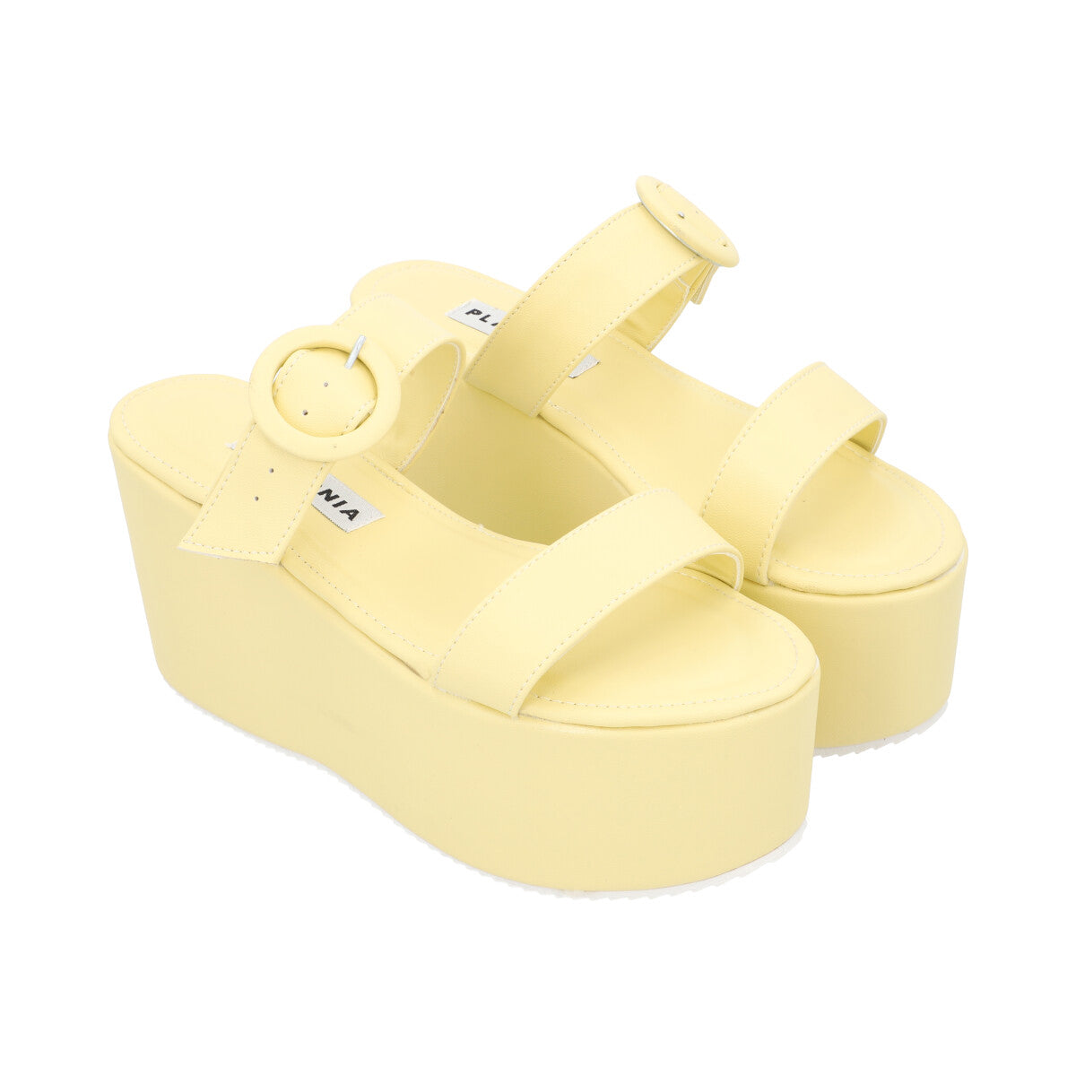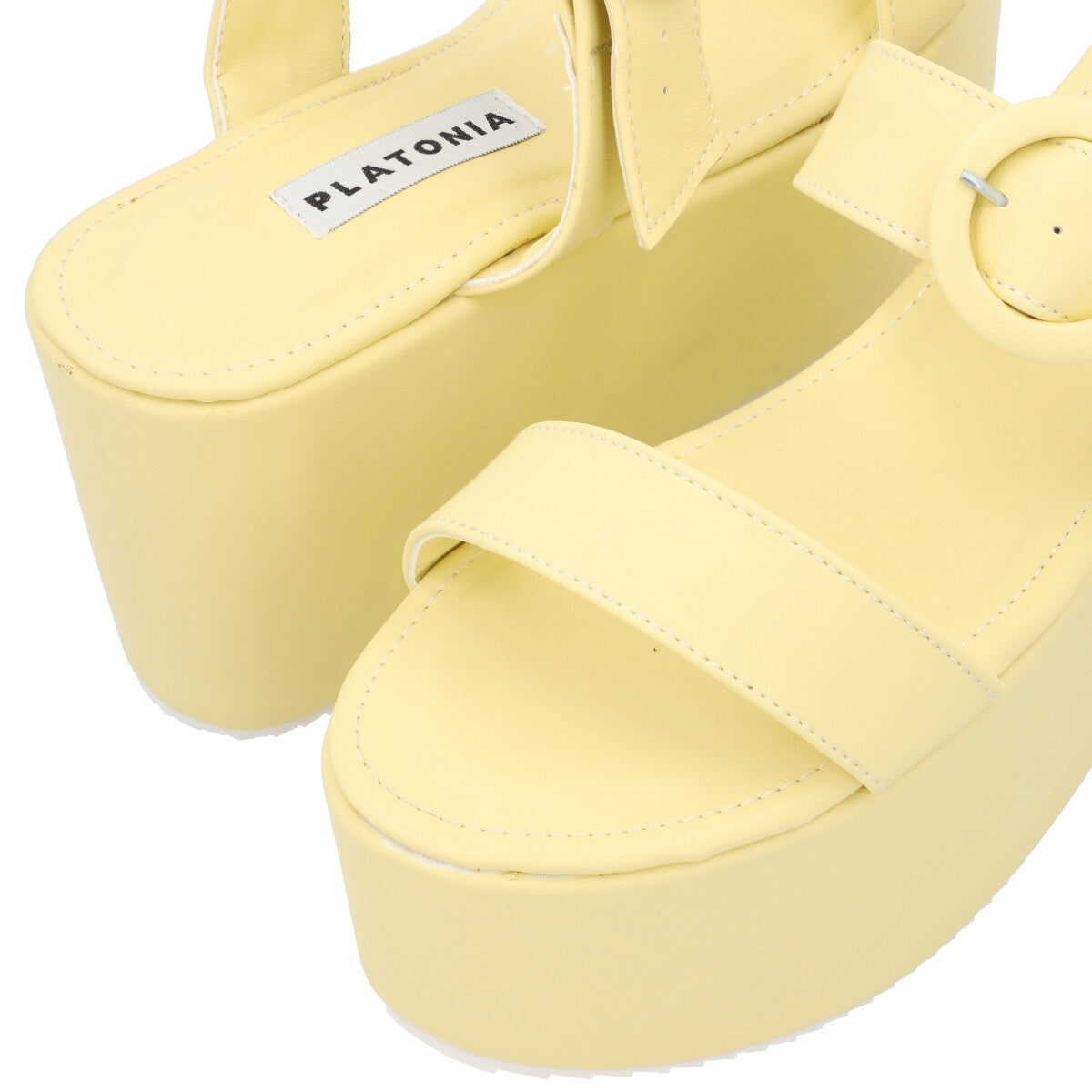 Sandalia de plataforma trendy para mujer color amarillo betún con doble tira y látigo ajustable.