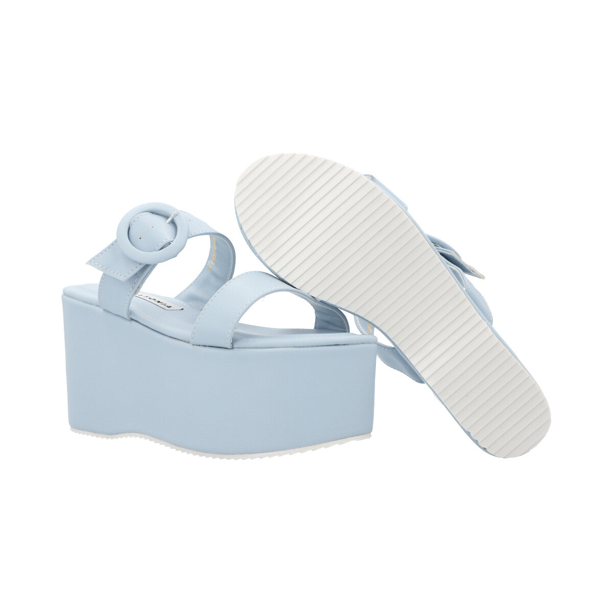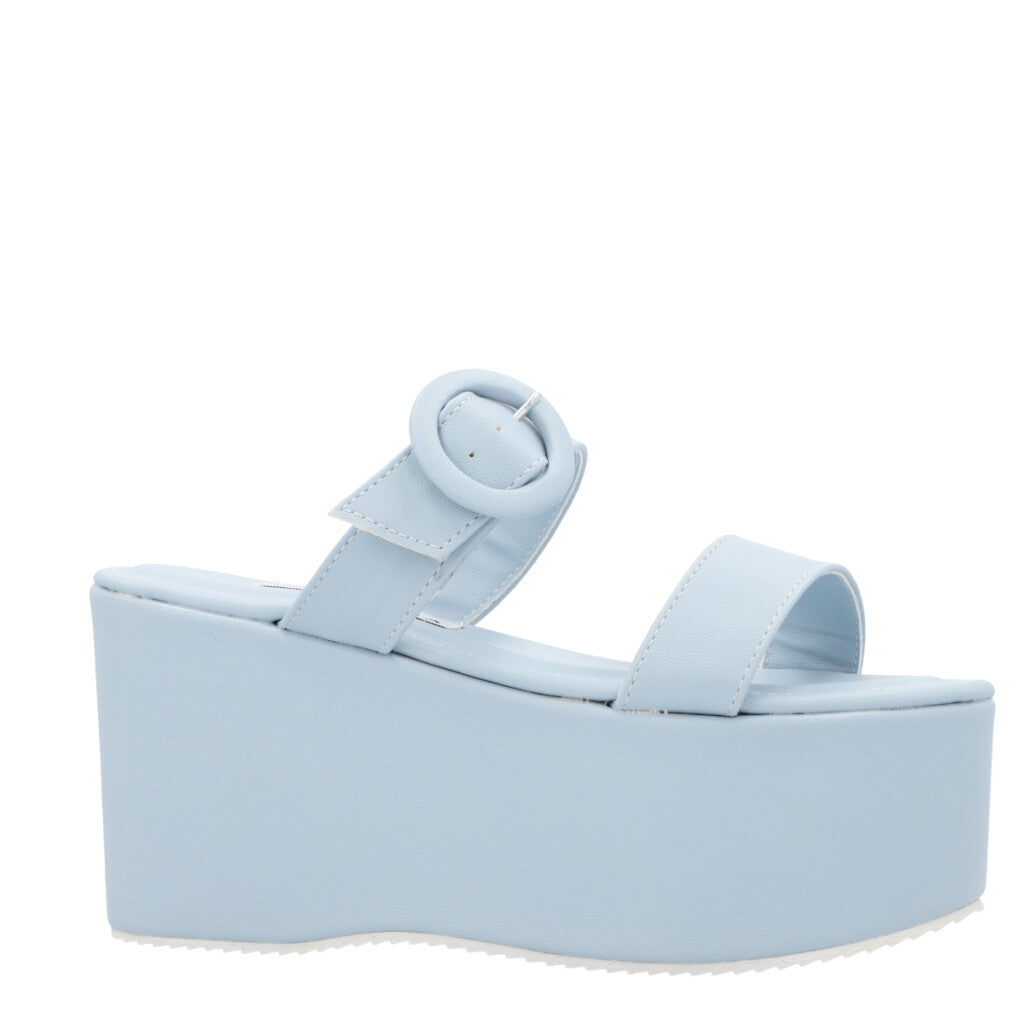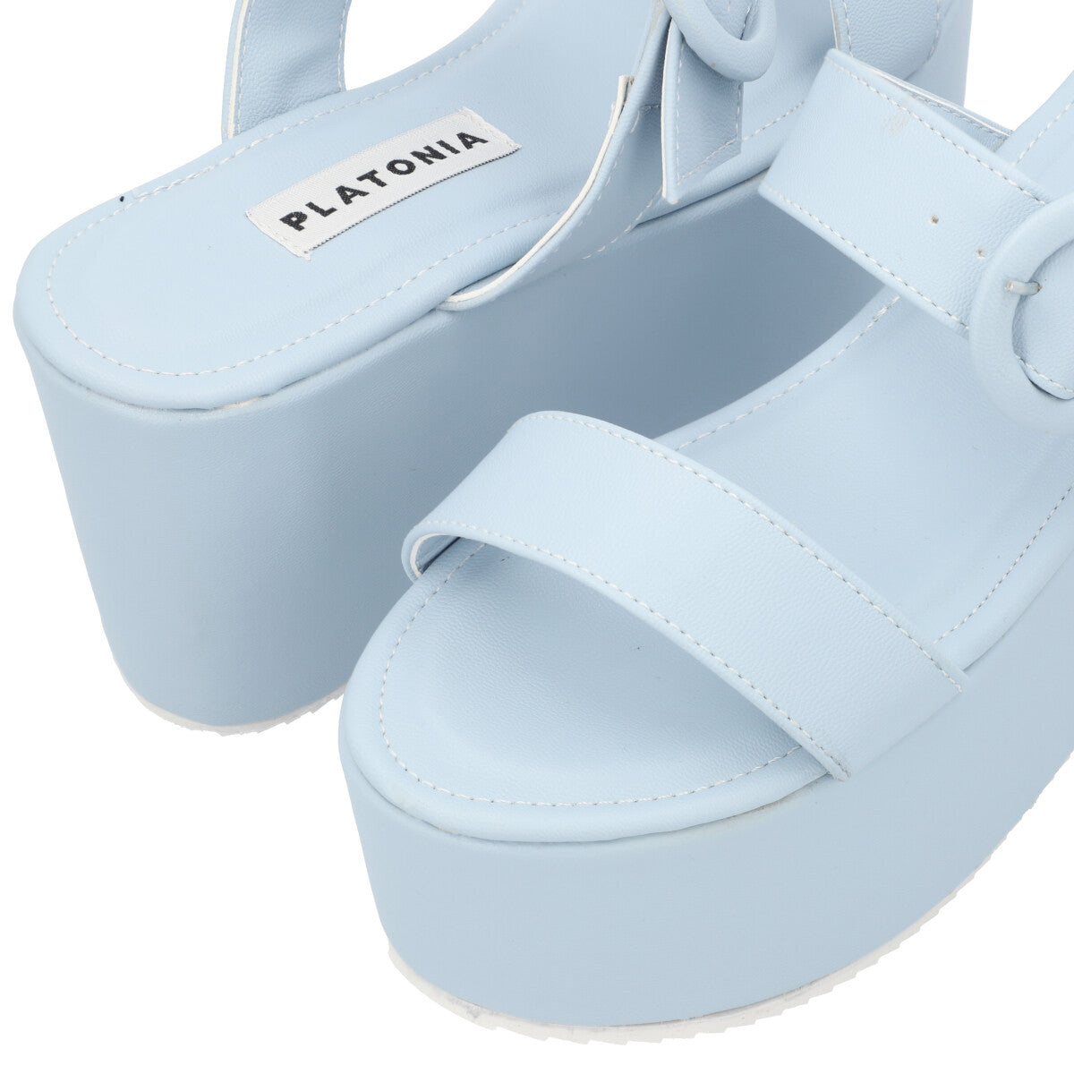 Sandalia de plataforma trendy para mujer color celeste con doble tira y látigo ajustable.