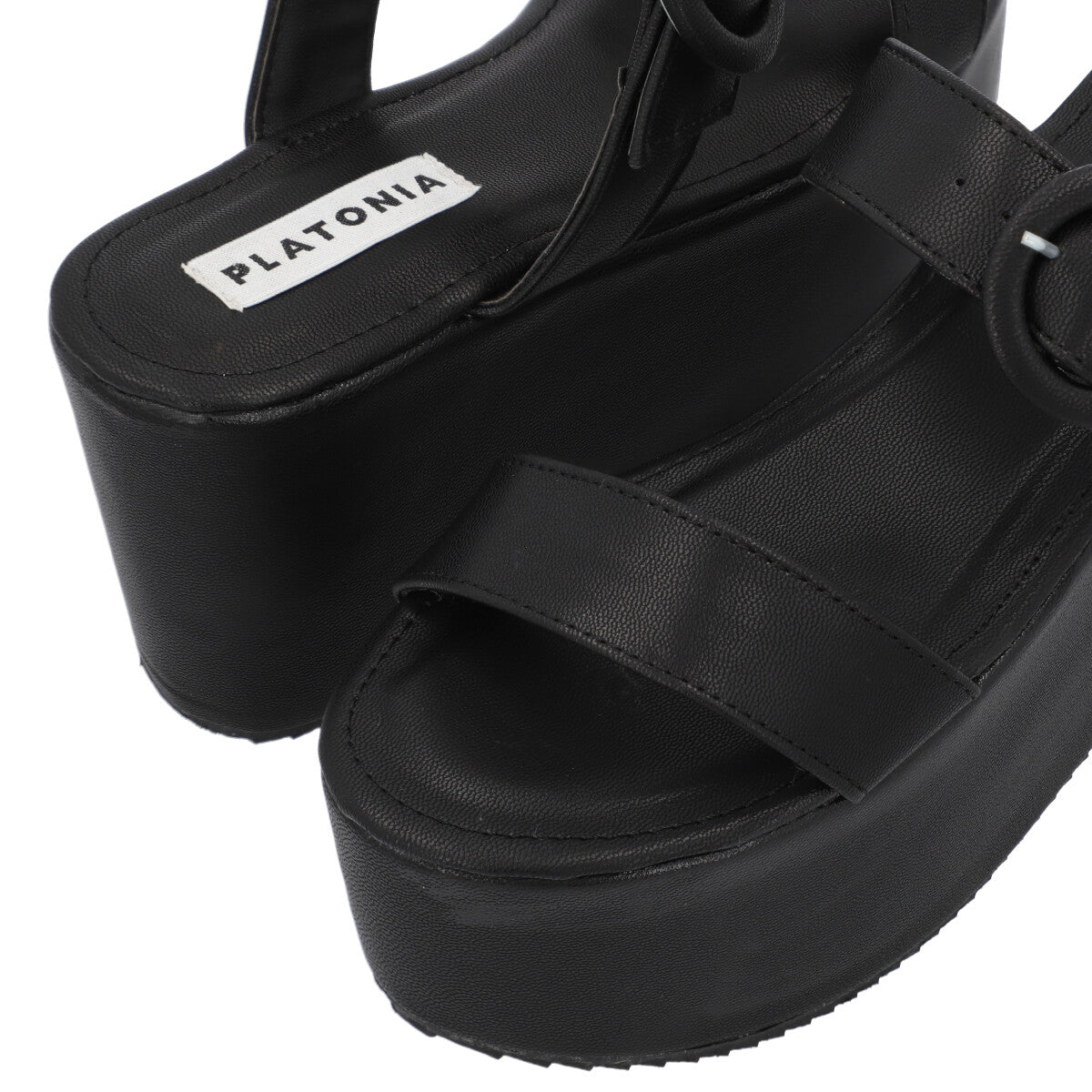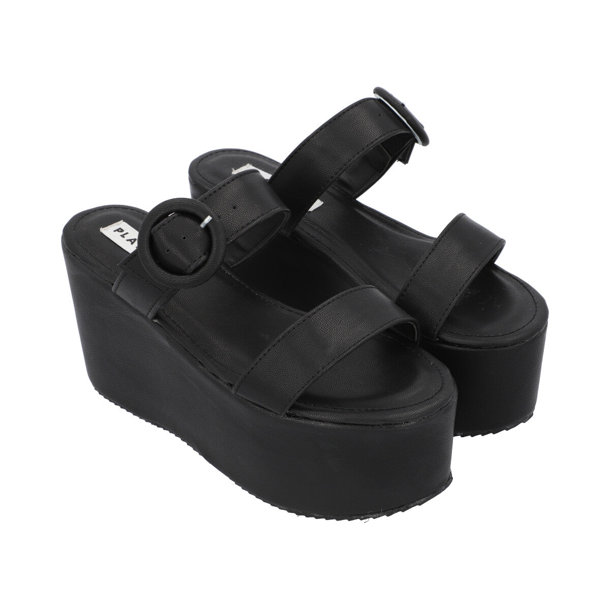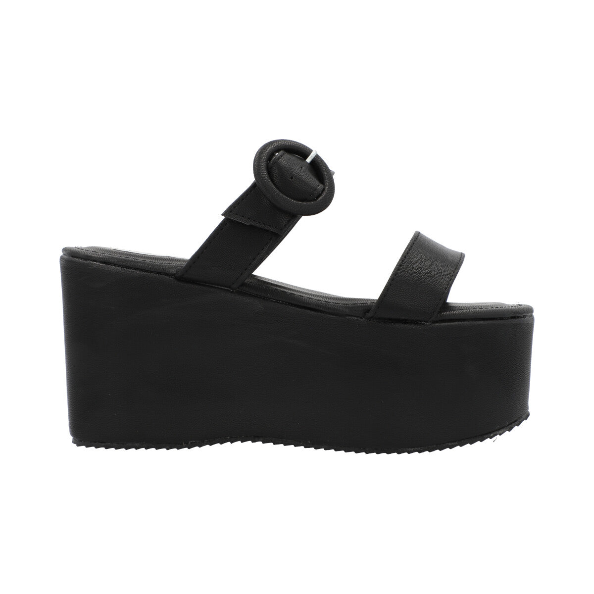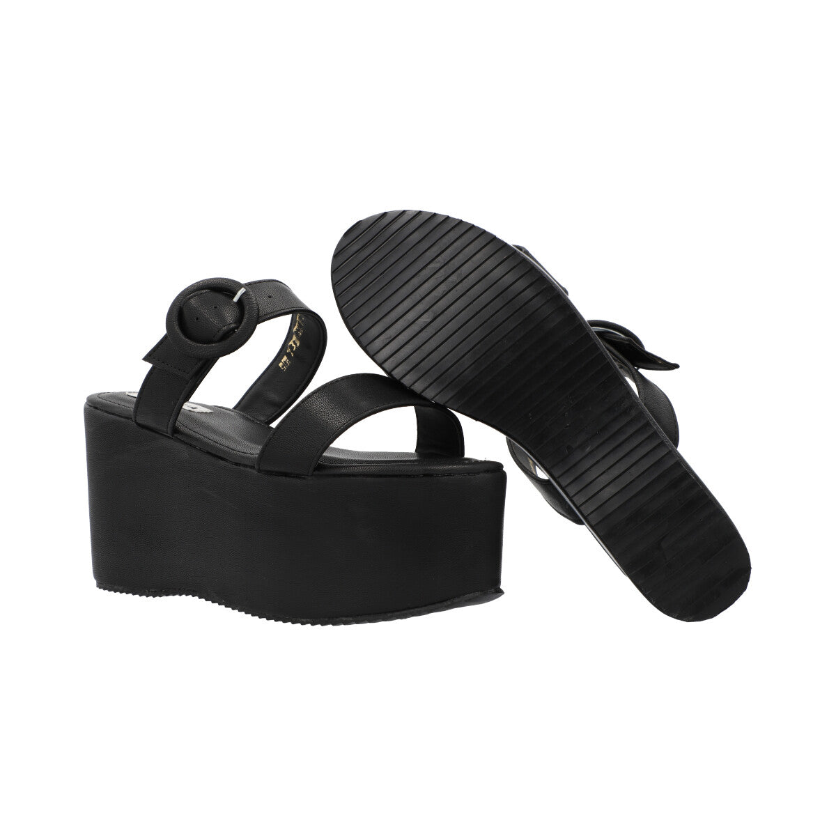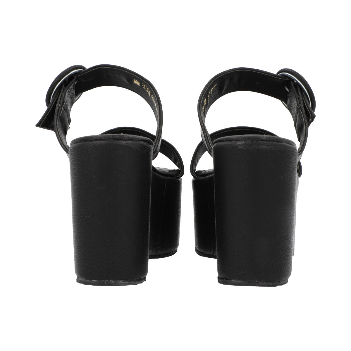 Sandalia de plataforma trendy para mujer color negro con doble tira y látigo ajustable.