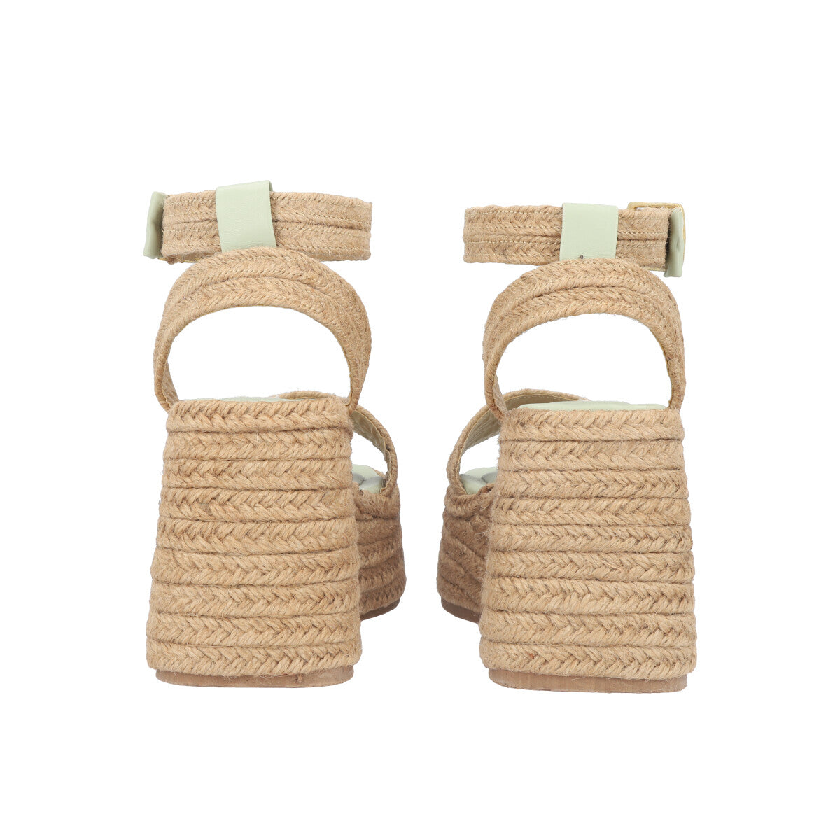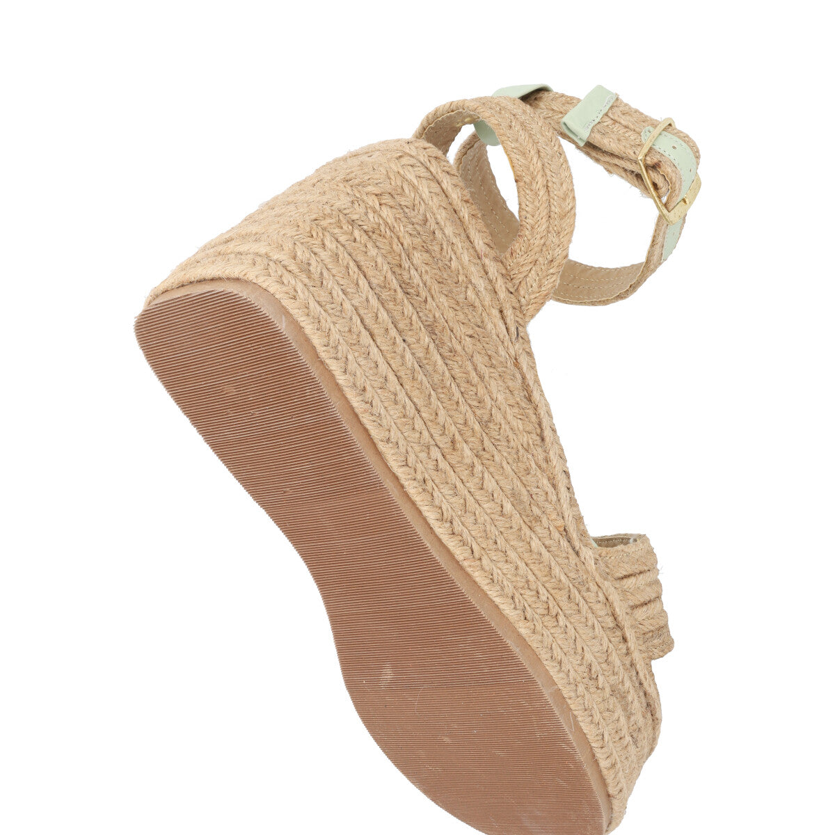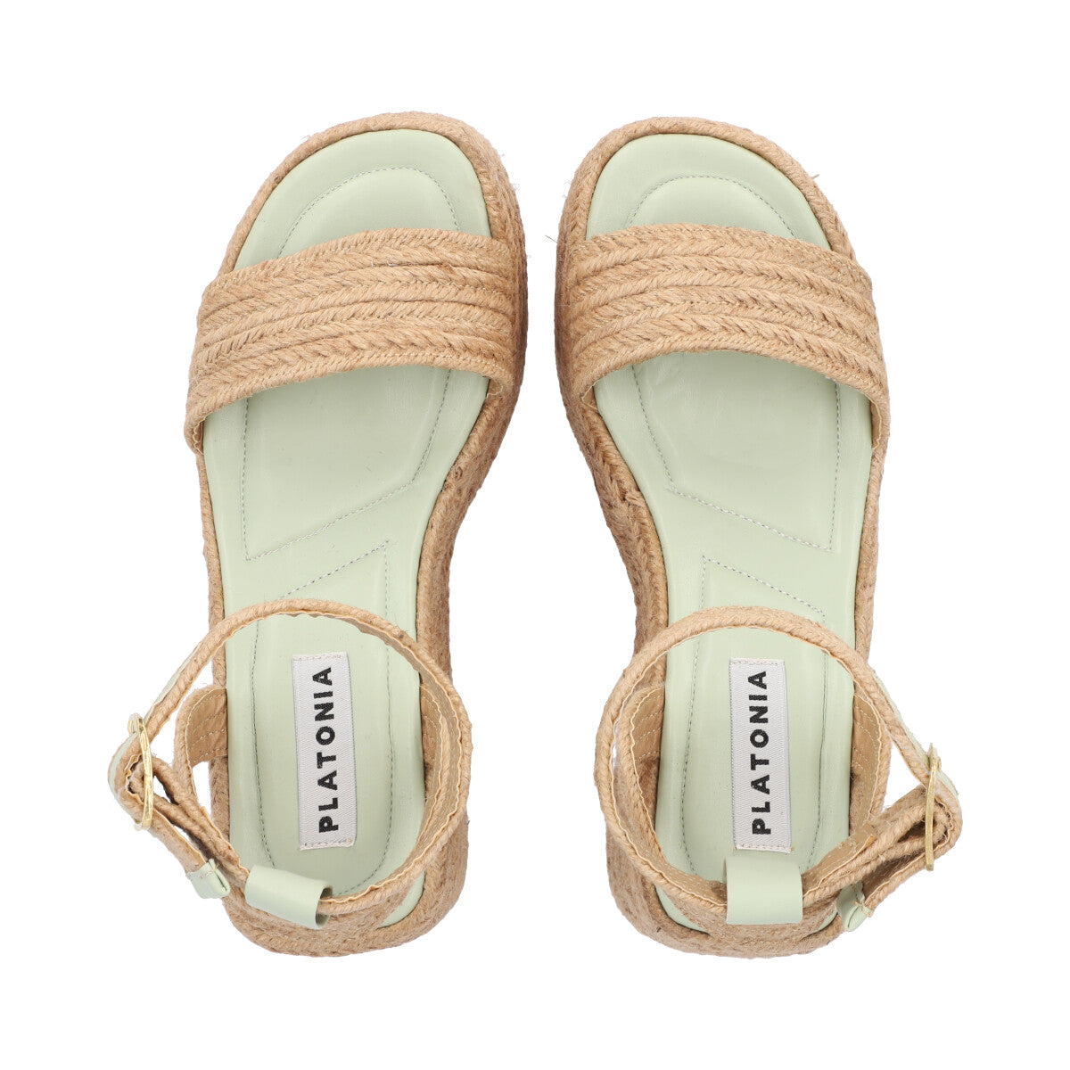 Sandalia de plataforma con yute natural para mujer color pistache con látigo ajustable reforzado y plantilla de memory foam.