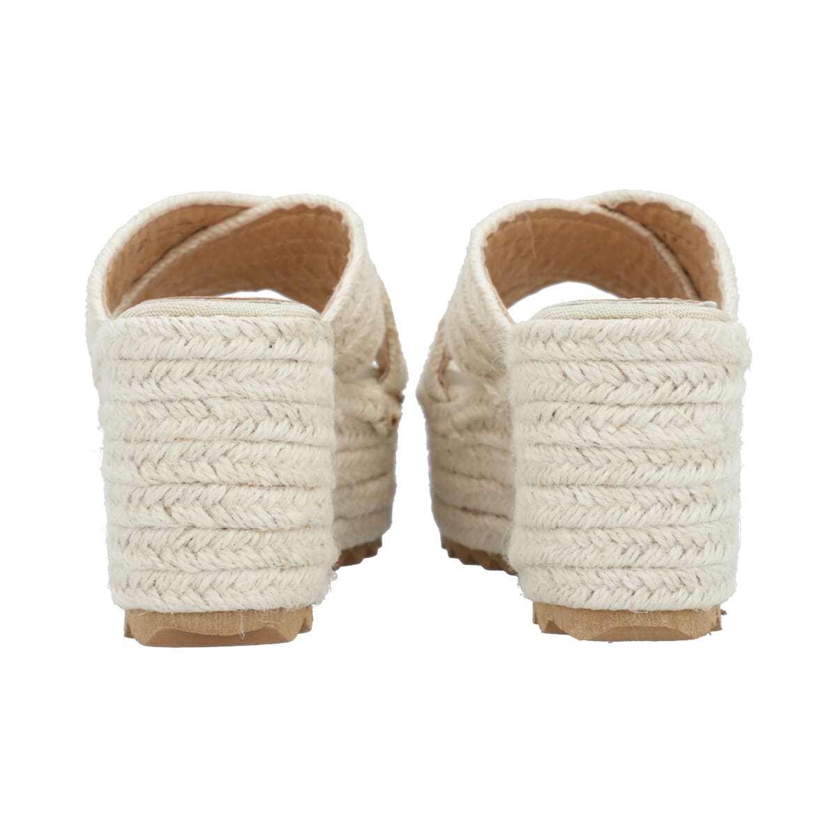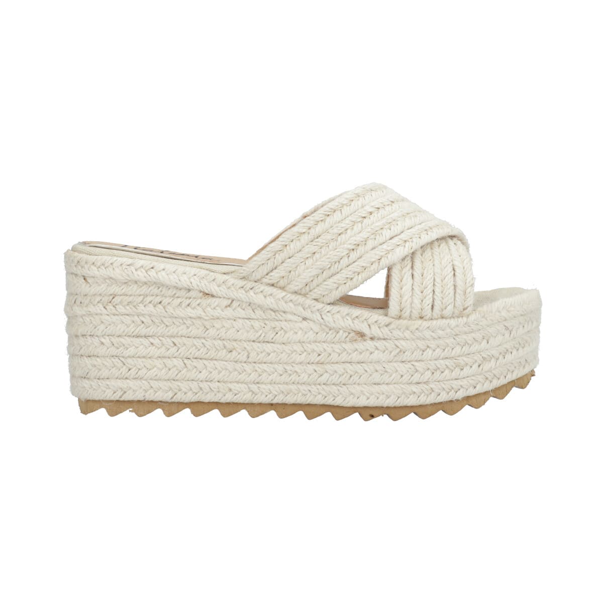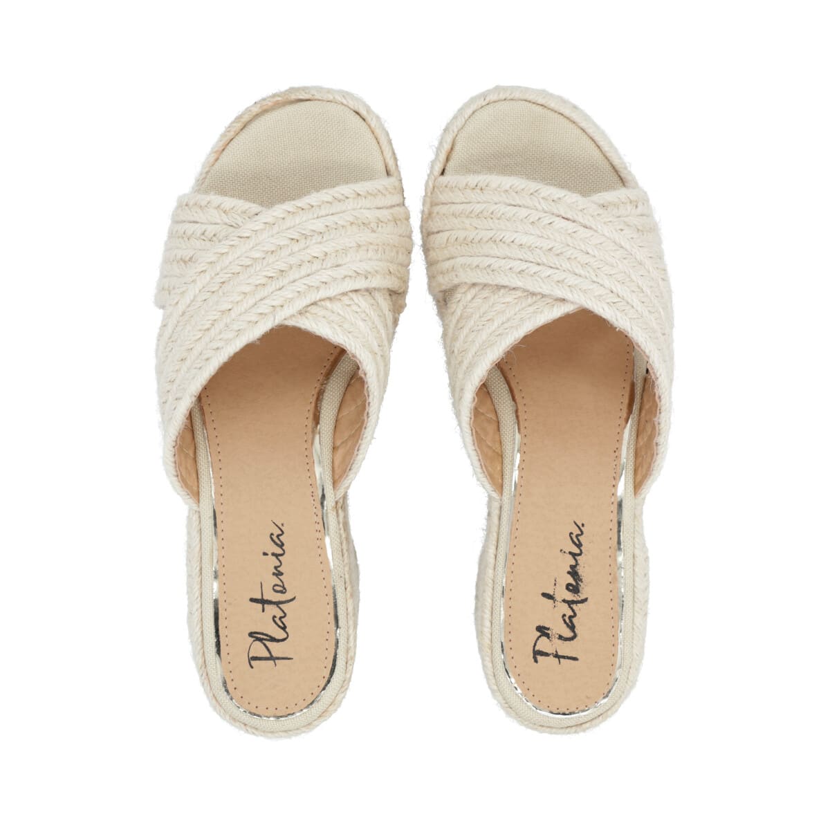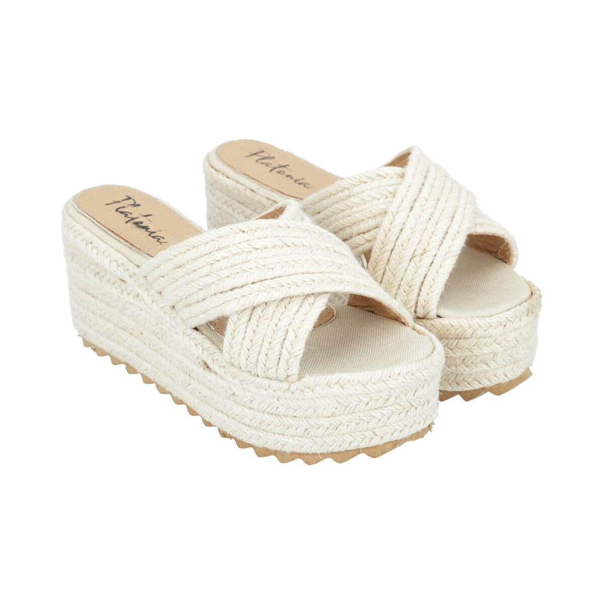 Sandalia de plataforma con yute para mujer color neutro estilo de dos tiras cruzado.