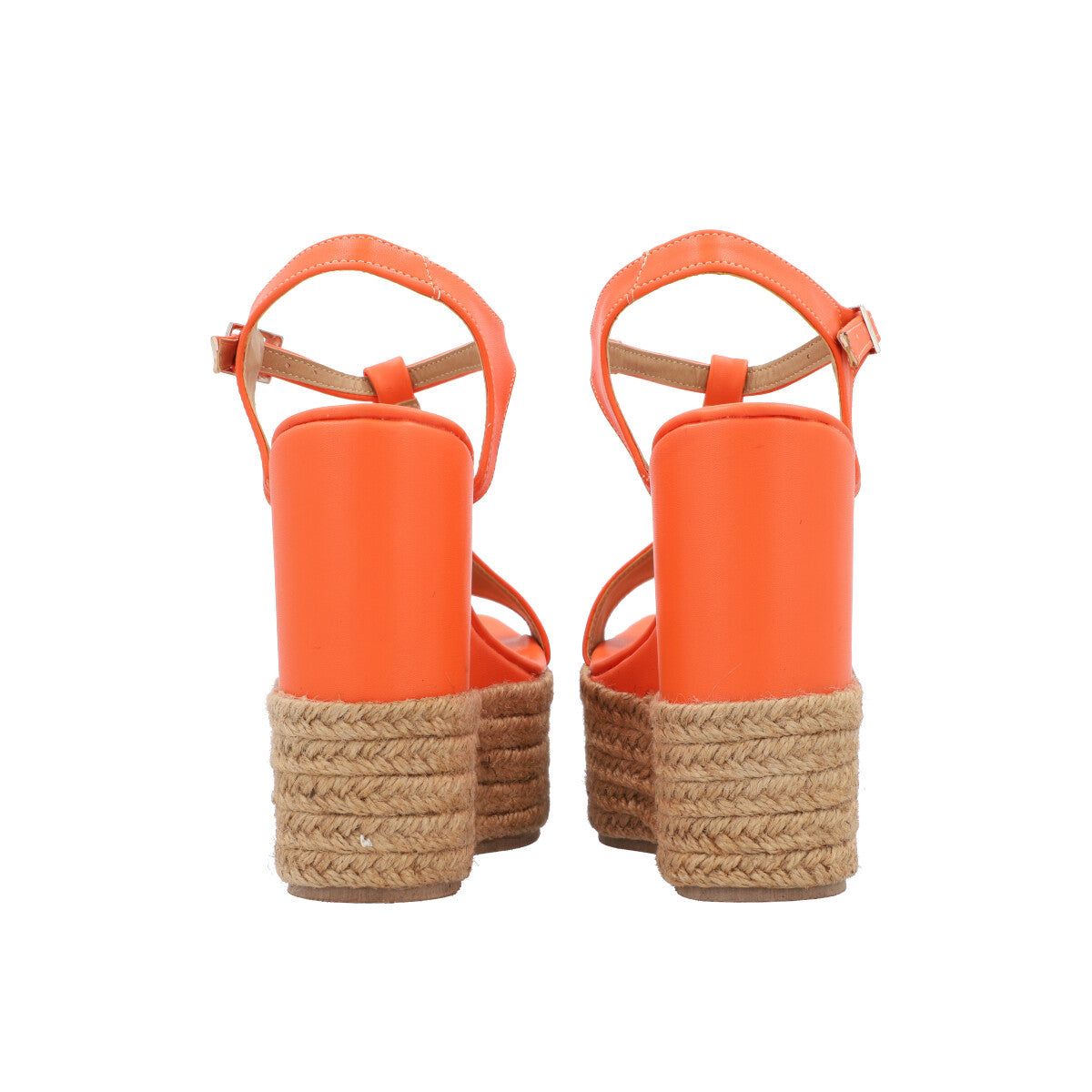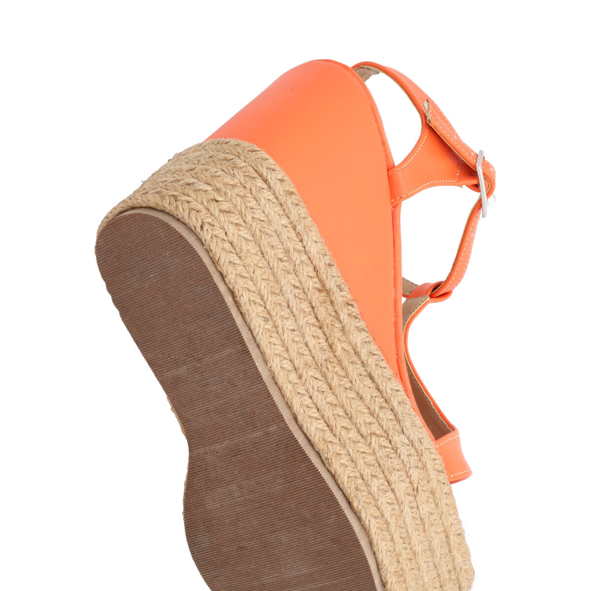Sandalia de plataforma cuadrada con yute para mujer color cabra leahter naranja con hebilla ajustable.