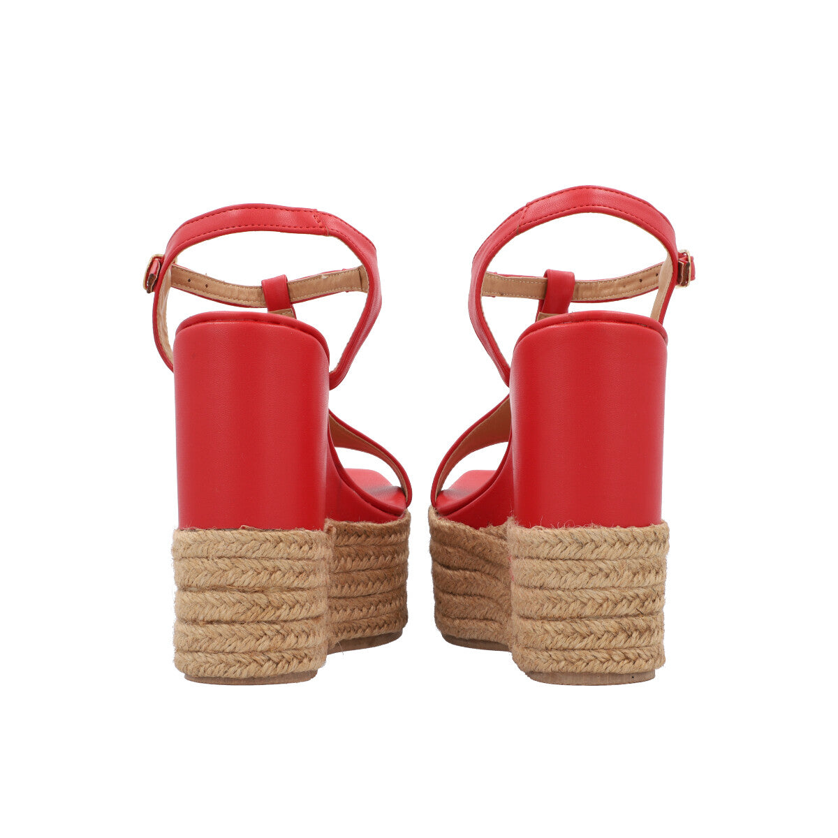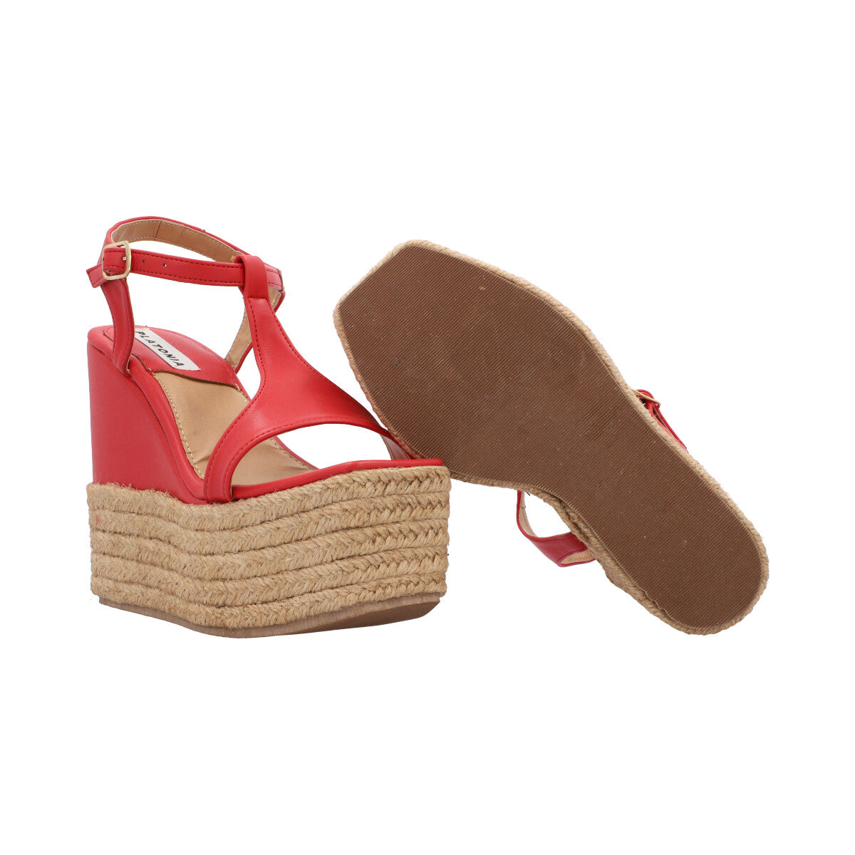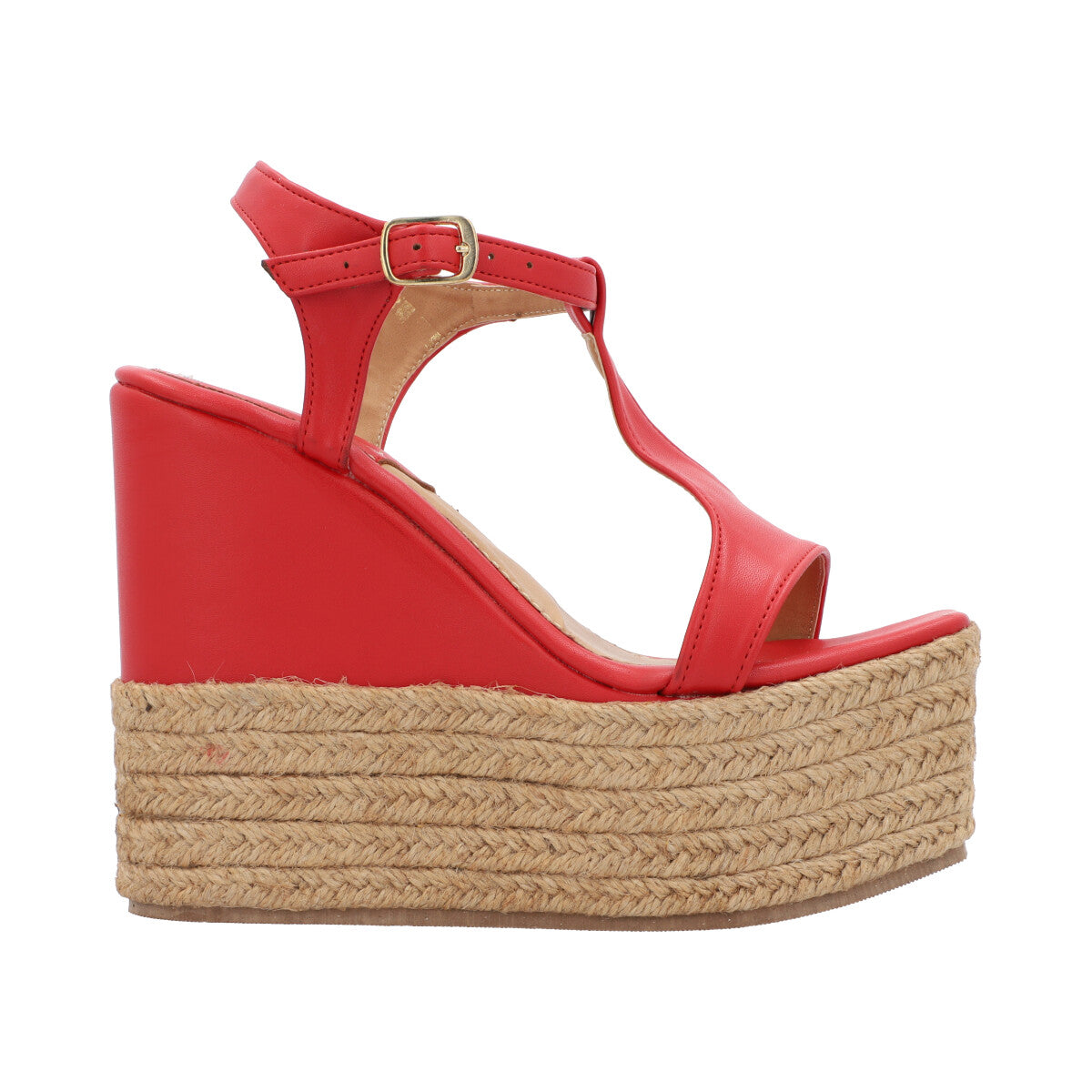 Sandalia de plataforma cuadrada con yute para mujer color cabra leahter rojo con hebilla ajustable.