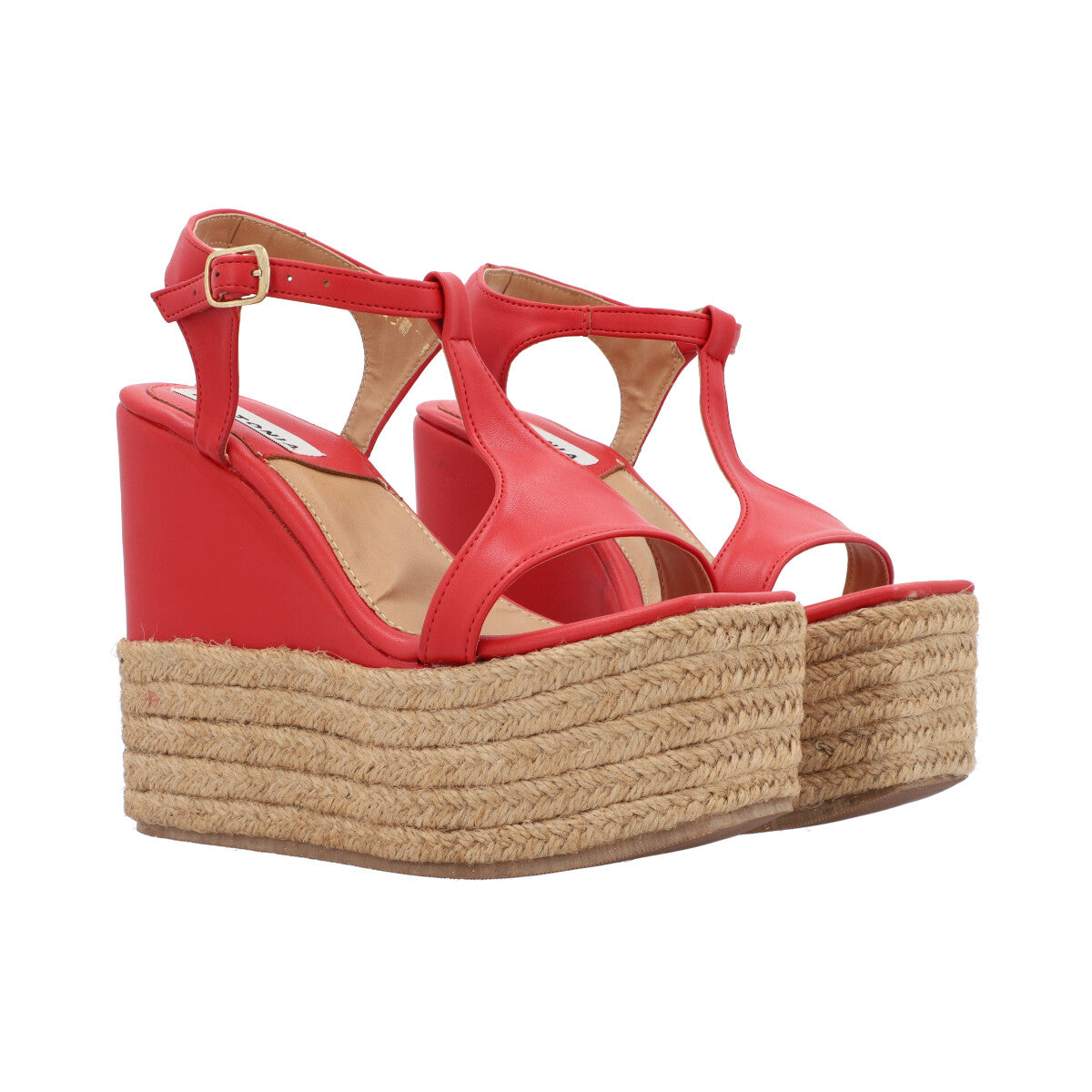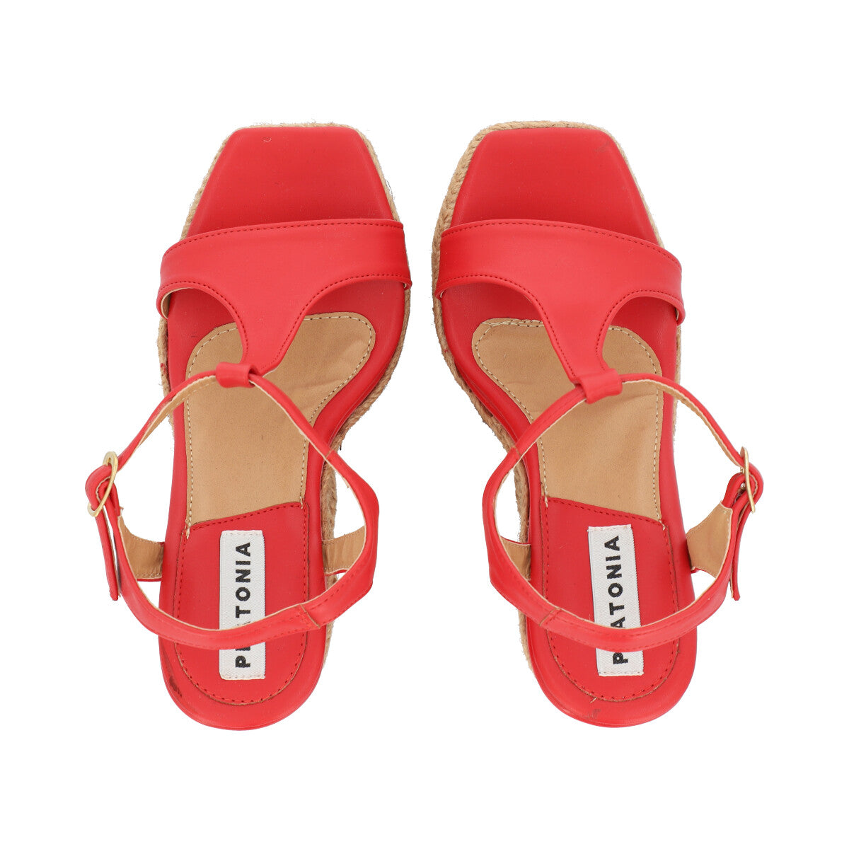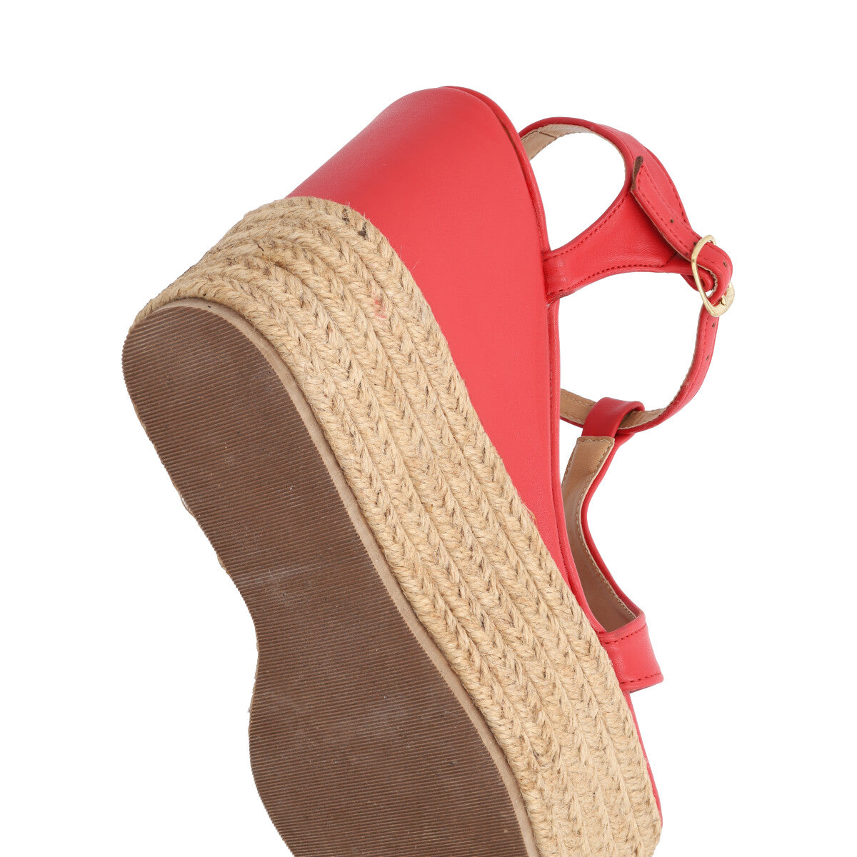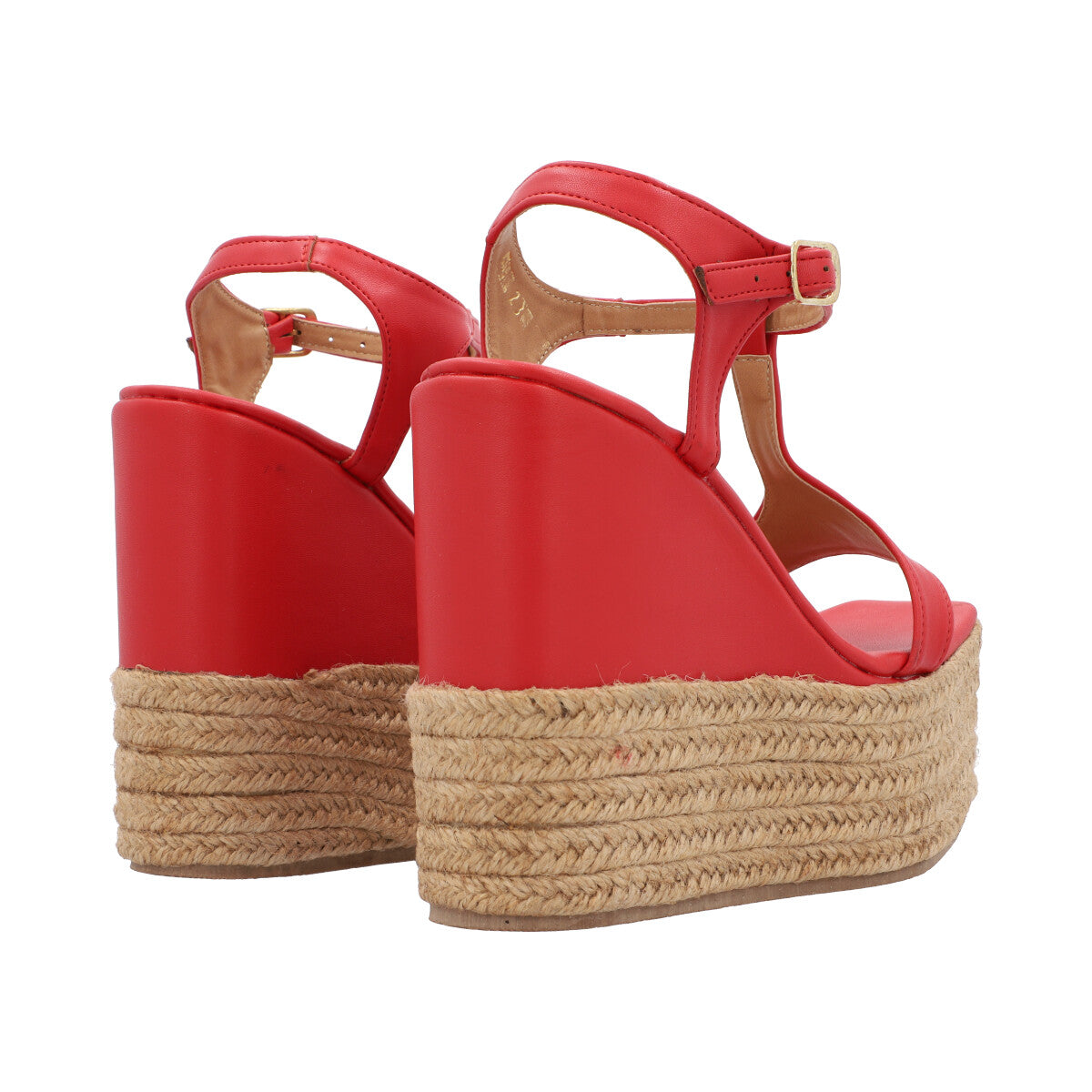 Sandalia de plataforma cuadrada con yute para mujer color cabra leahter rojo con hebilla ajustable.