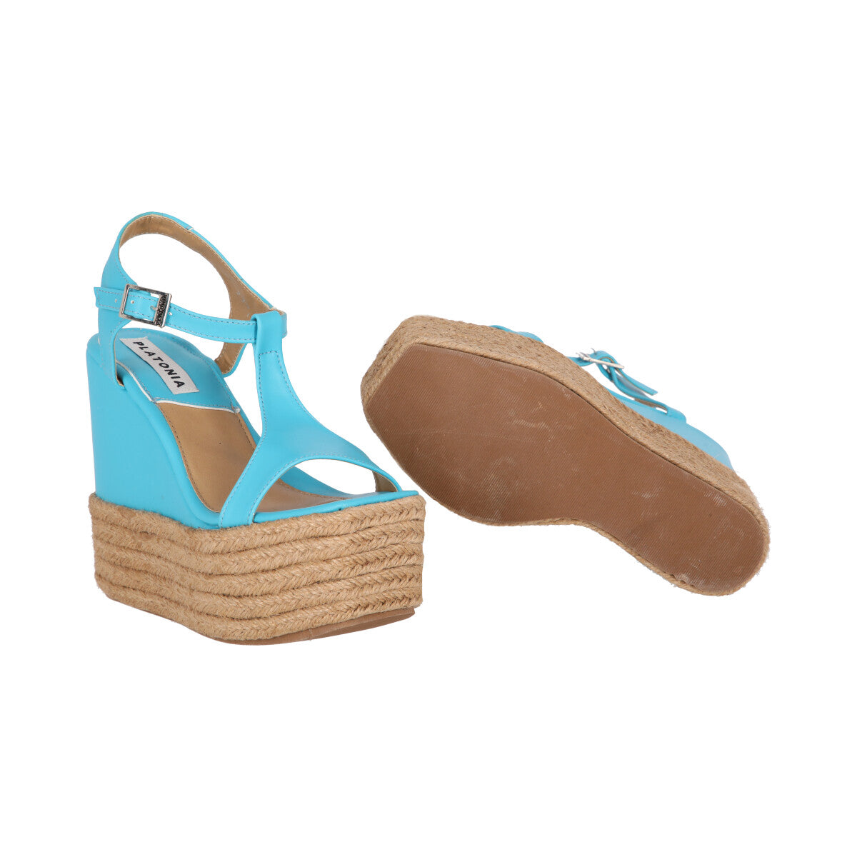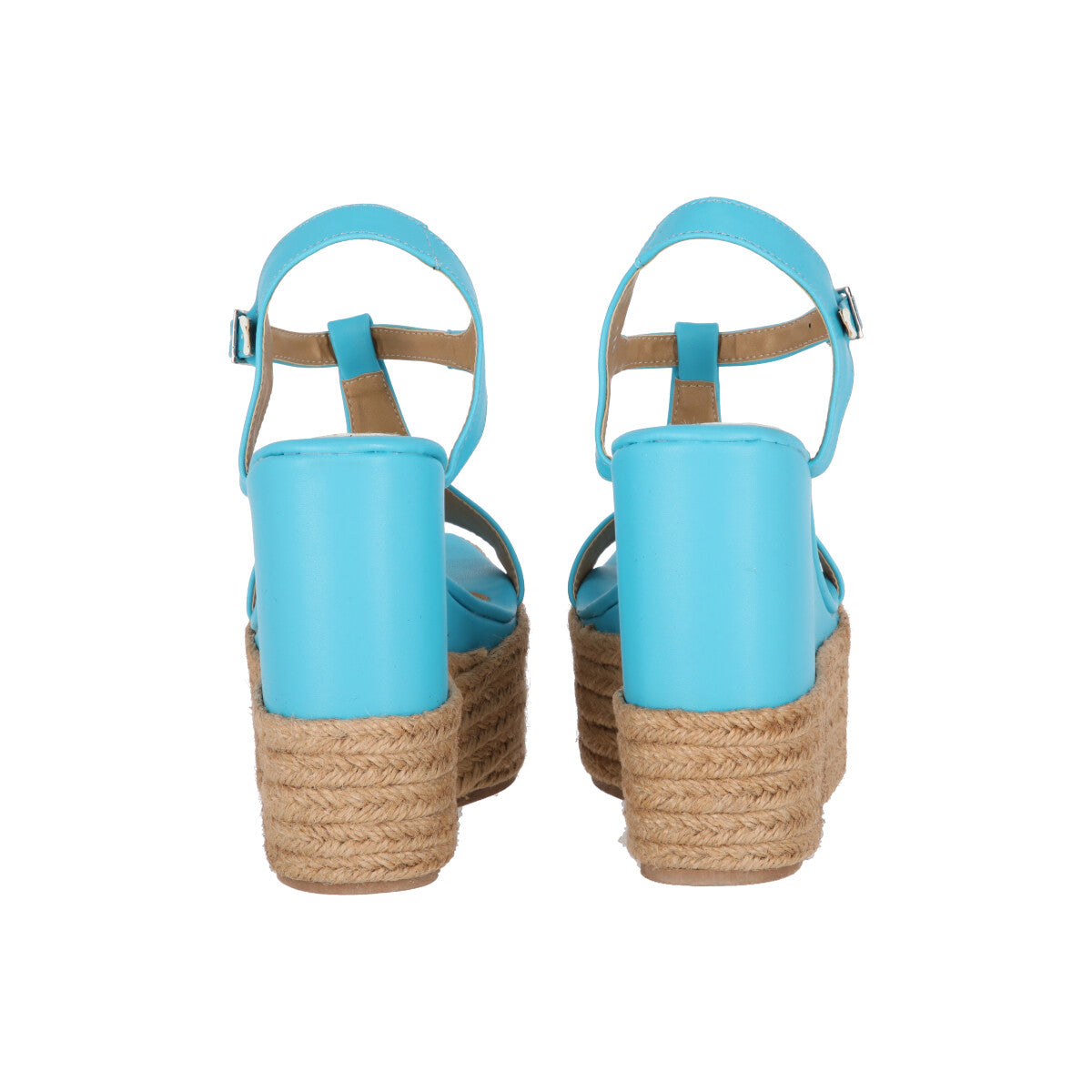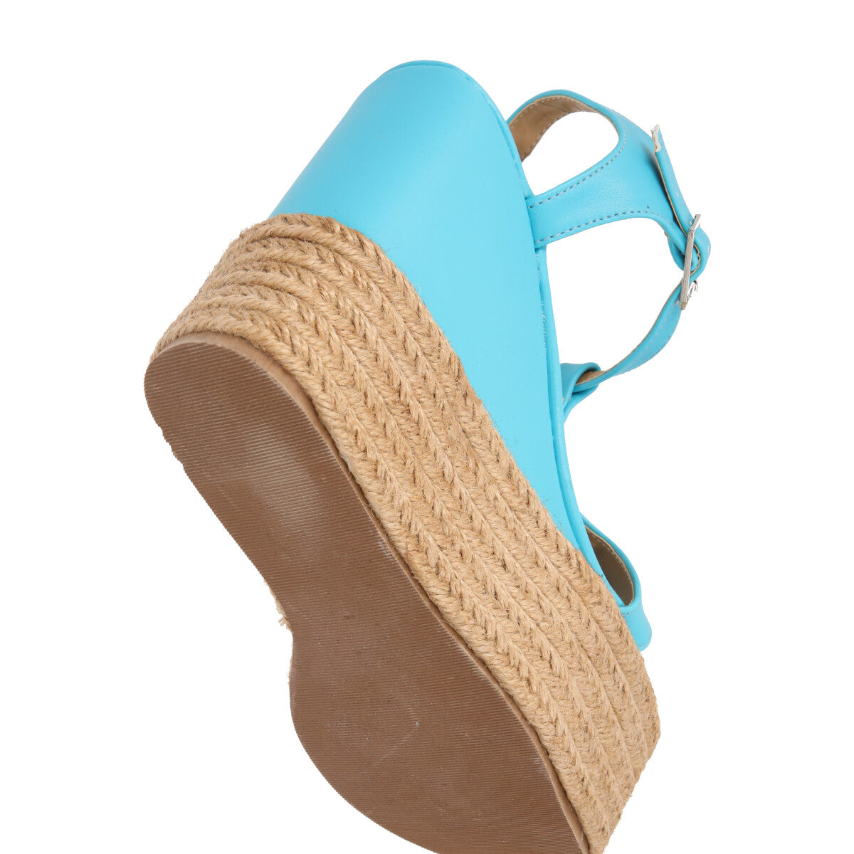 Sandalia de plataforma cuadrada con yute para mujer color cabra leahter turquesa con hebilla ajustable.