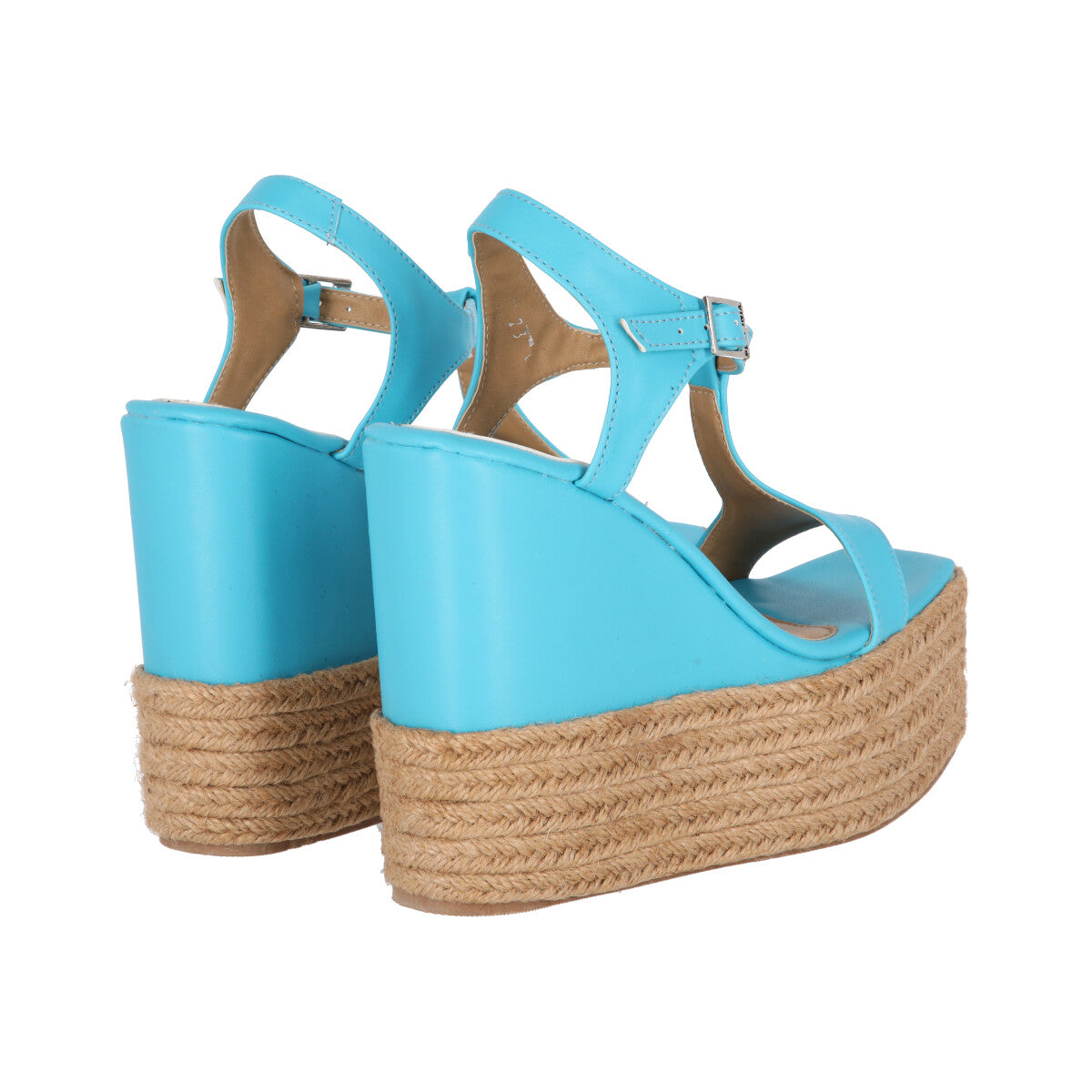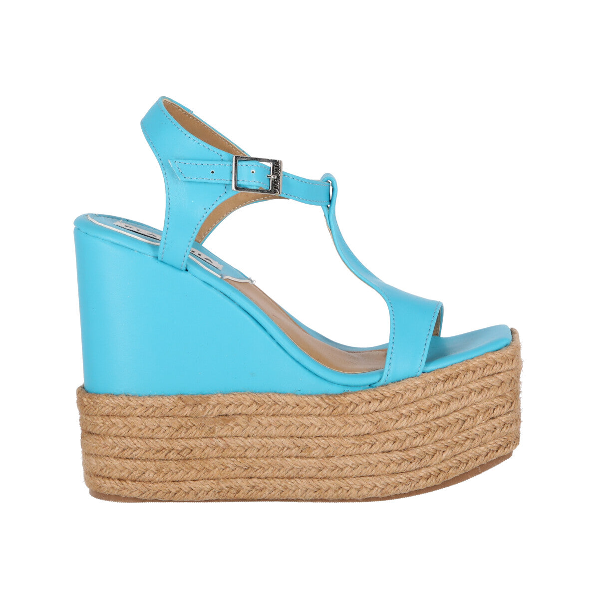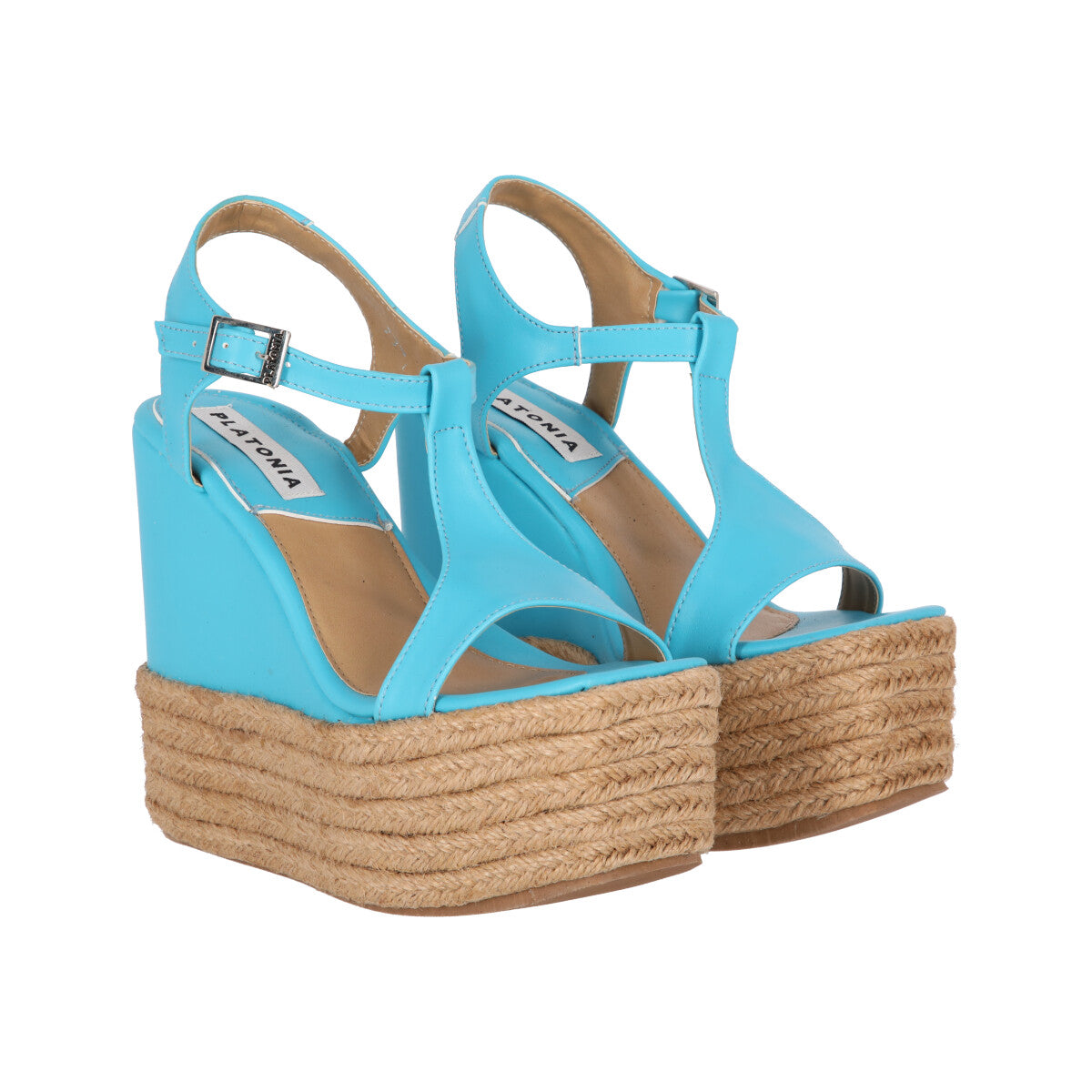 Sandalia de plataforma cuadrada con yute para mujer color cabra leahter turquesa con hebilla ajustable.