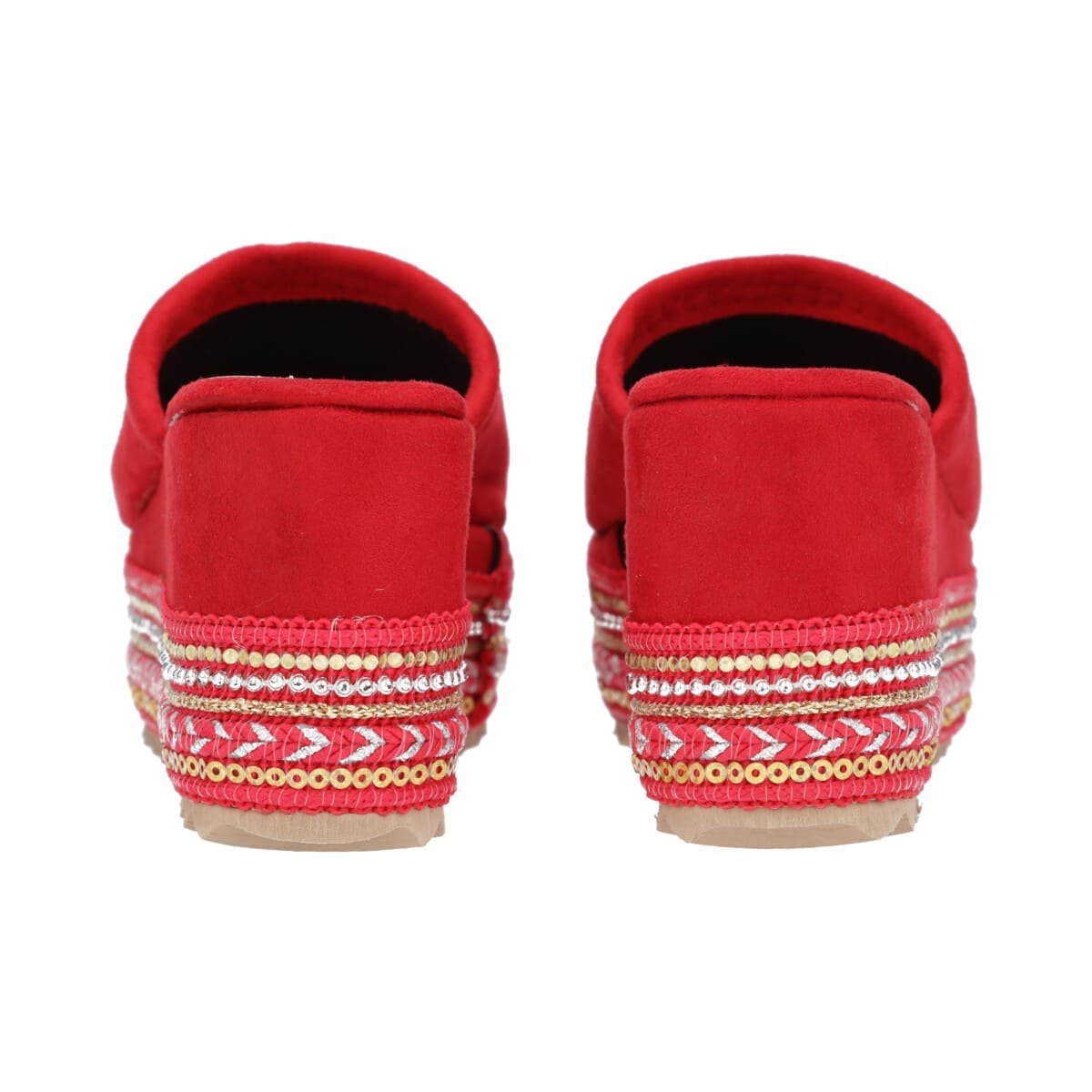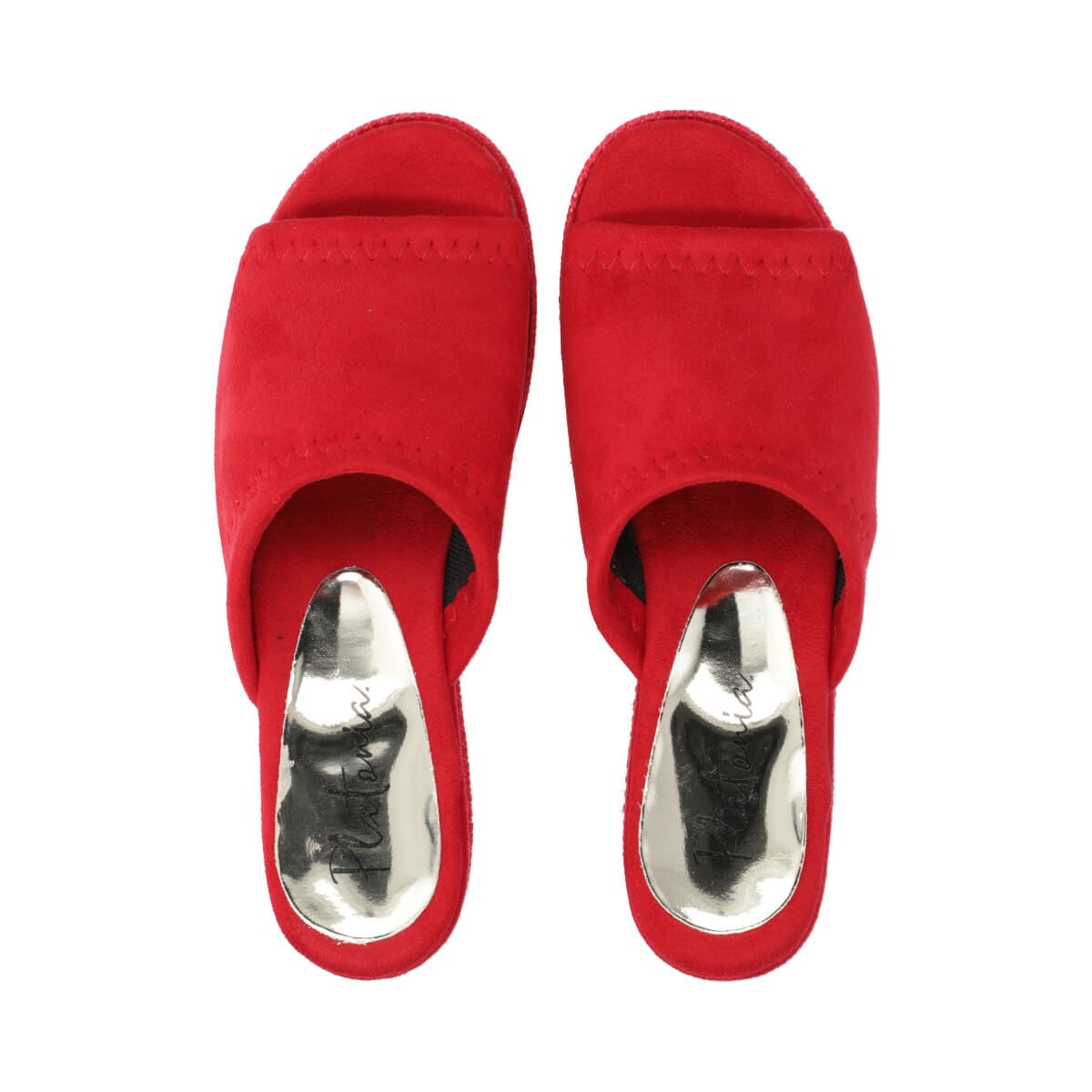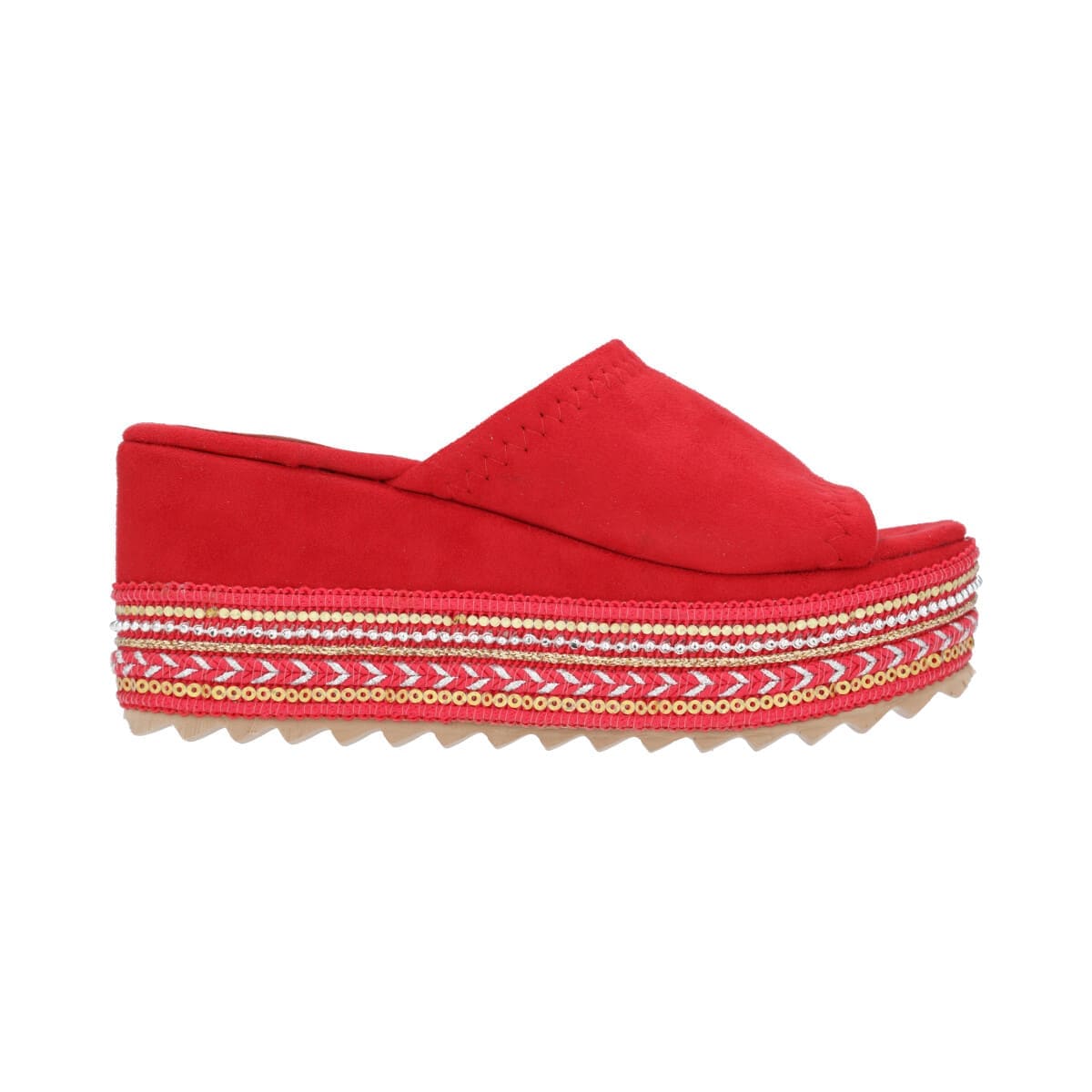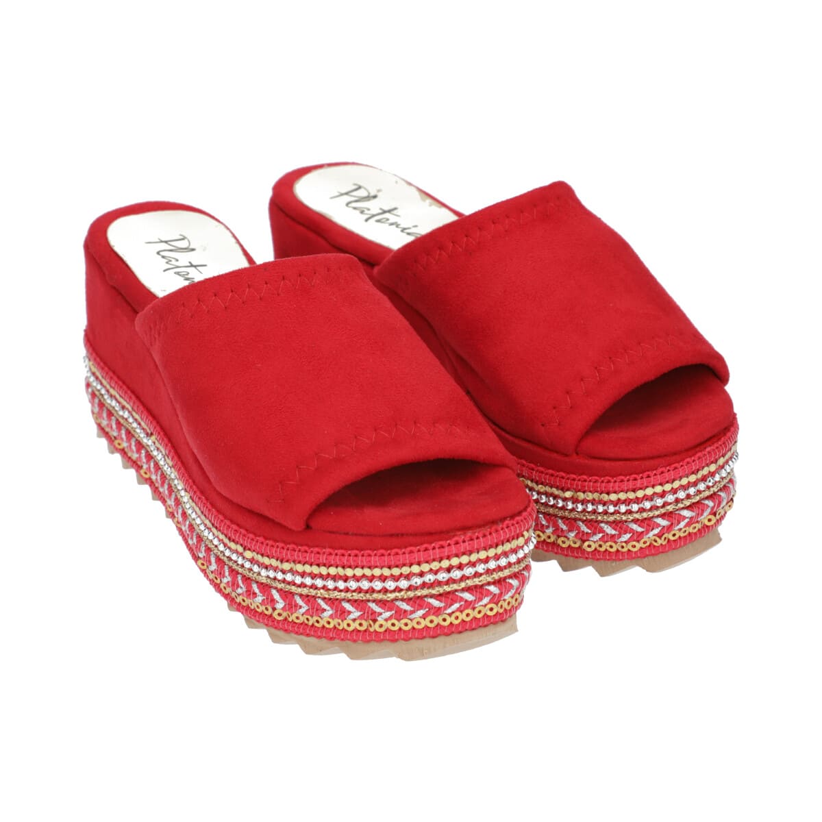 Sandalia de plataforma para mujer color rojo de lycra con aplicaciones en la plataforma.