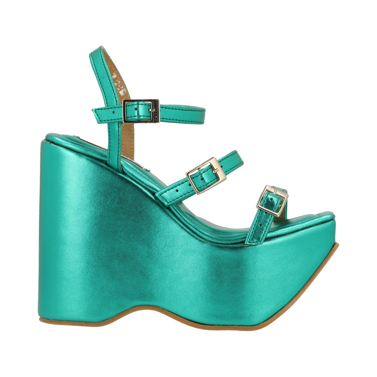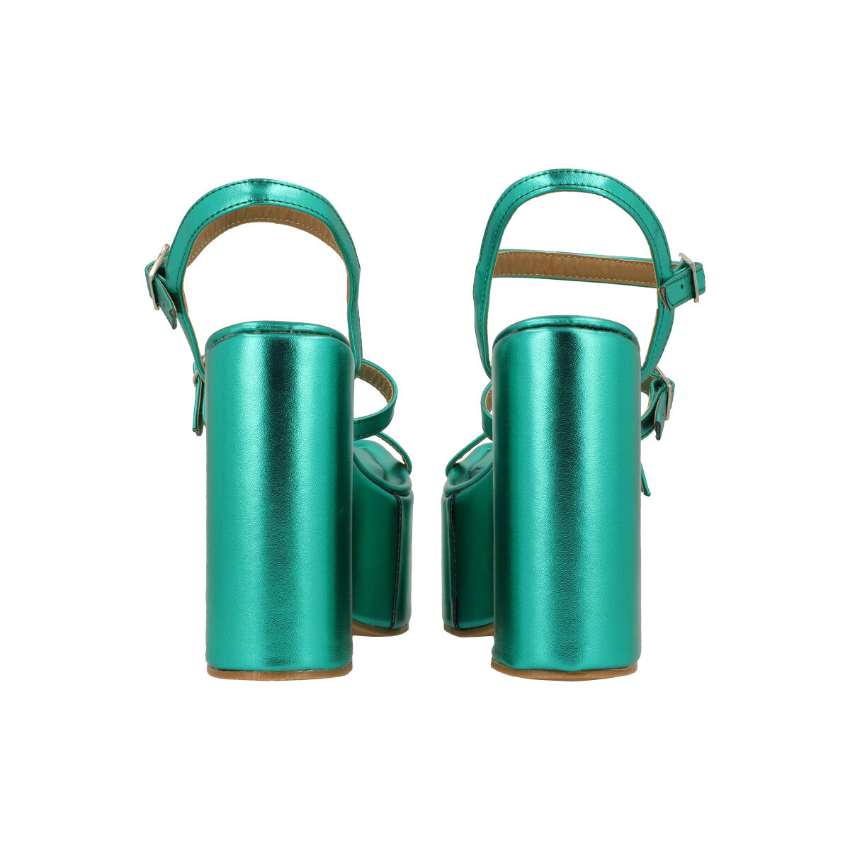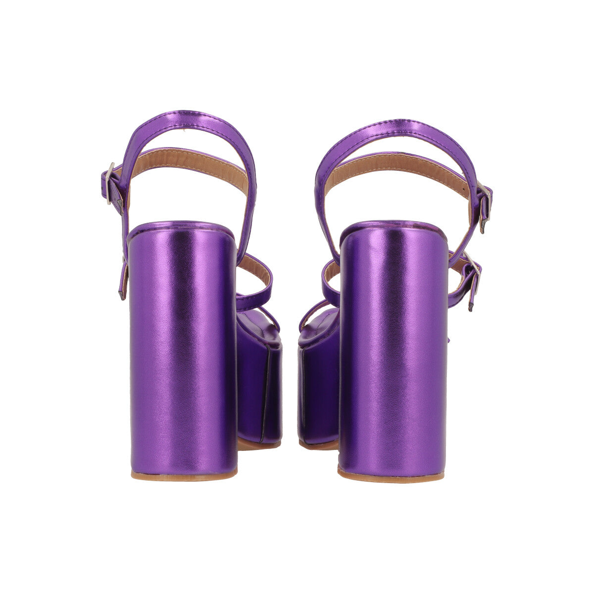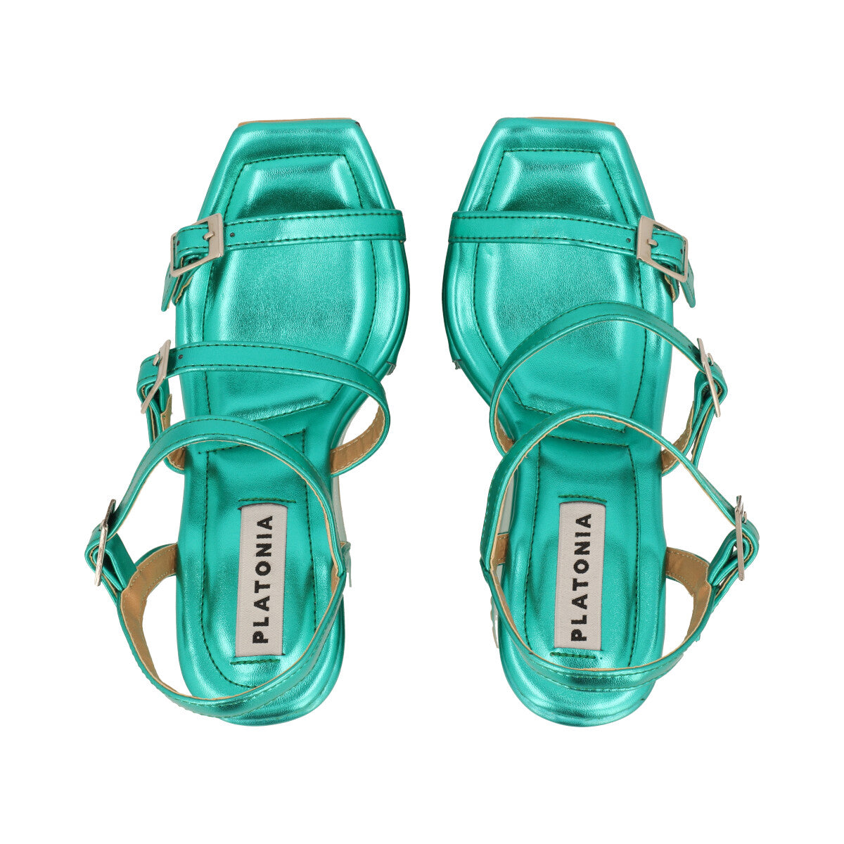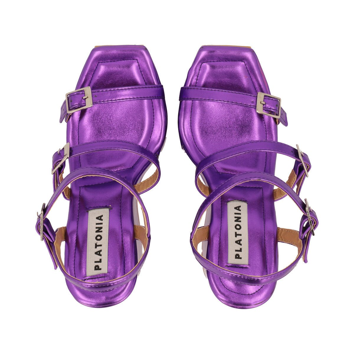 Sandalia de plataforma cuadrada trendy con látigos ajustables con hebillas para mujer napa metálico.