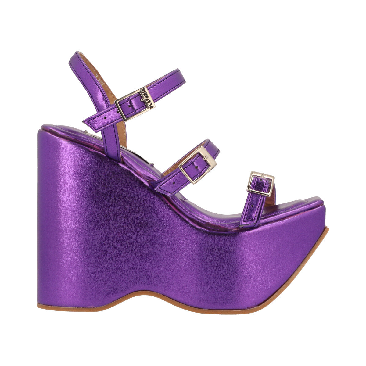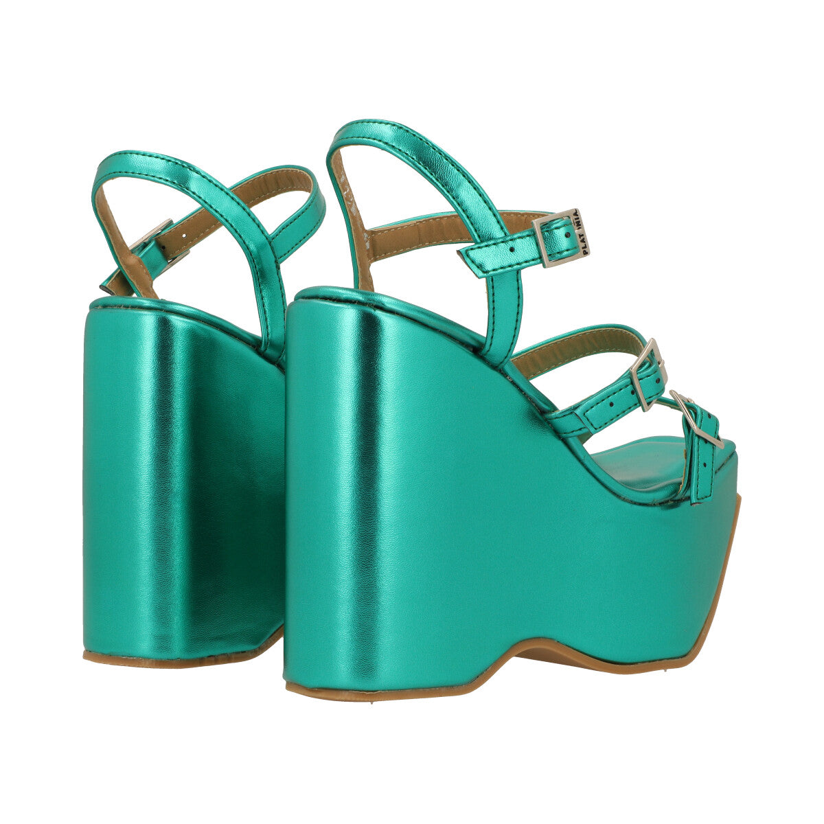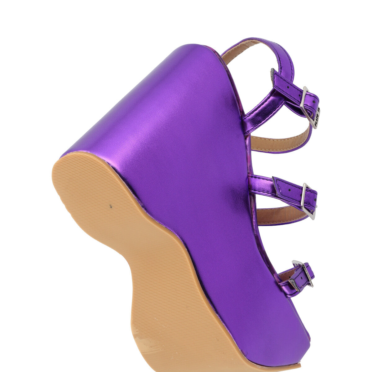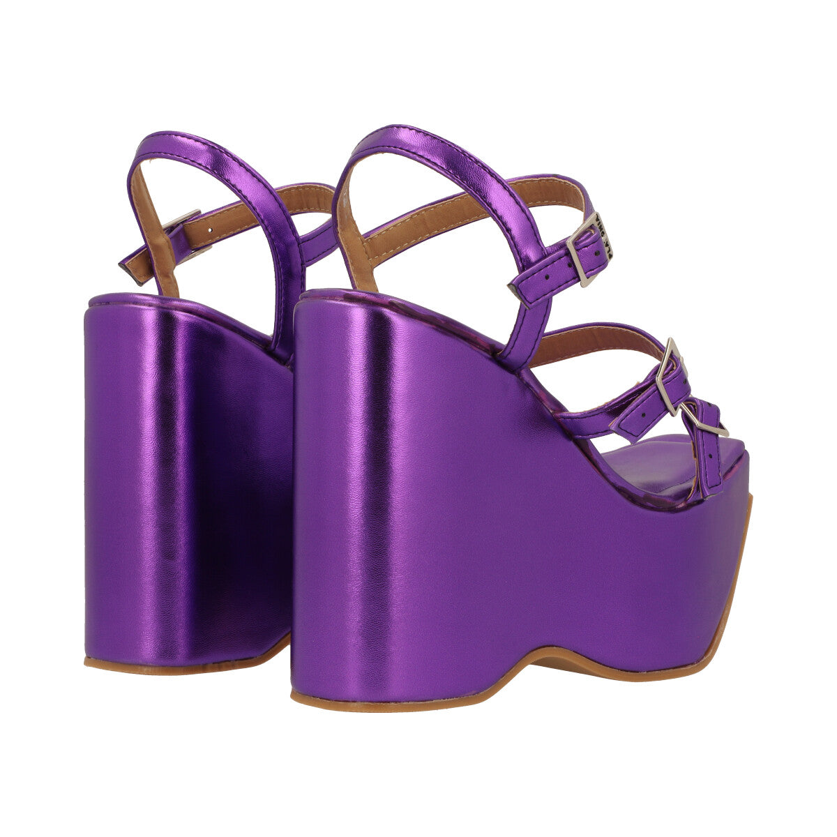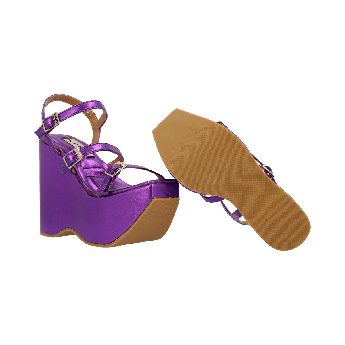 Sandalia de plataforma cuadrada trendy con látigos ajustables con hebillas para mujer napa metálico.