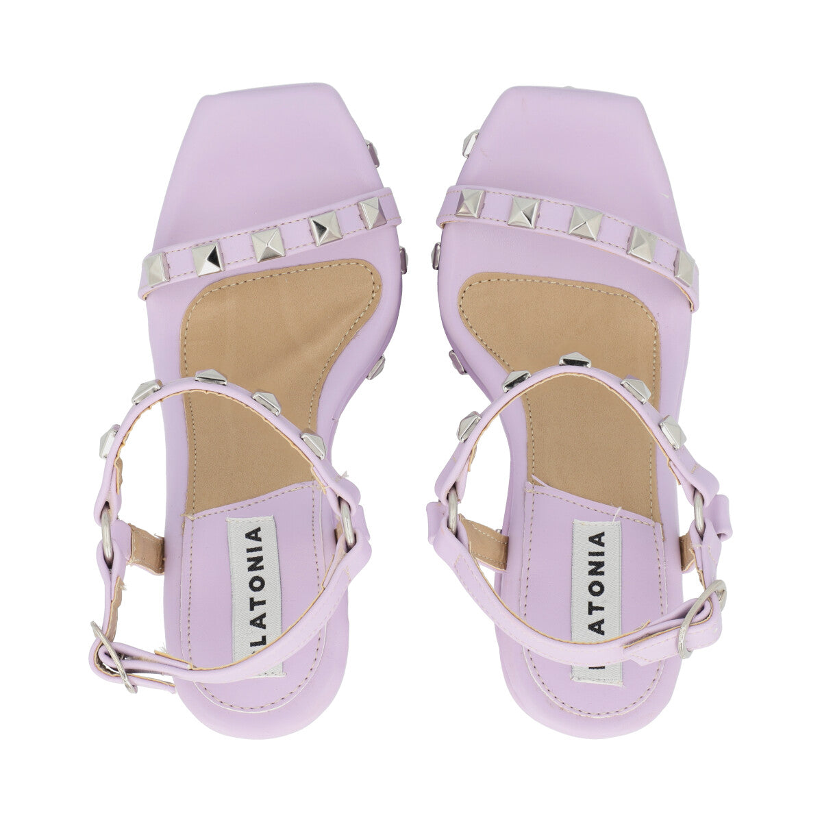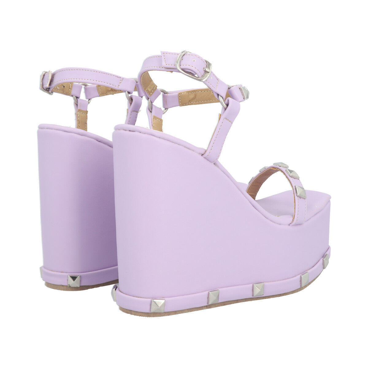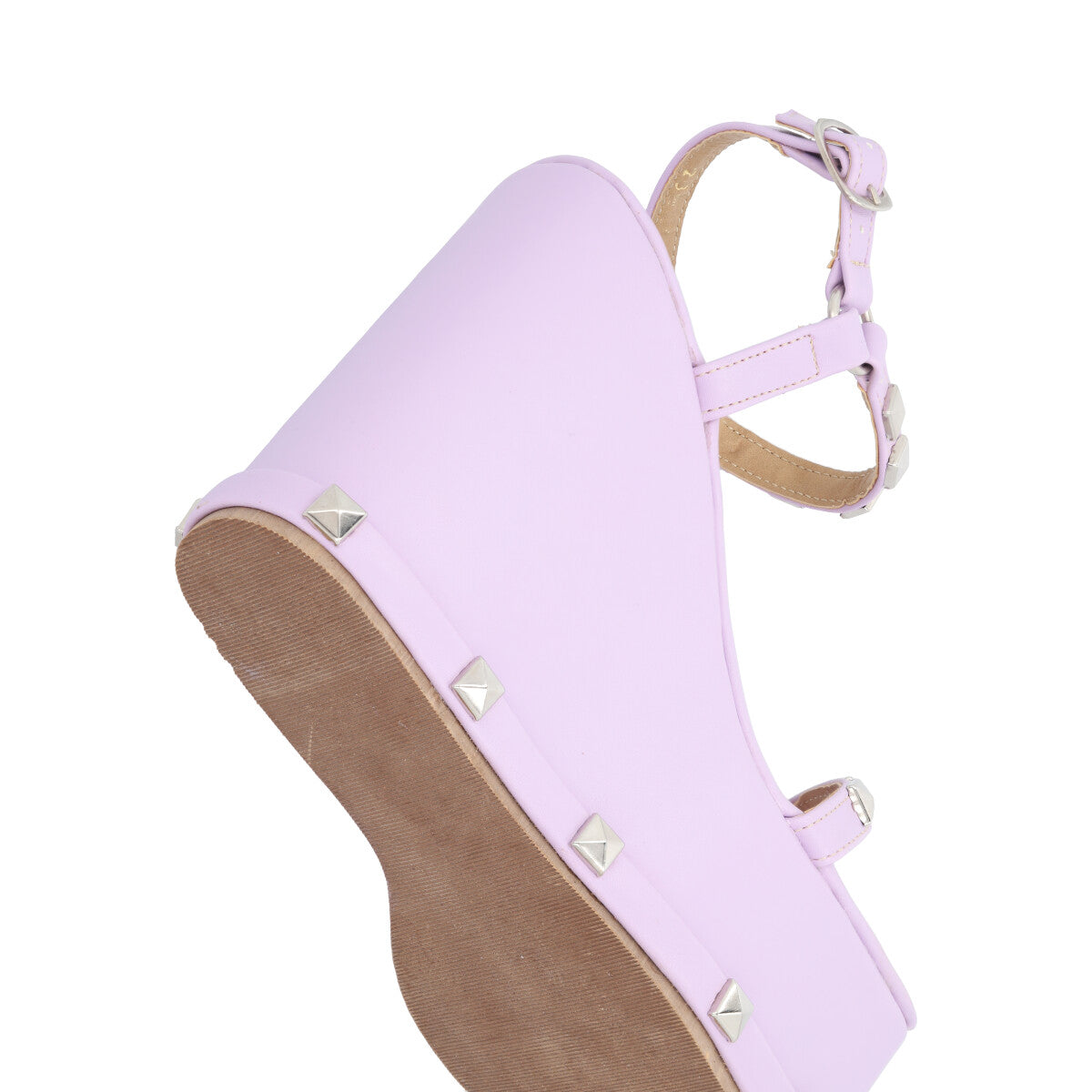 Sandalia de plataforma trendy para mujer color cabra piel sintética lila con hebilla ajustable y estoperoles.
