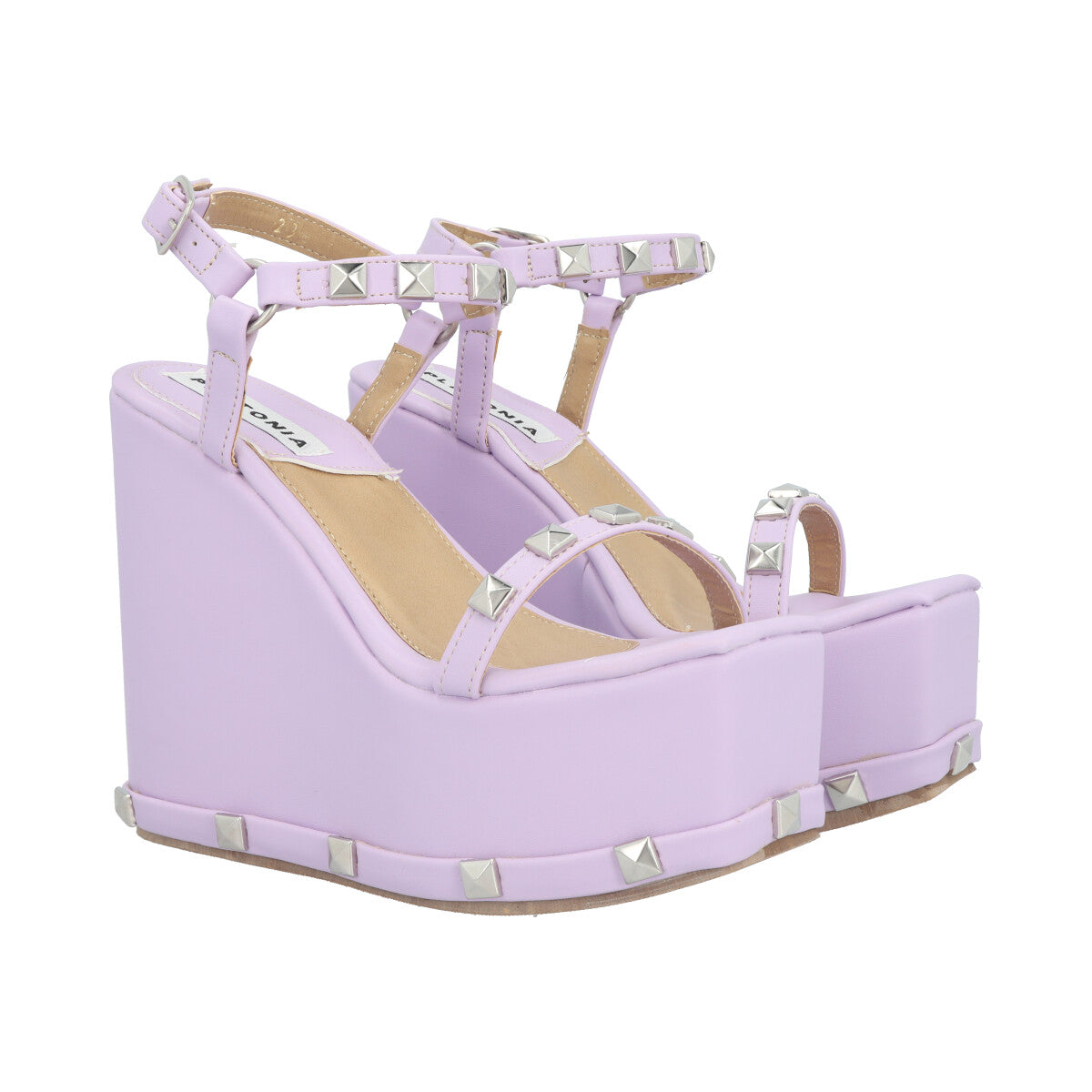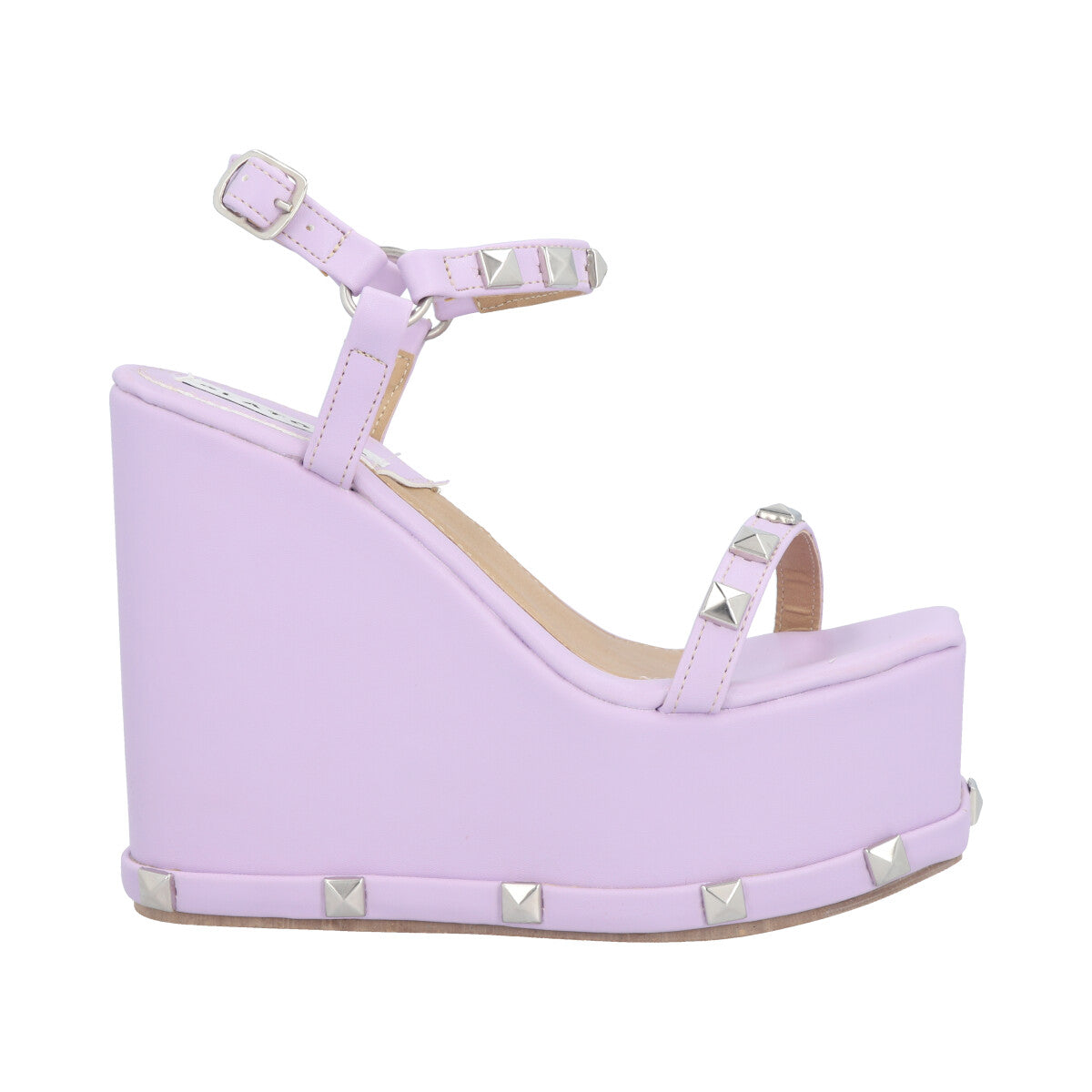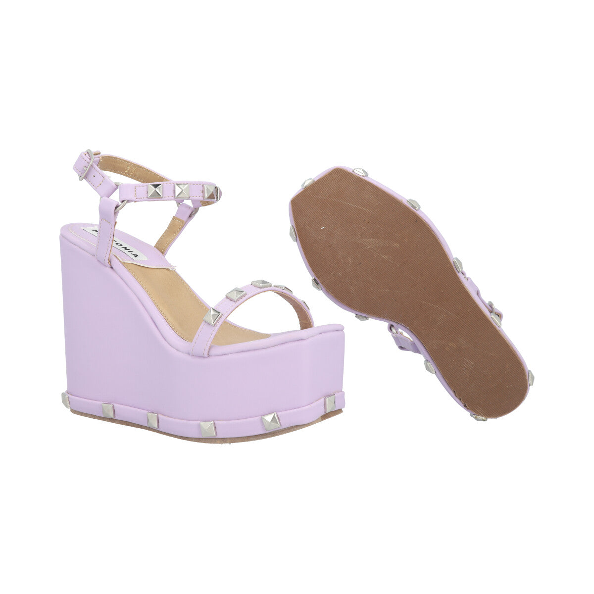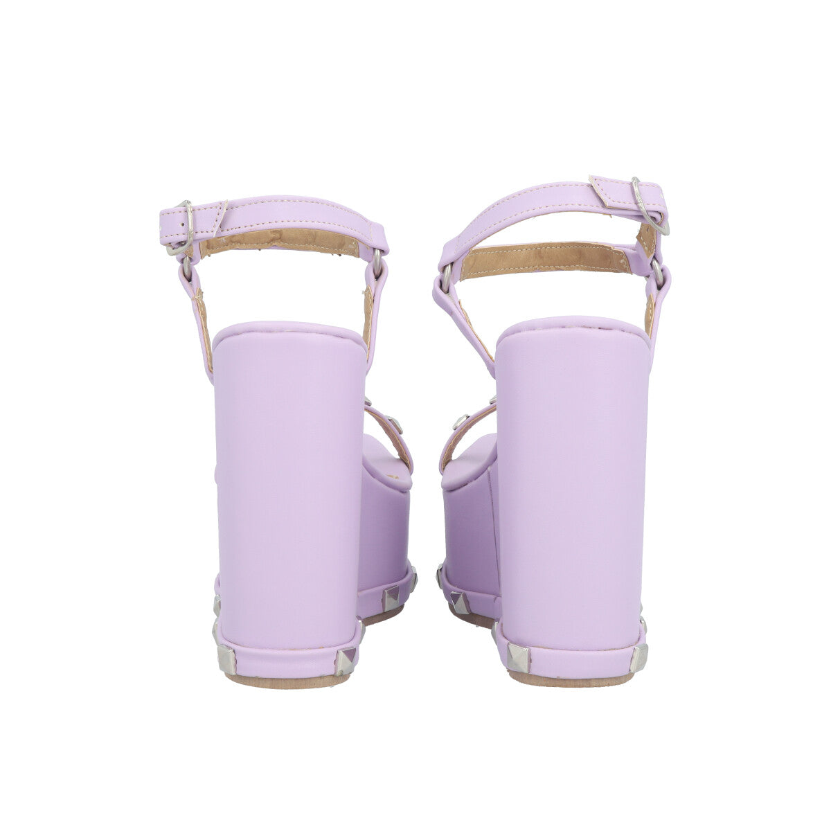 Sandalia de plataforma trendy para mujer color cabra piel sintética lila con hebilla ajustable y estoperoles.