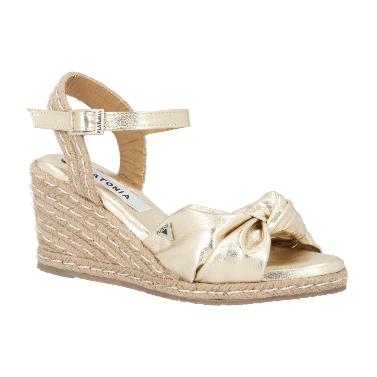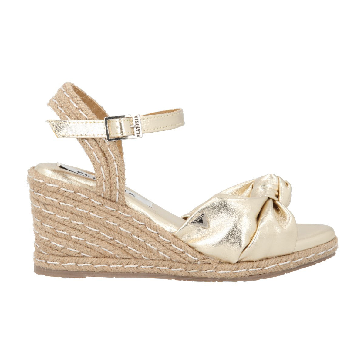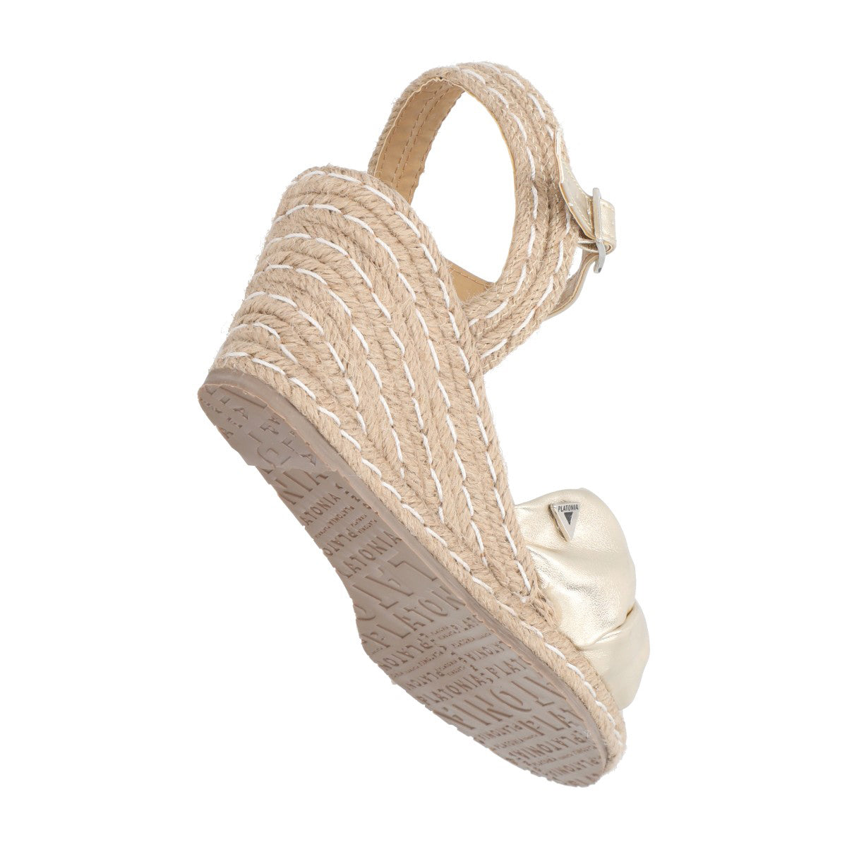 Sandalia de plataforma ultra confort Finlandia con yute natural cabra piel marshella oro para mujer con ajuste de látigo.