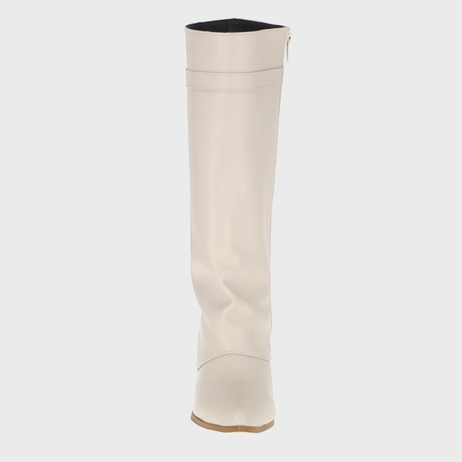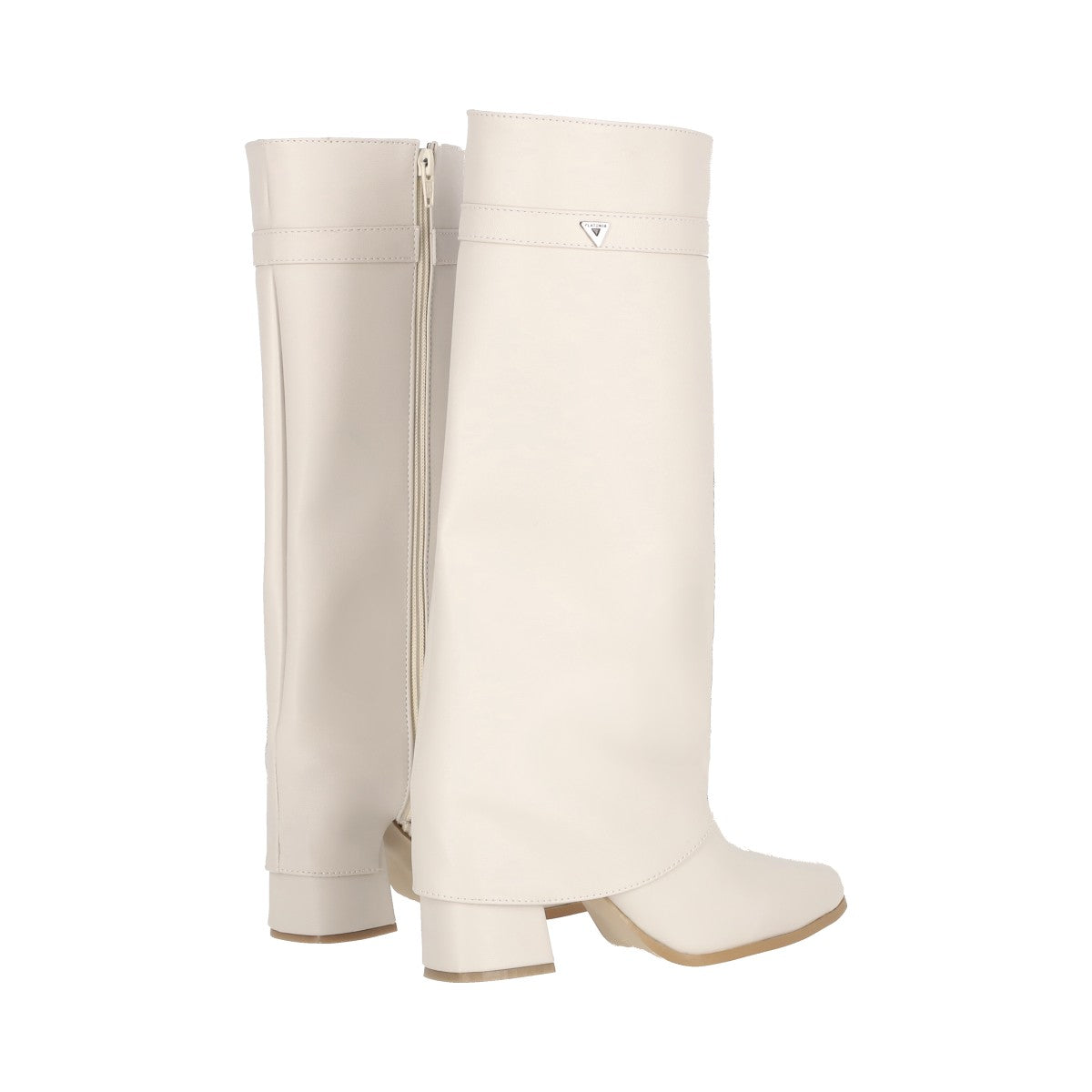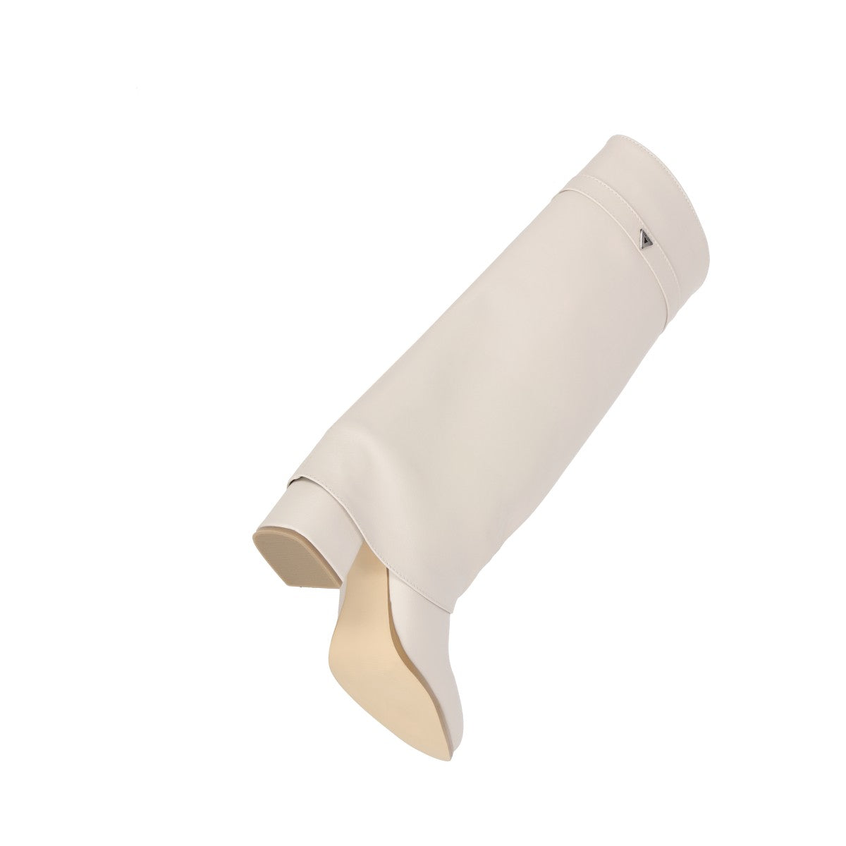 Bota puntal de tacón larga maxi para mujer de material latte piel sintética con cierre reforzado lateral, altura hasta abajo de la rodilla.