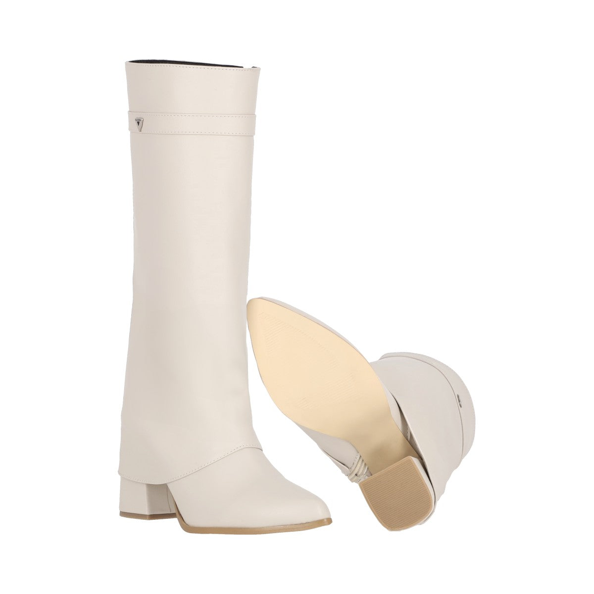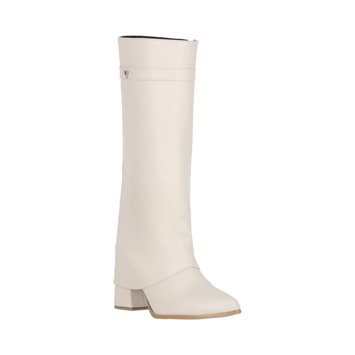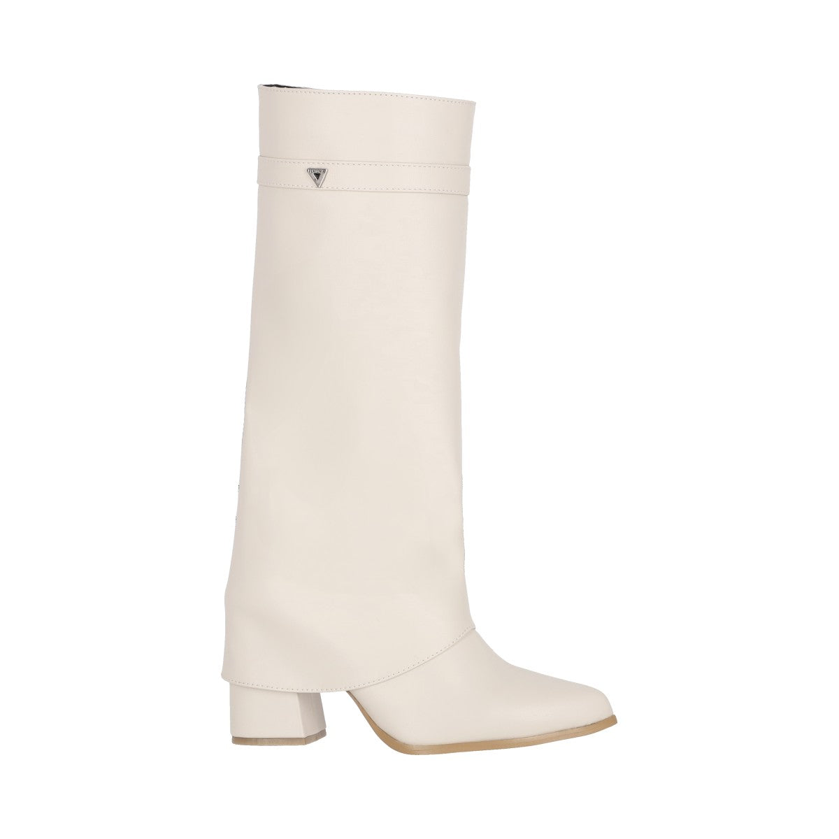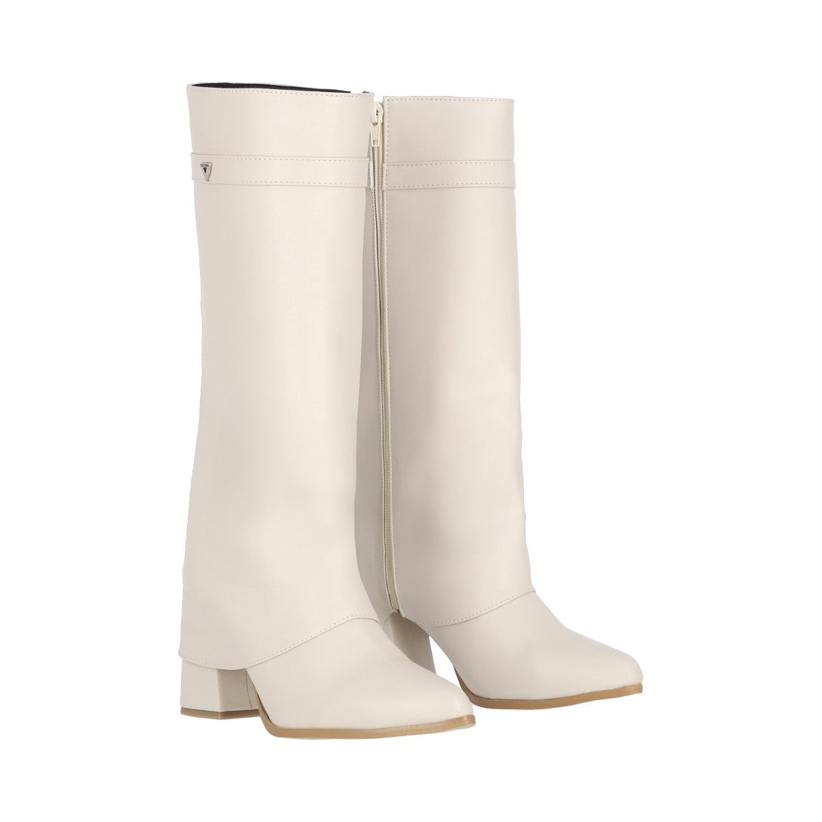 Bota puntal de tacón larga maxi para mujer de material latte piel sintética con cierre reforzado lateral, altura hasta abajo de la rodilla.