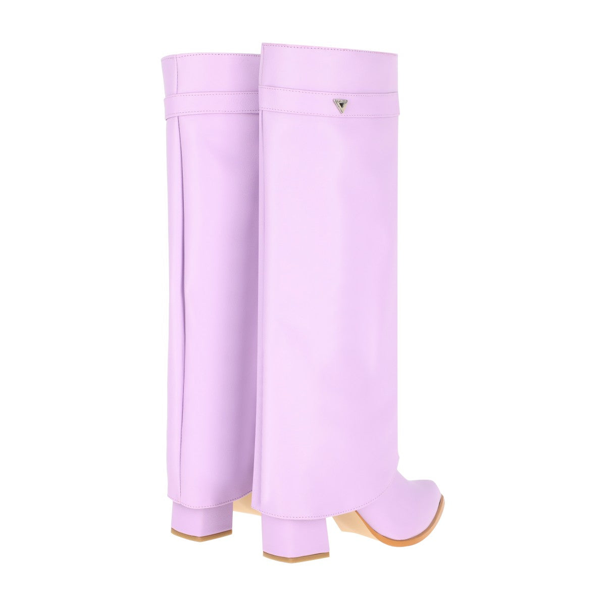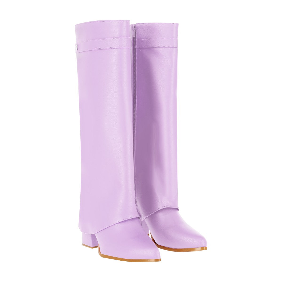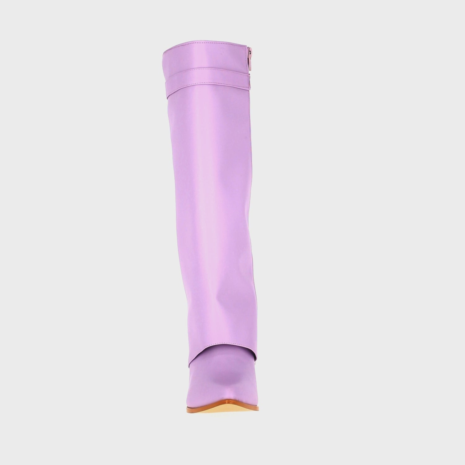 Bota puntal de tacón larga maxi para mujer de material lavanda piel sintética con cierre reforzado lateral, altura hasta abajo de la rodilla.