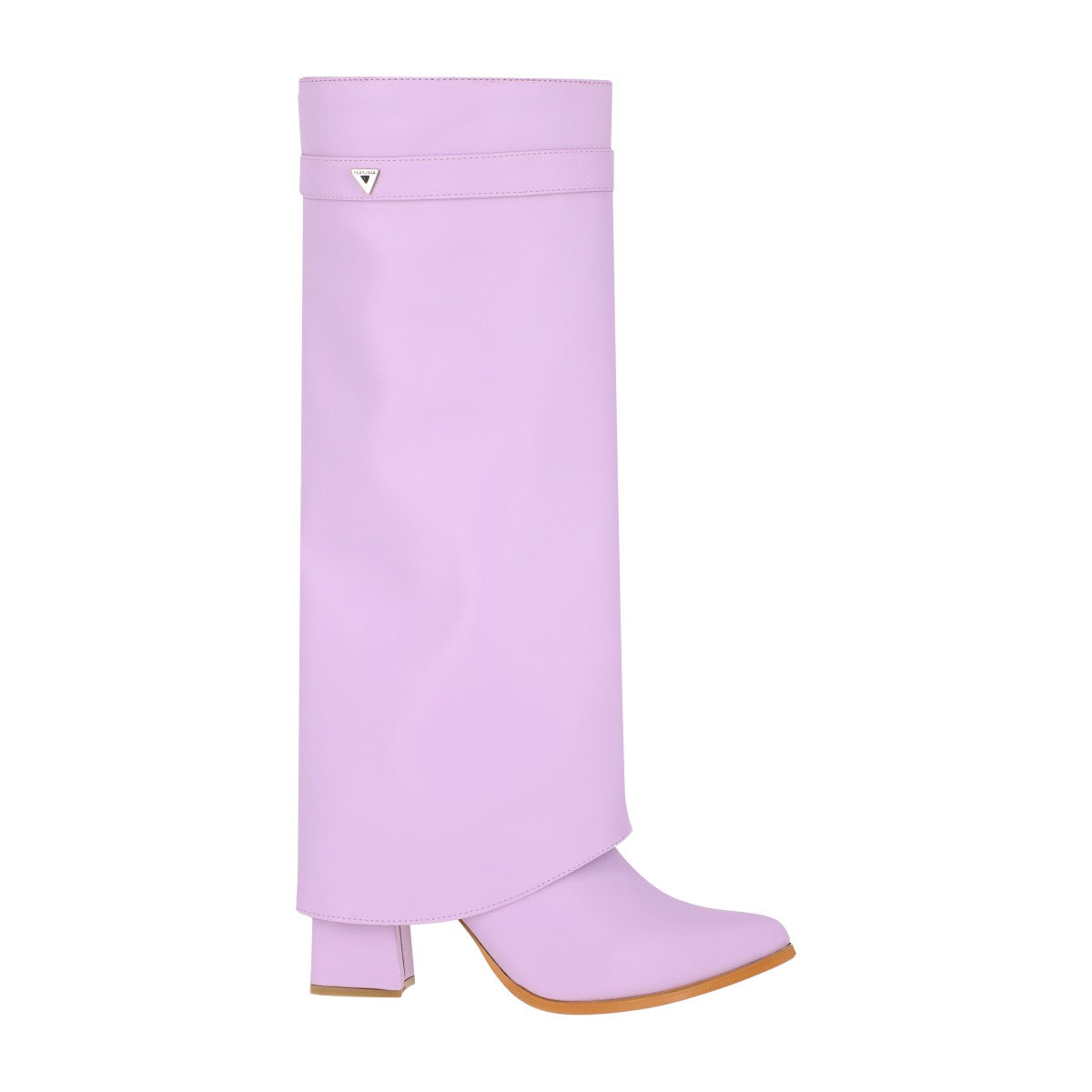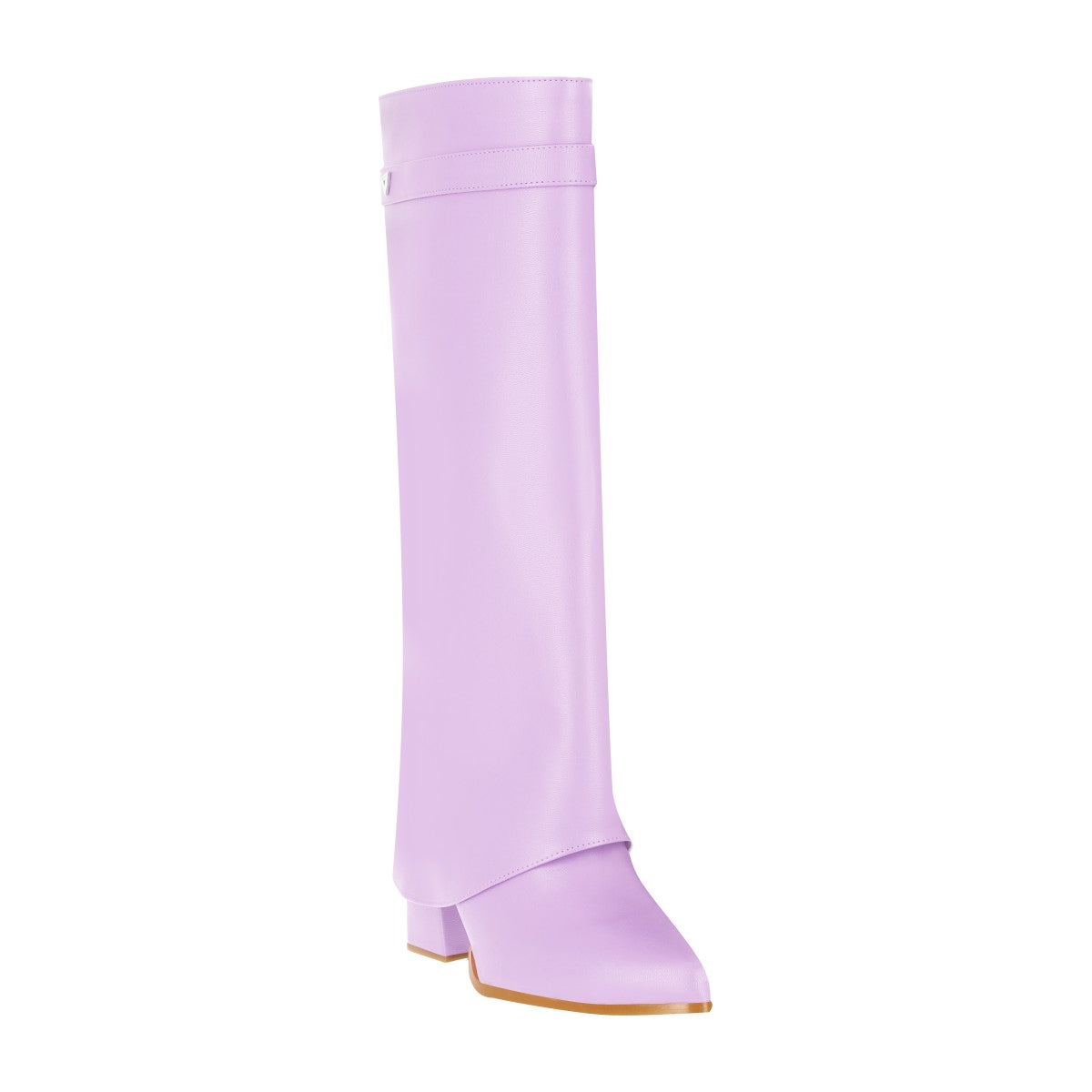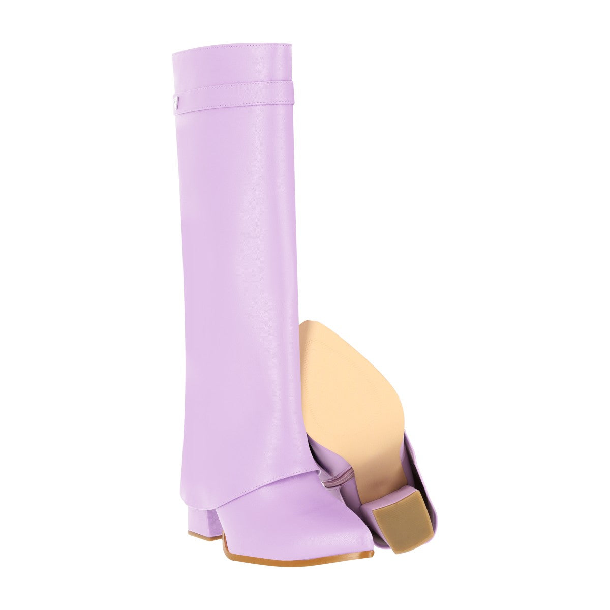 Bota puntal de tacón larga maxi para mujer de material lavanda piel sintética con cierre reforzado lateral, altura hasta abajo de la rodilla.