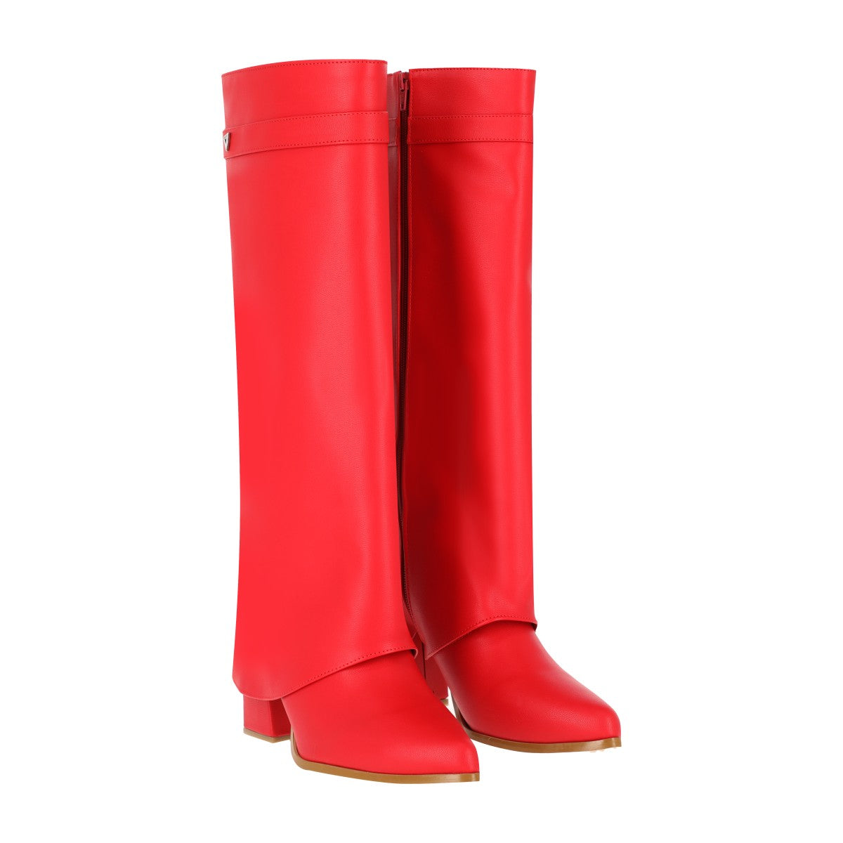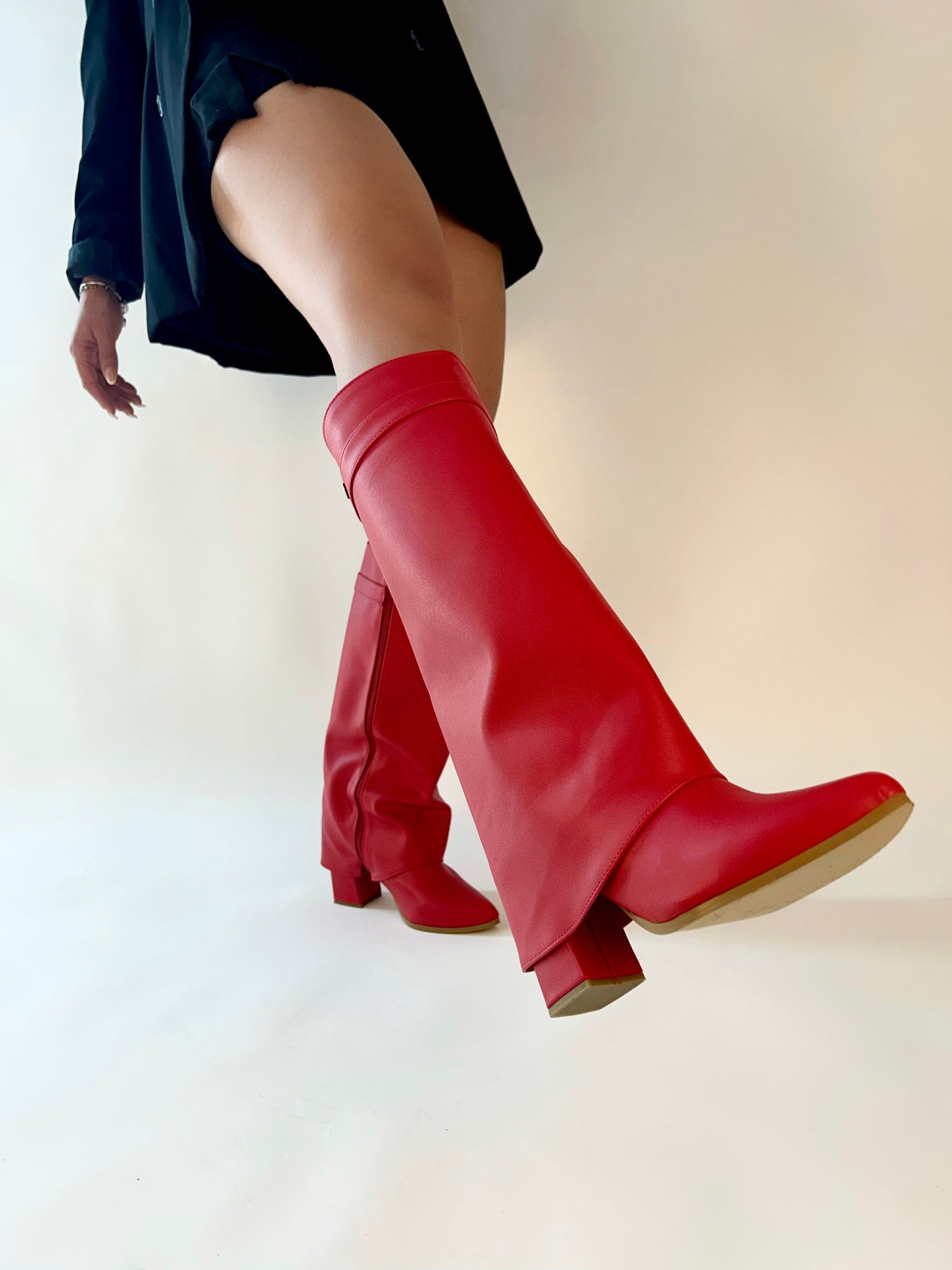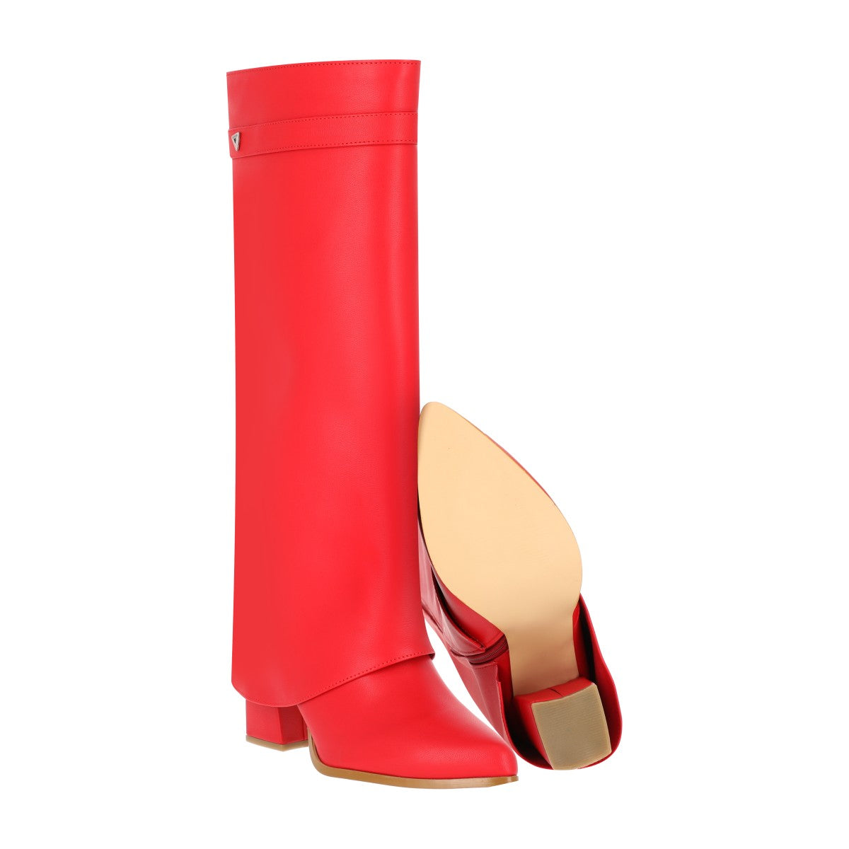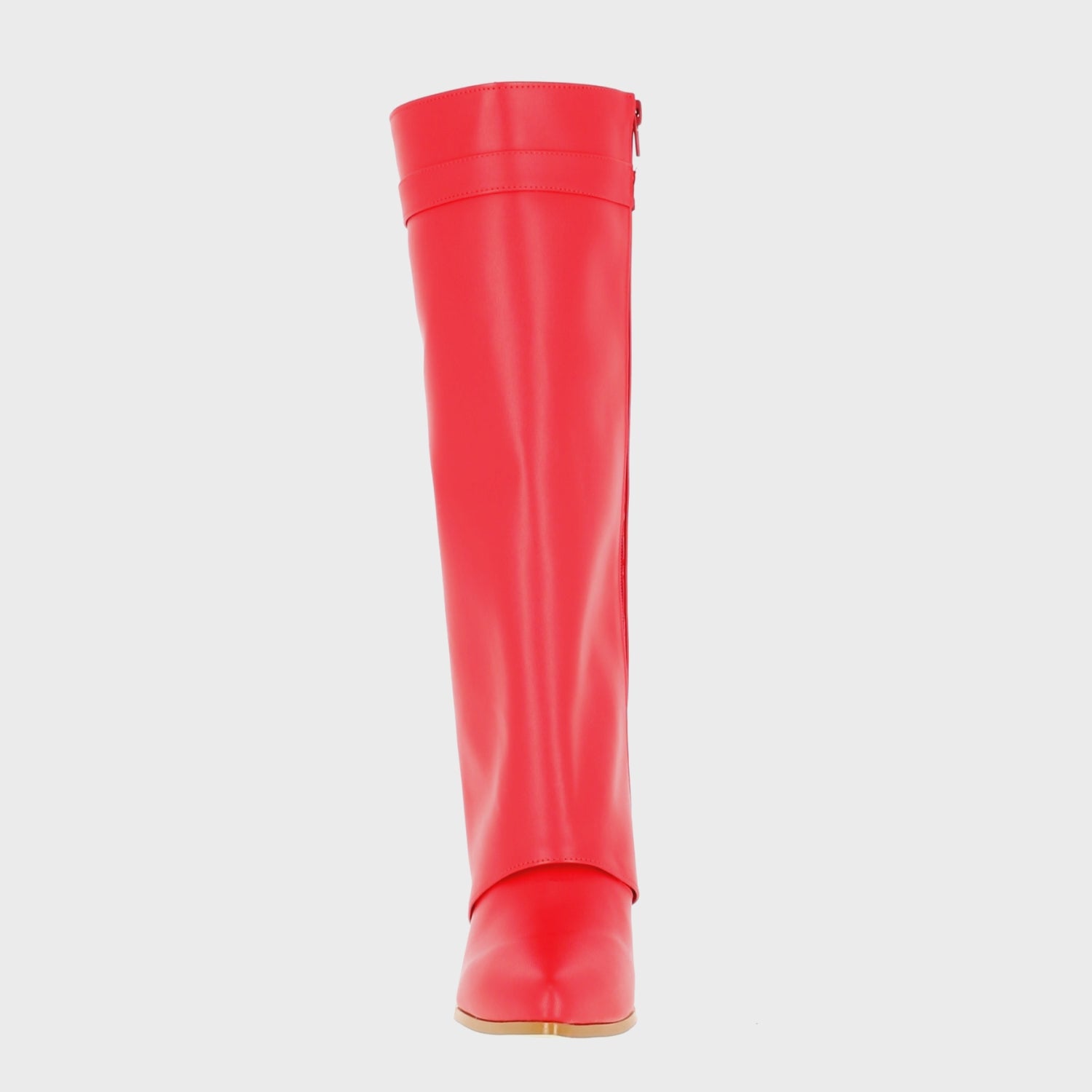Bota puntal de tacón larga maxi para mujer de material rojo piel sintética con cierre reforzado lateral, altura hasta abajo de la rodilla.