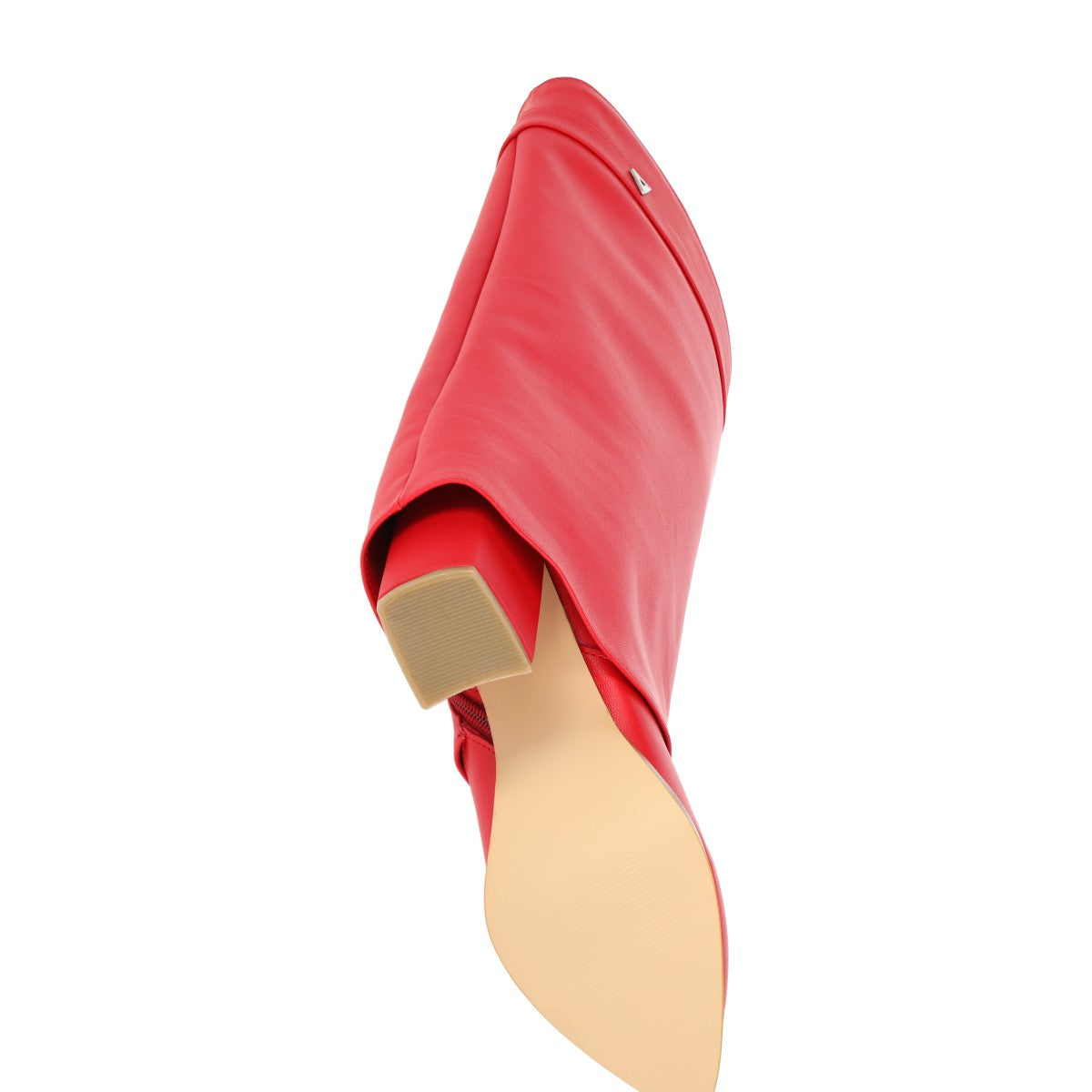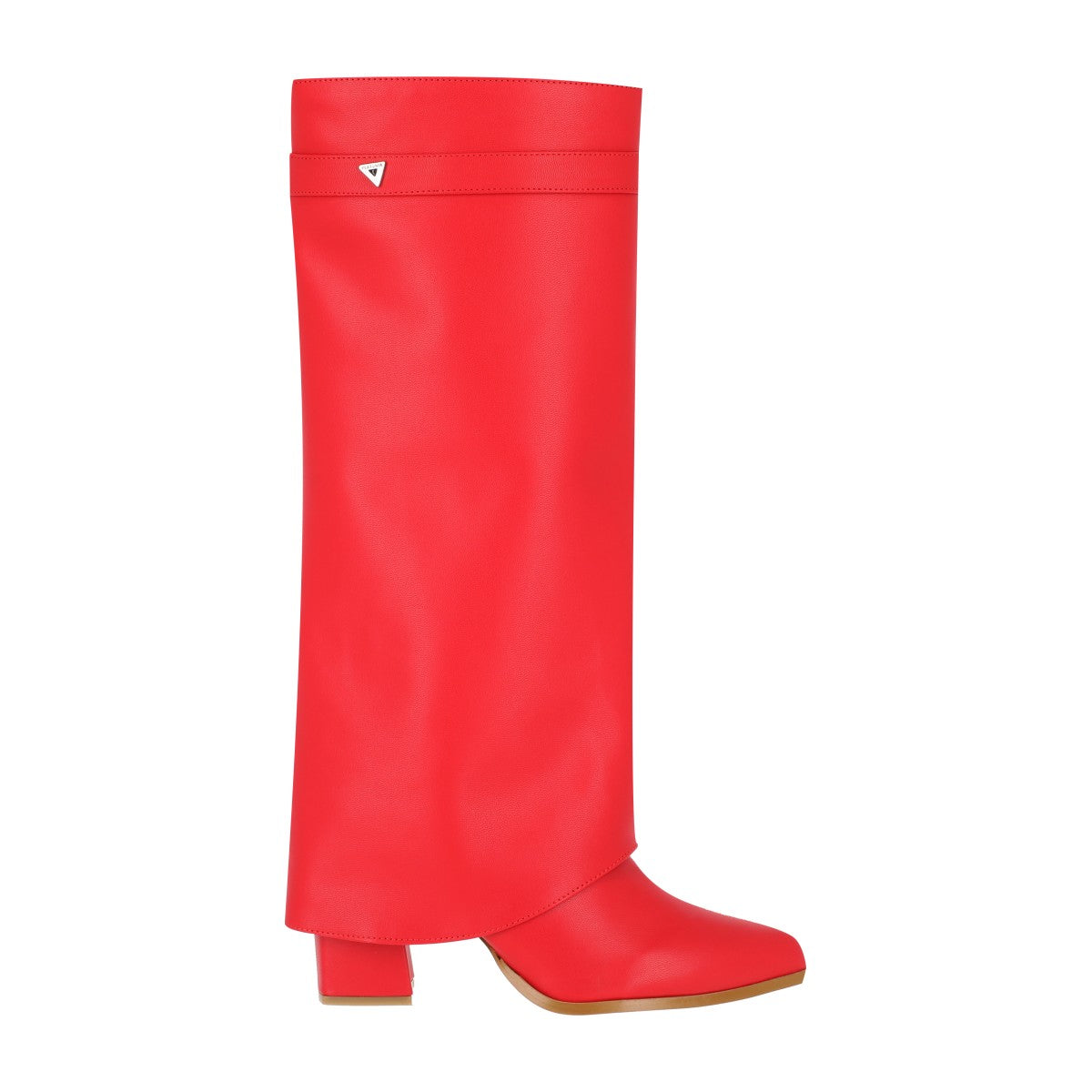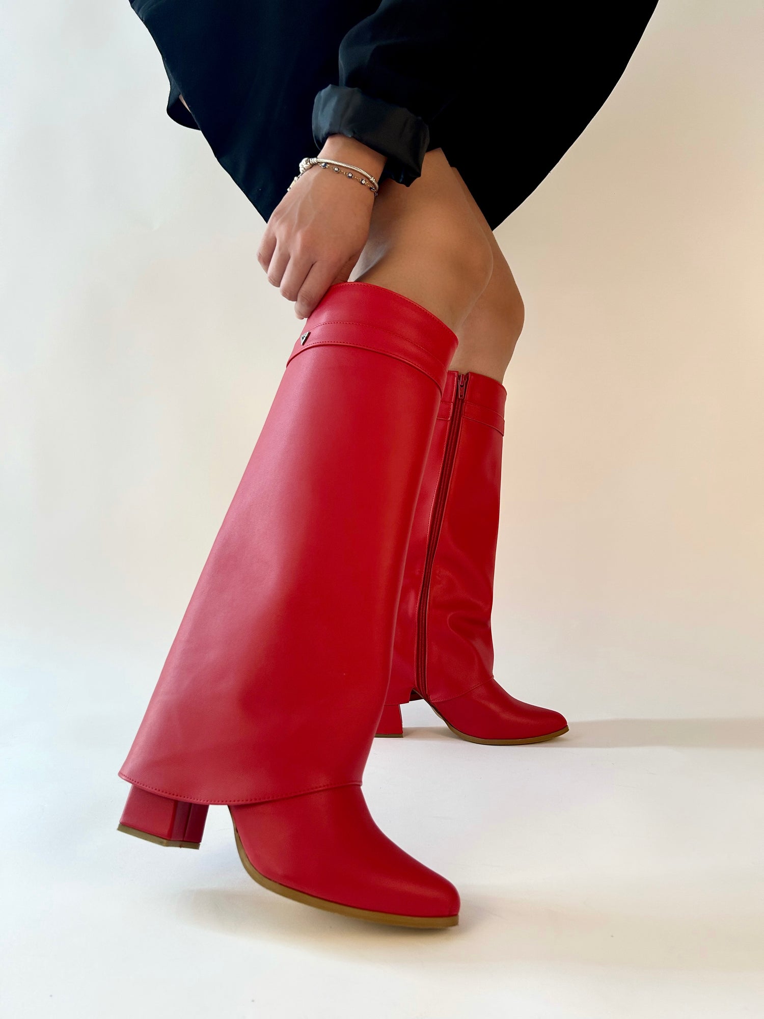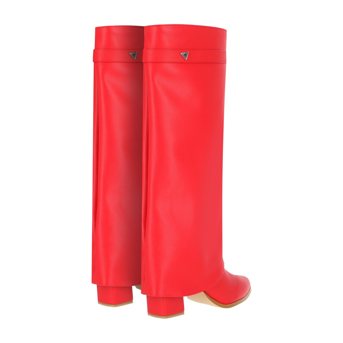 Bota puntal de tacón larga maxi para mujer de material rojo piel sintética con cierre reforzado lateral, altura hasta abajo de la rodilla.