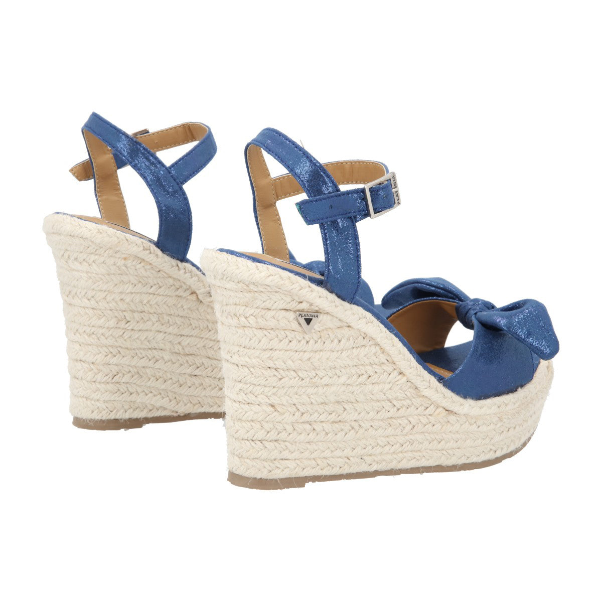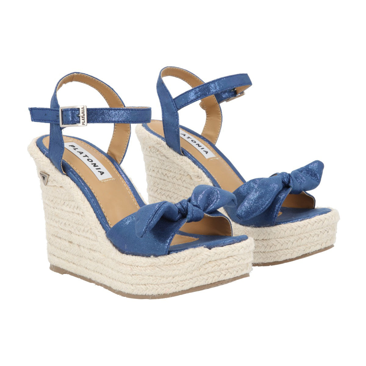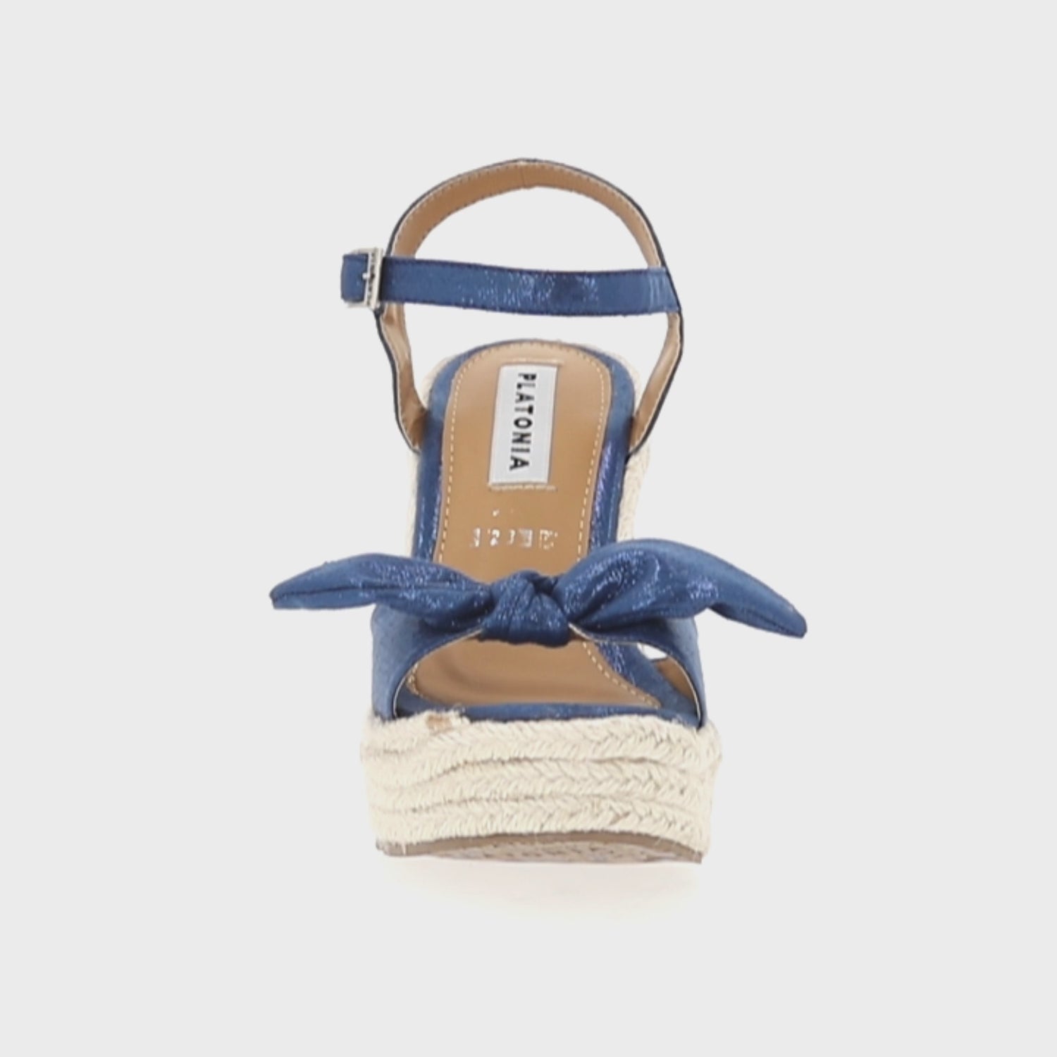 Sandalia de plataforma con yute natural cabra piel marsella azul marino para mujer con látigo ajustable estándar.