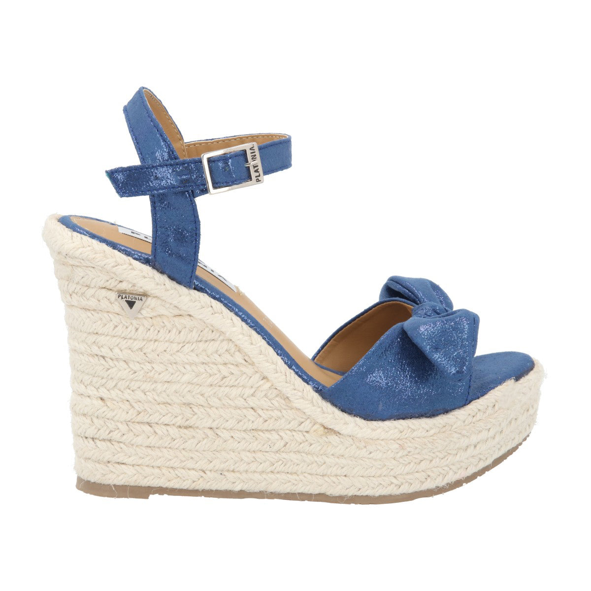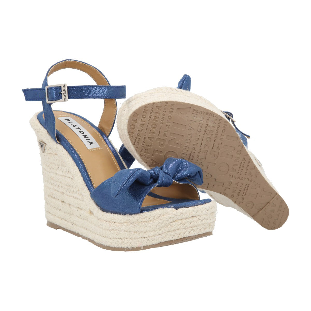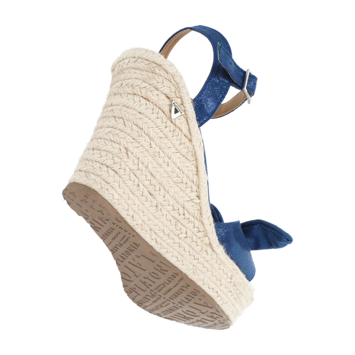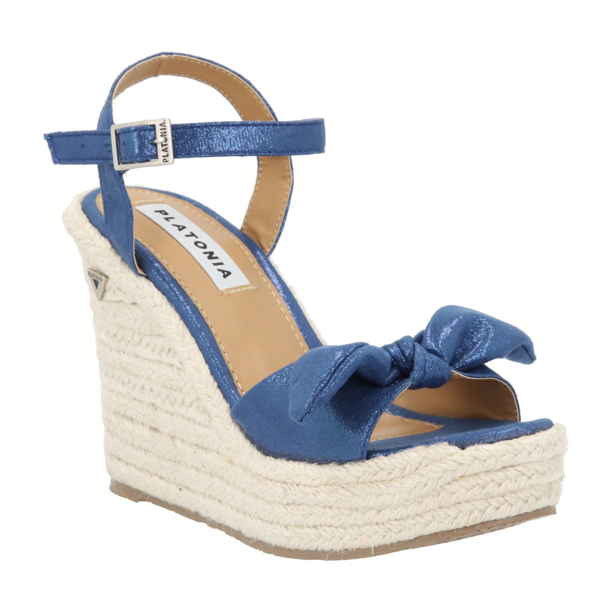 Sandalia de plataforma con yute natural cabra piel marsella azul marino para mujer con látigo ajustable estándar.