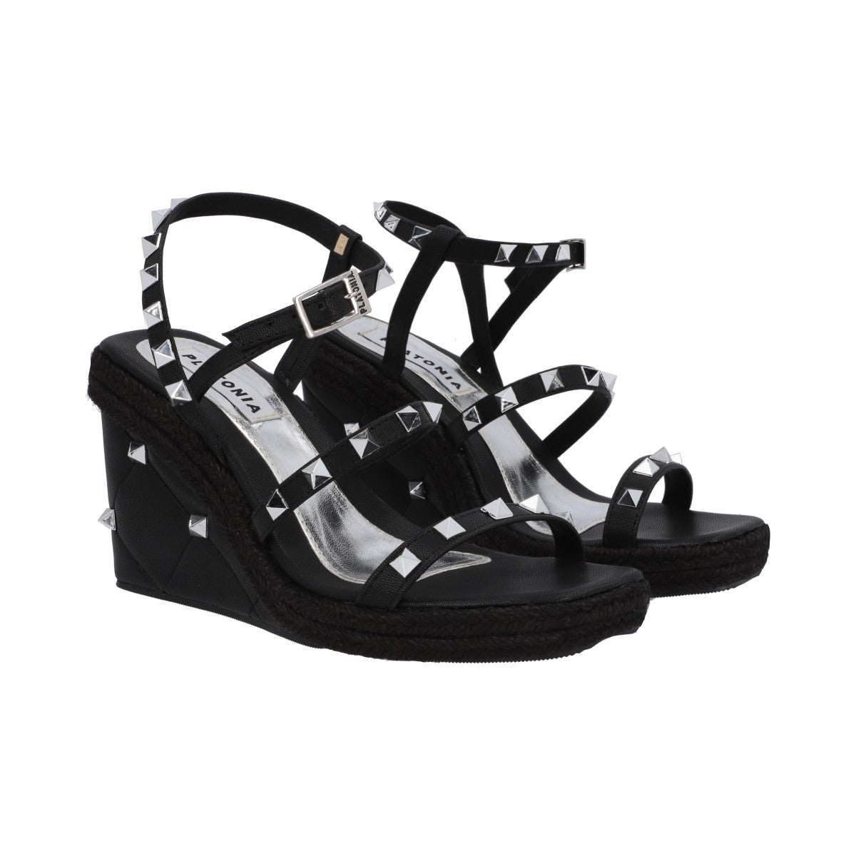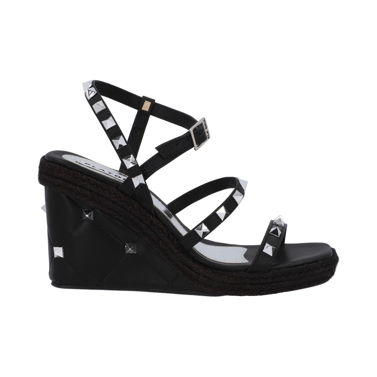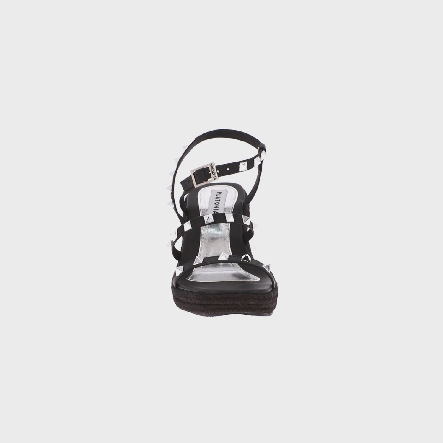 Sandalia de plataforma cuadrada con estoperoles y napa metálica negro con ajuste de látigo y hebilla metálica.