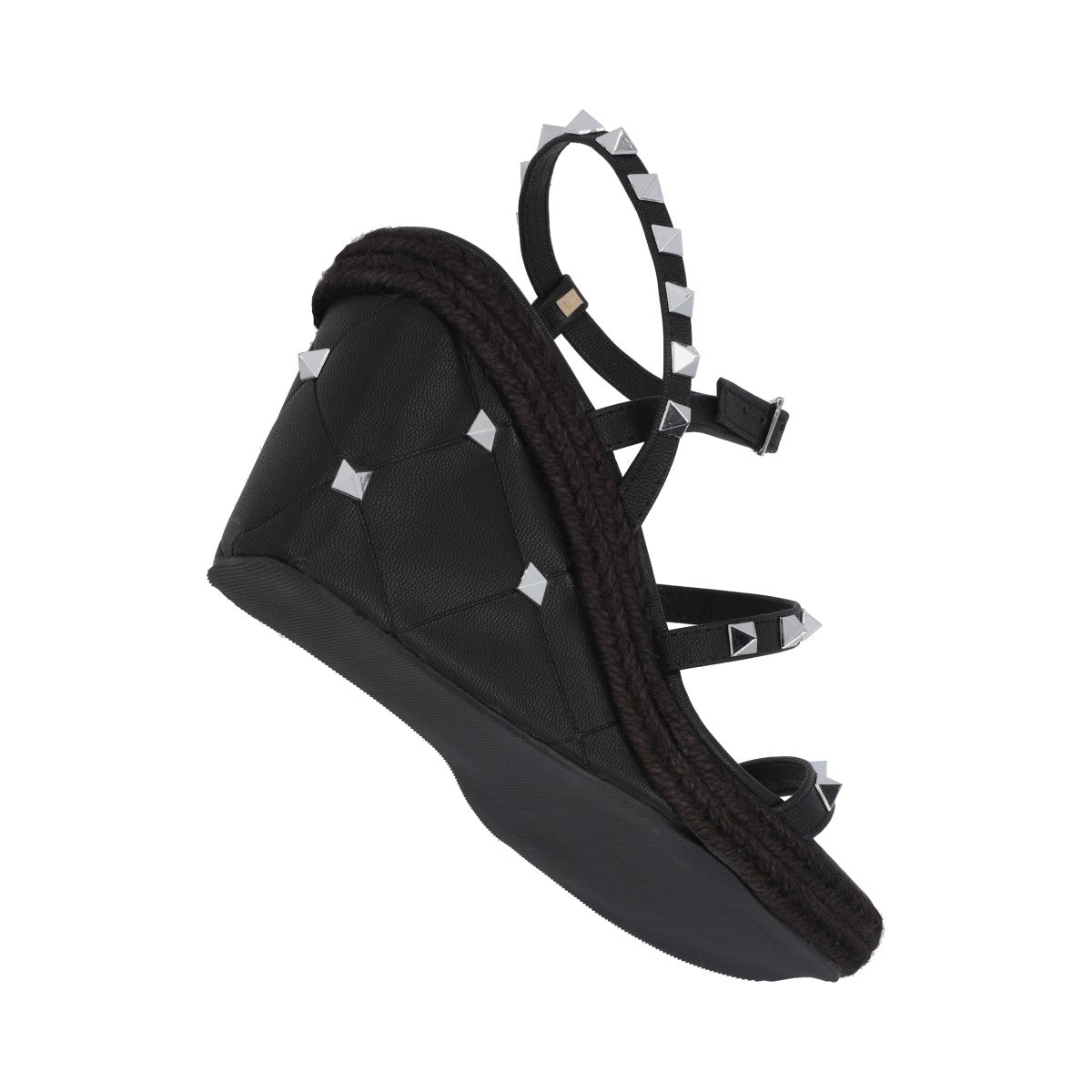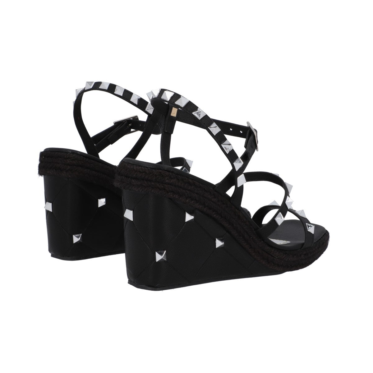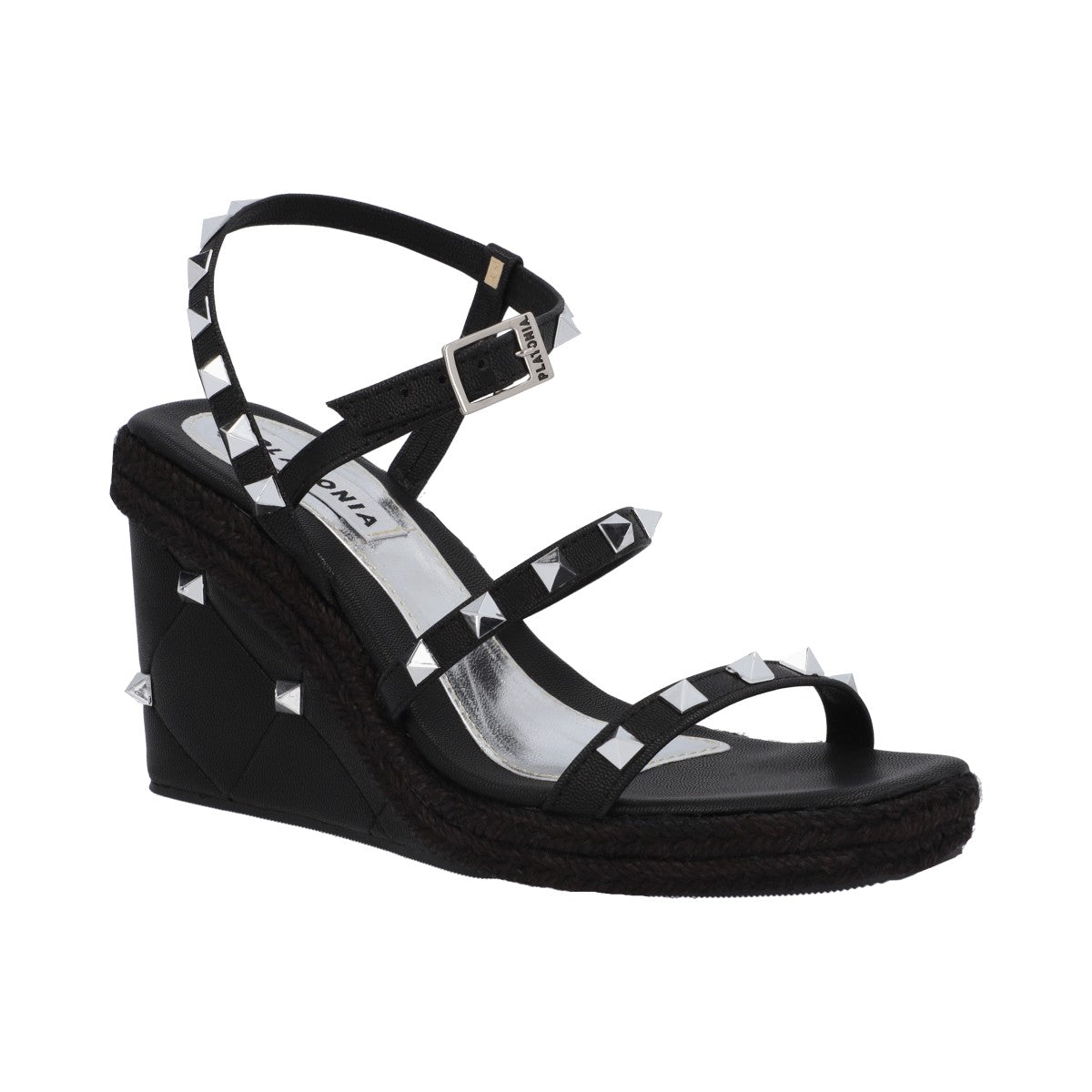 Sandalia de plataforma cuadrada con estoperoles y napa metálica negro con ajuste de látigo y hebilla metálica.