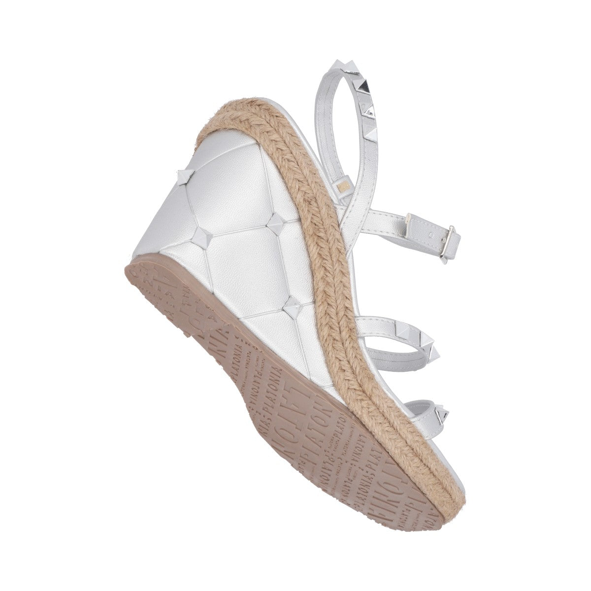 Sandalia de plataforma cuadrada con estoperoles y napa metálica plata con ajuste de látigo y hebilla metálica.