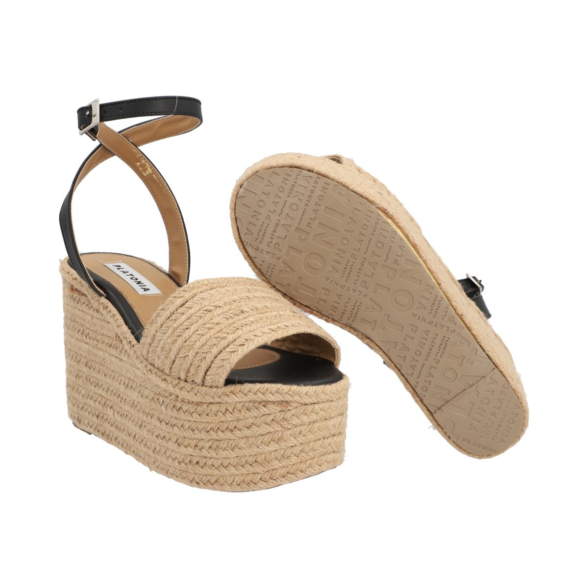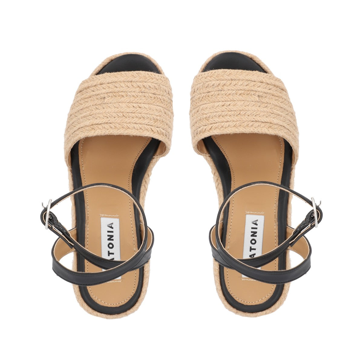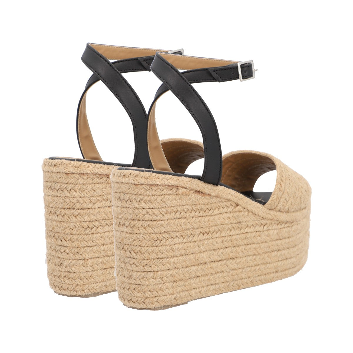 Sandalia de plataforma con yute natural para mujer cabra piel sintético negro, con látigo ajustable.
