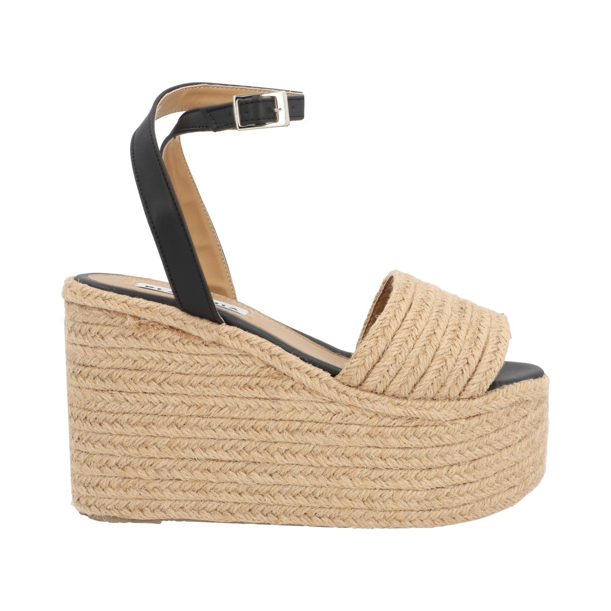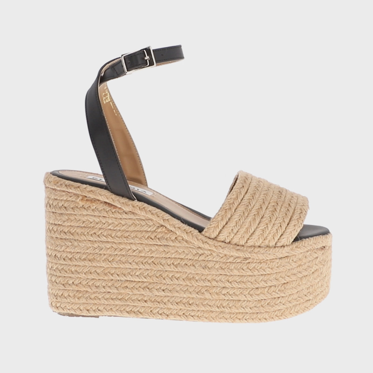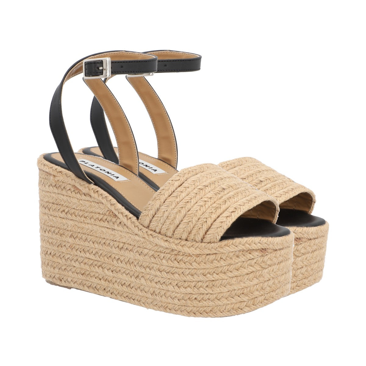 Sandalia de plataforma con yute natural para mujer cabra piel sintético negro, con látigo ajustable.