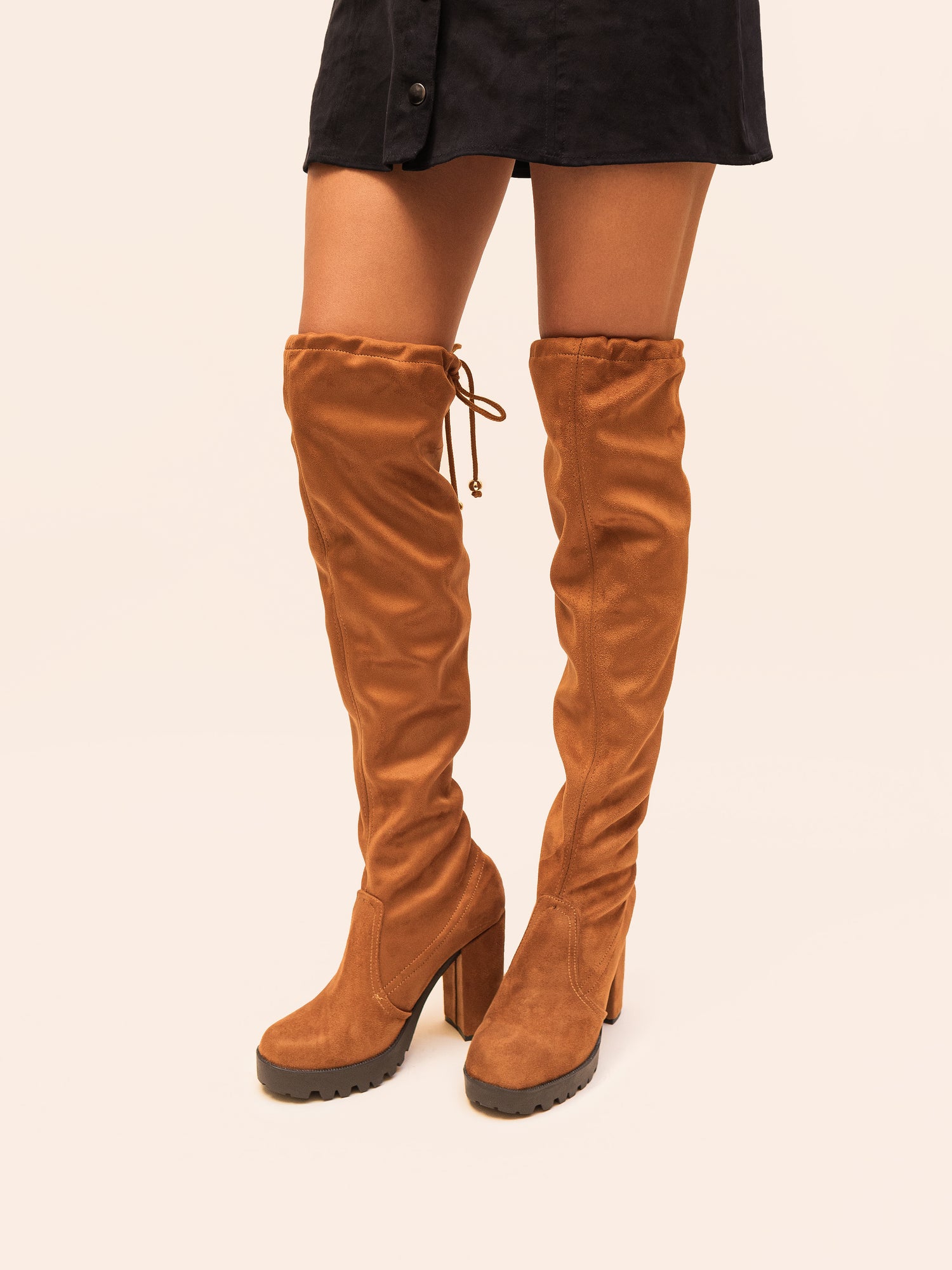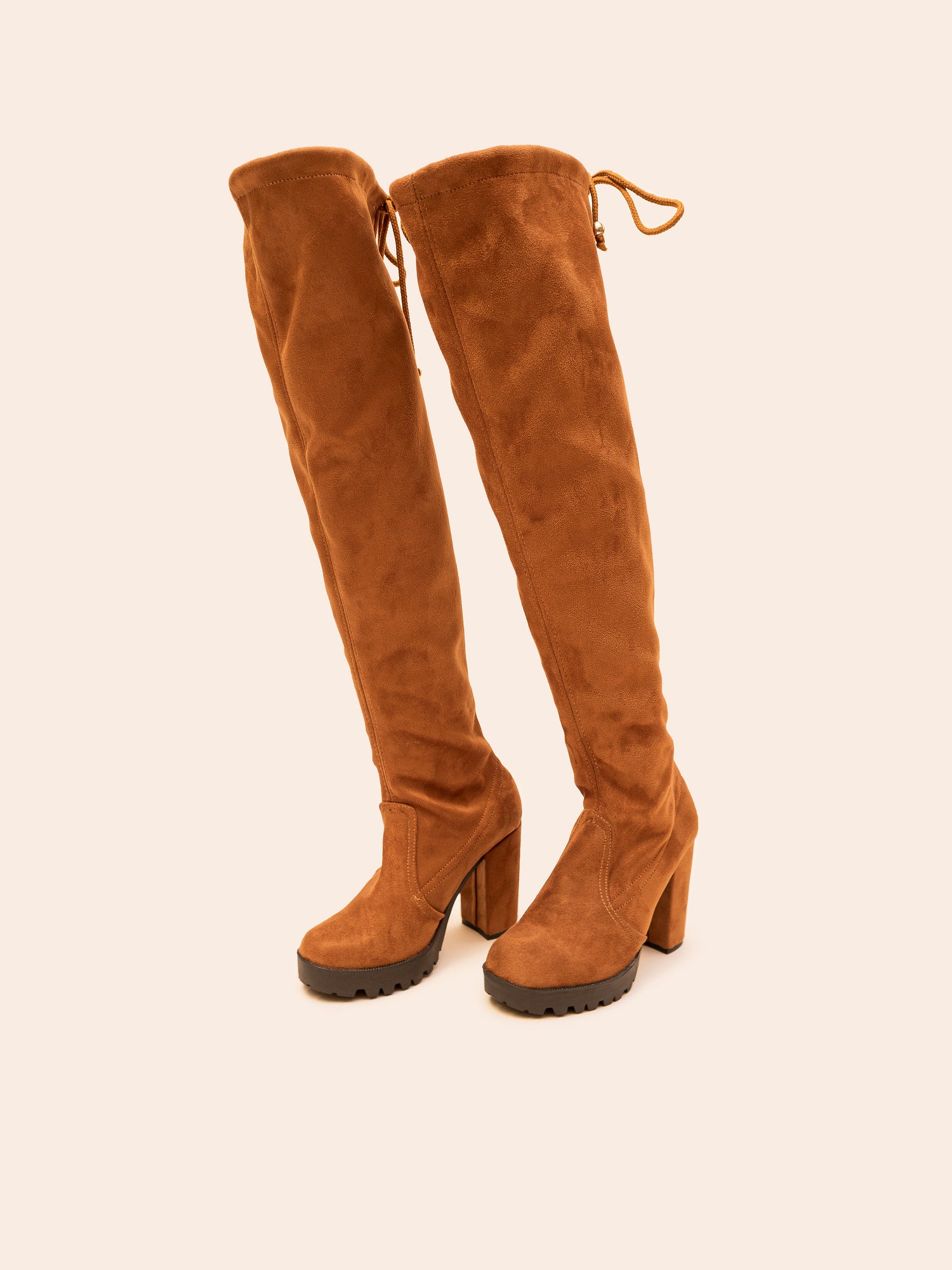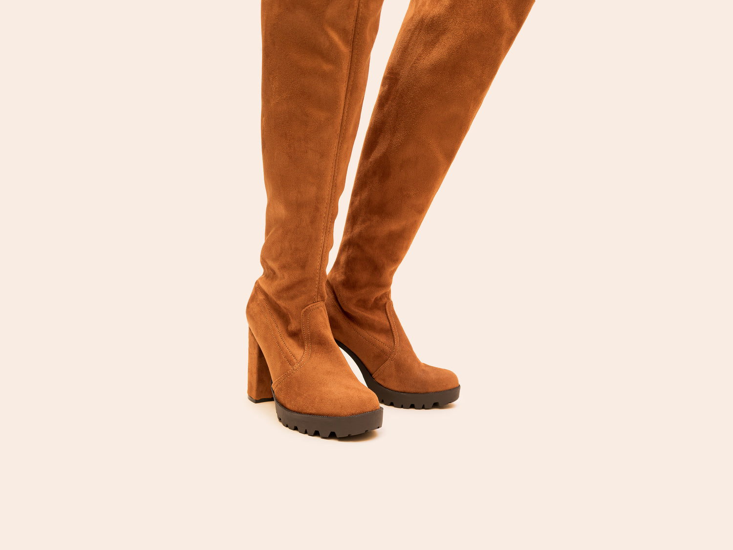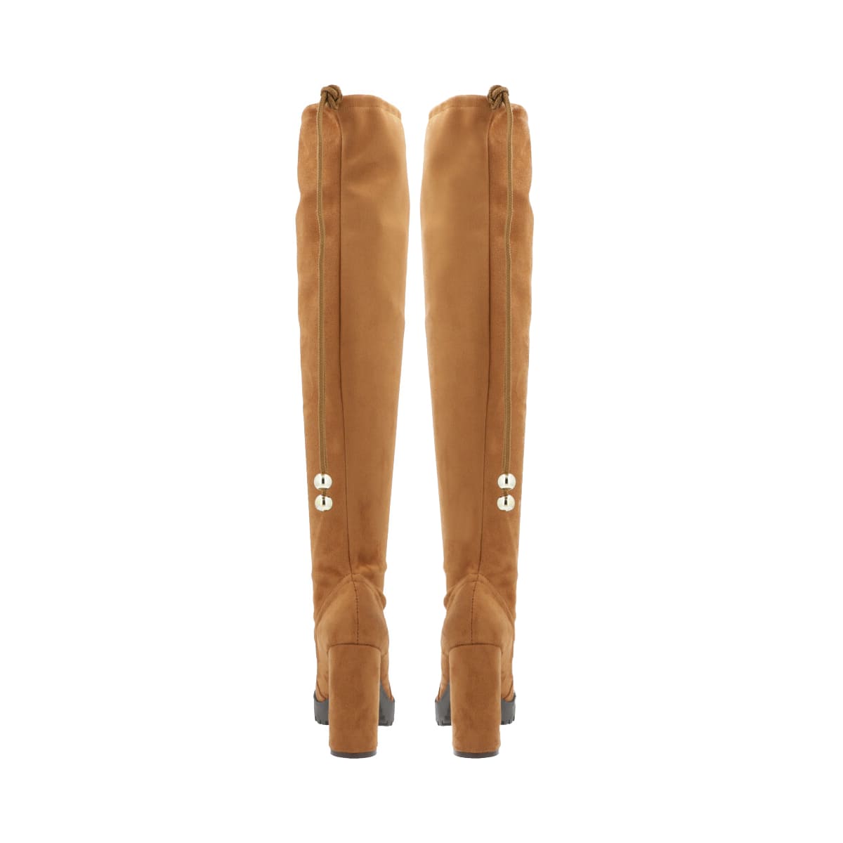 Bota de tacón para mujer tipo extra larga color camel de lycra con ajuste superior.