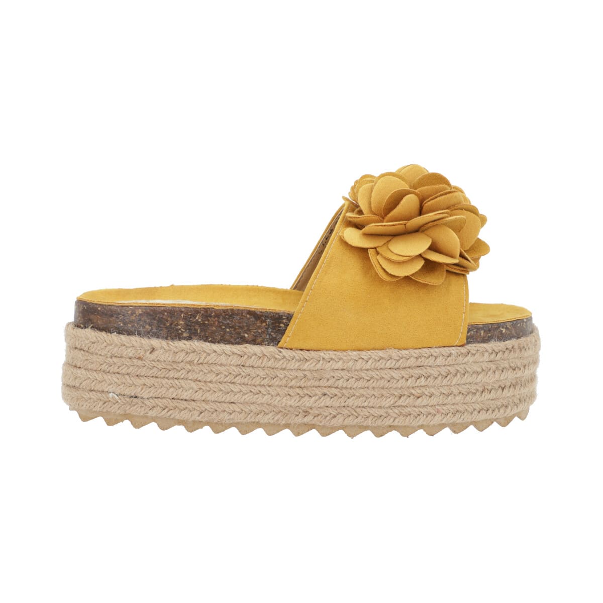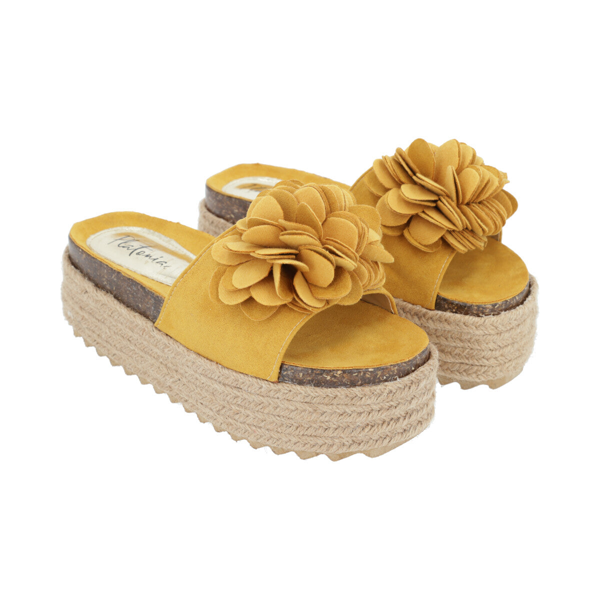 Sandalia de plataforma con yute para mujer color amarillo ocre con aplicación de flor