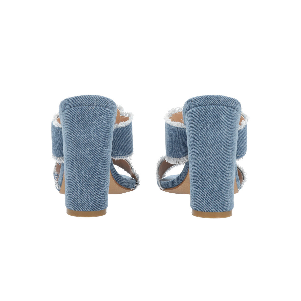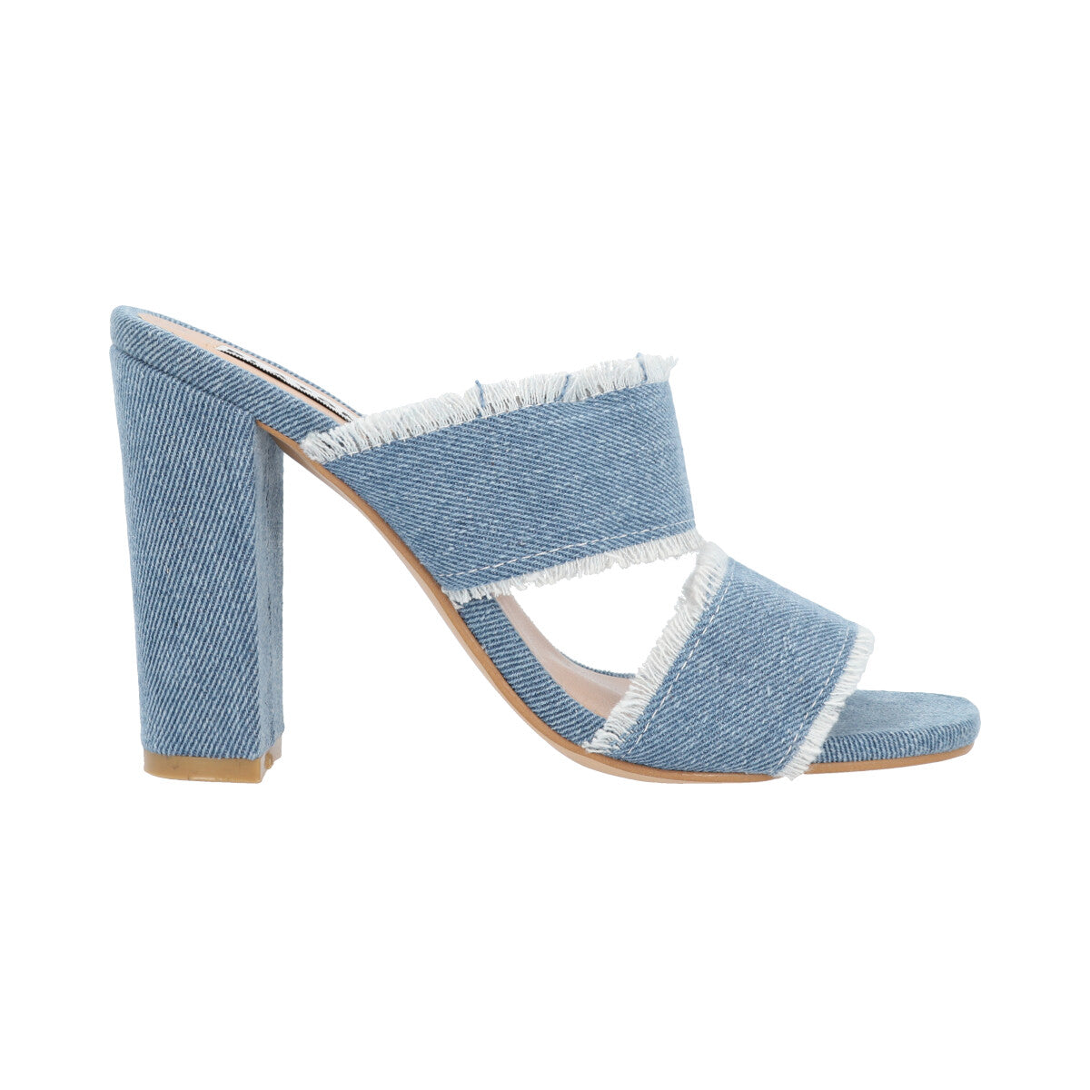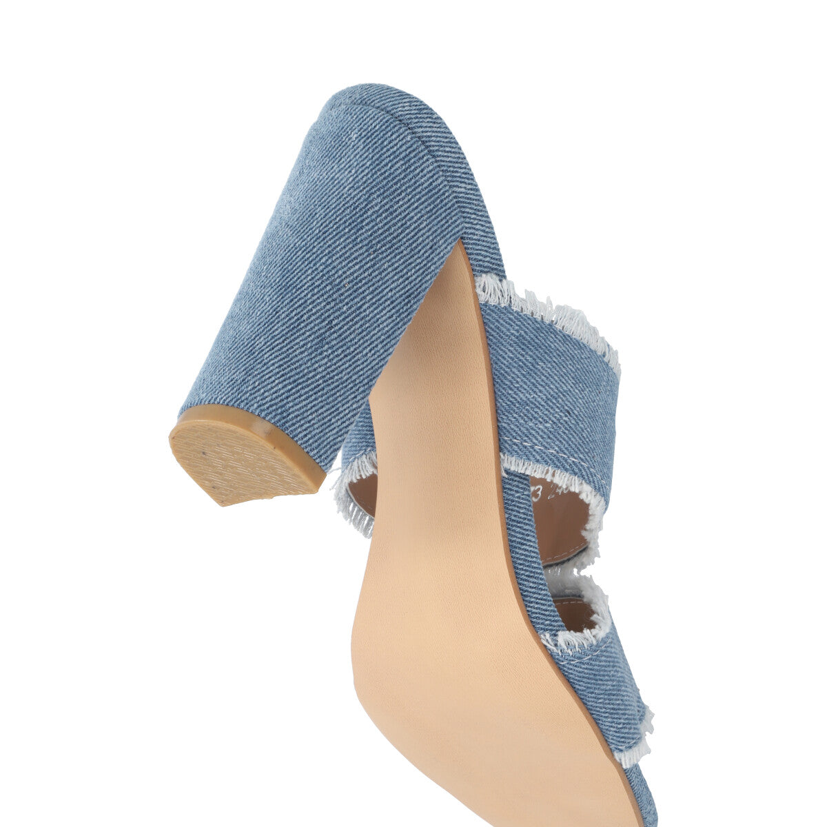 Zapatilla de tacón estilizado para mujer color mezclilla azul con látigos slip ajustables.