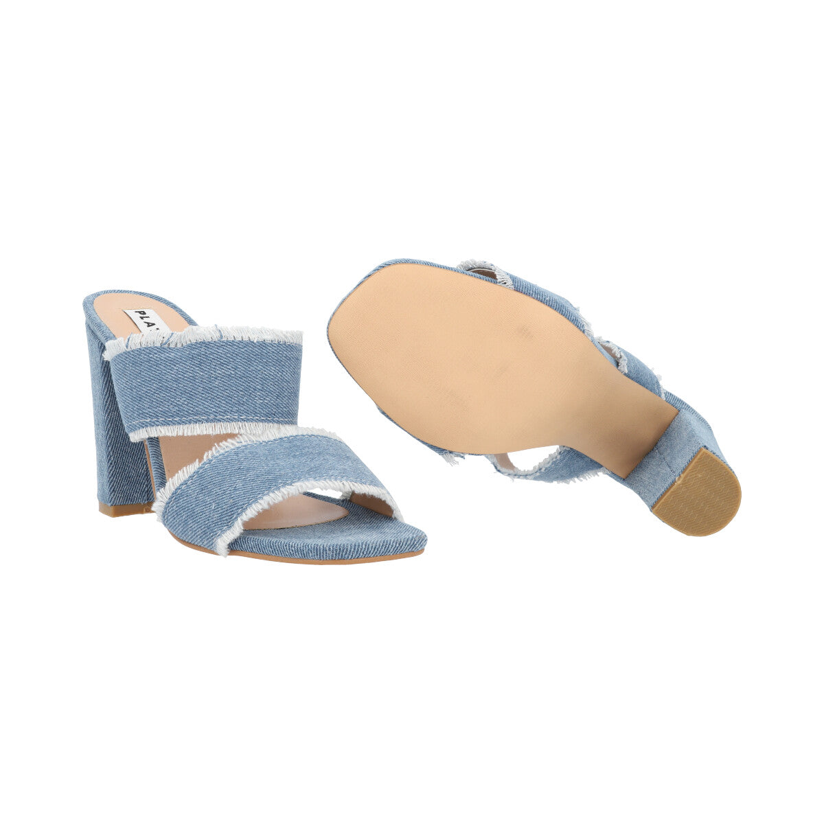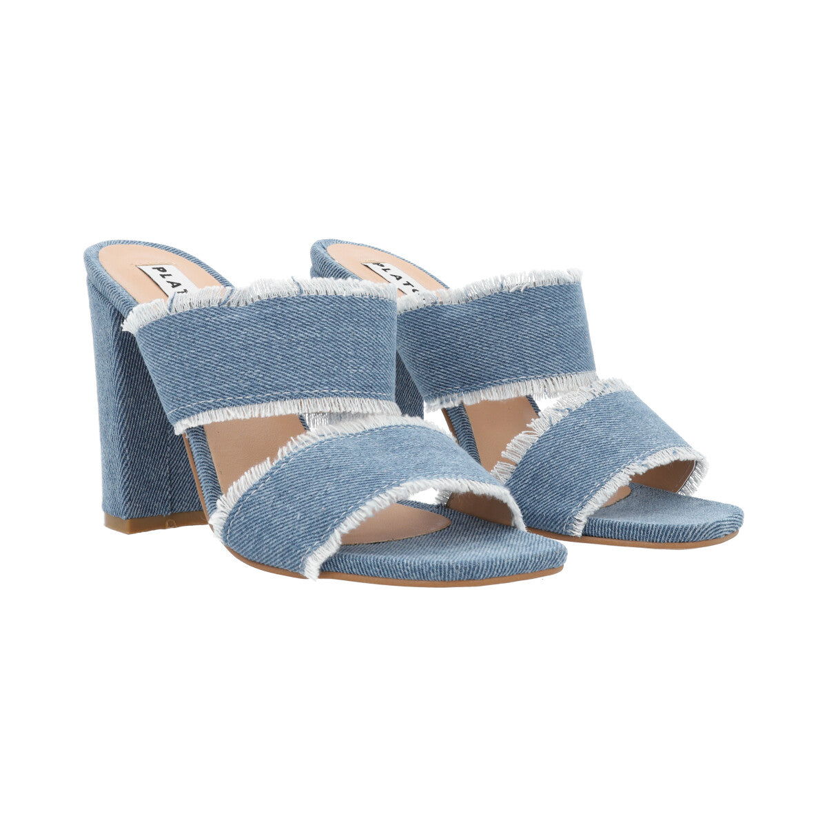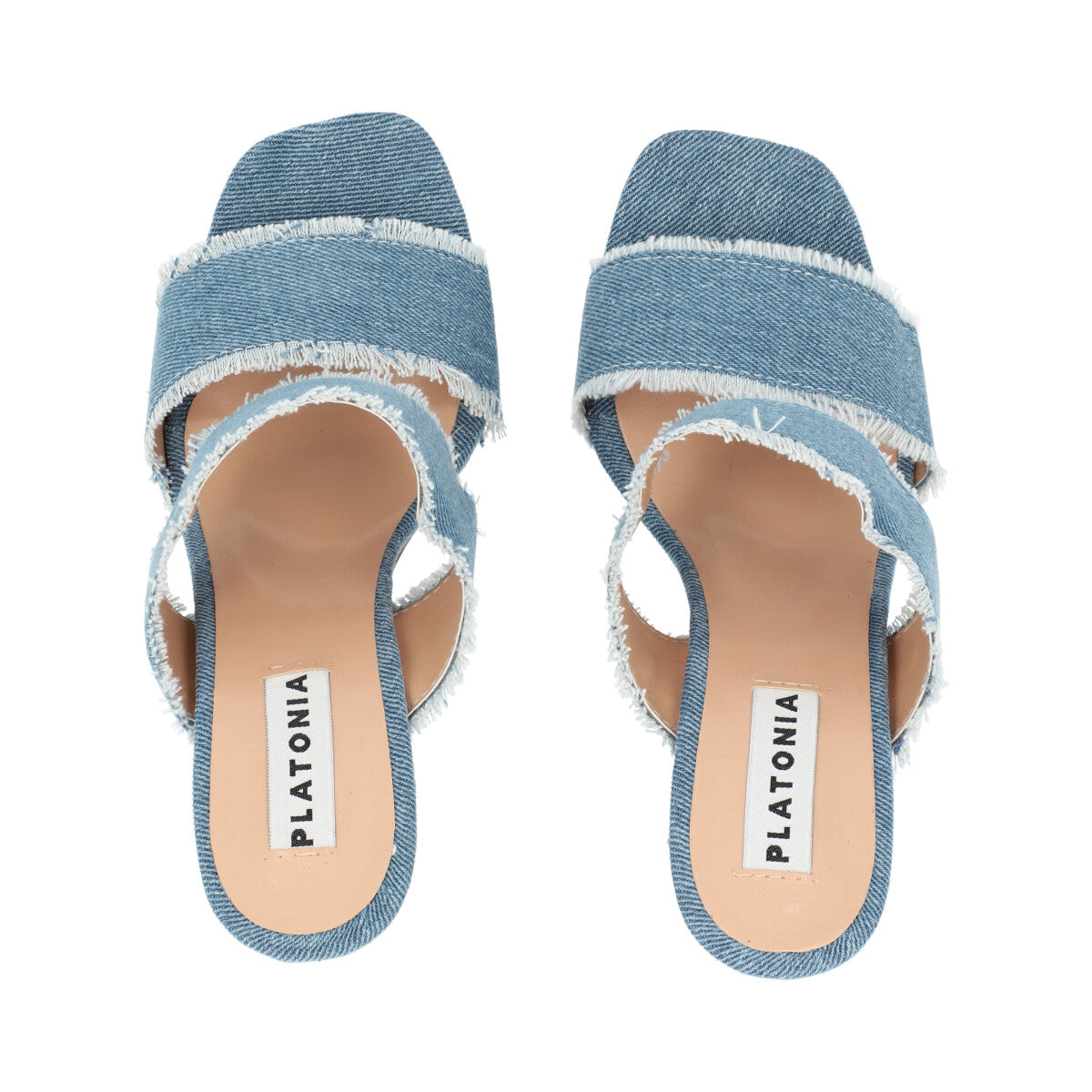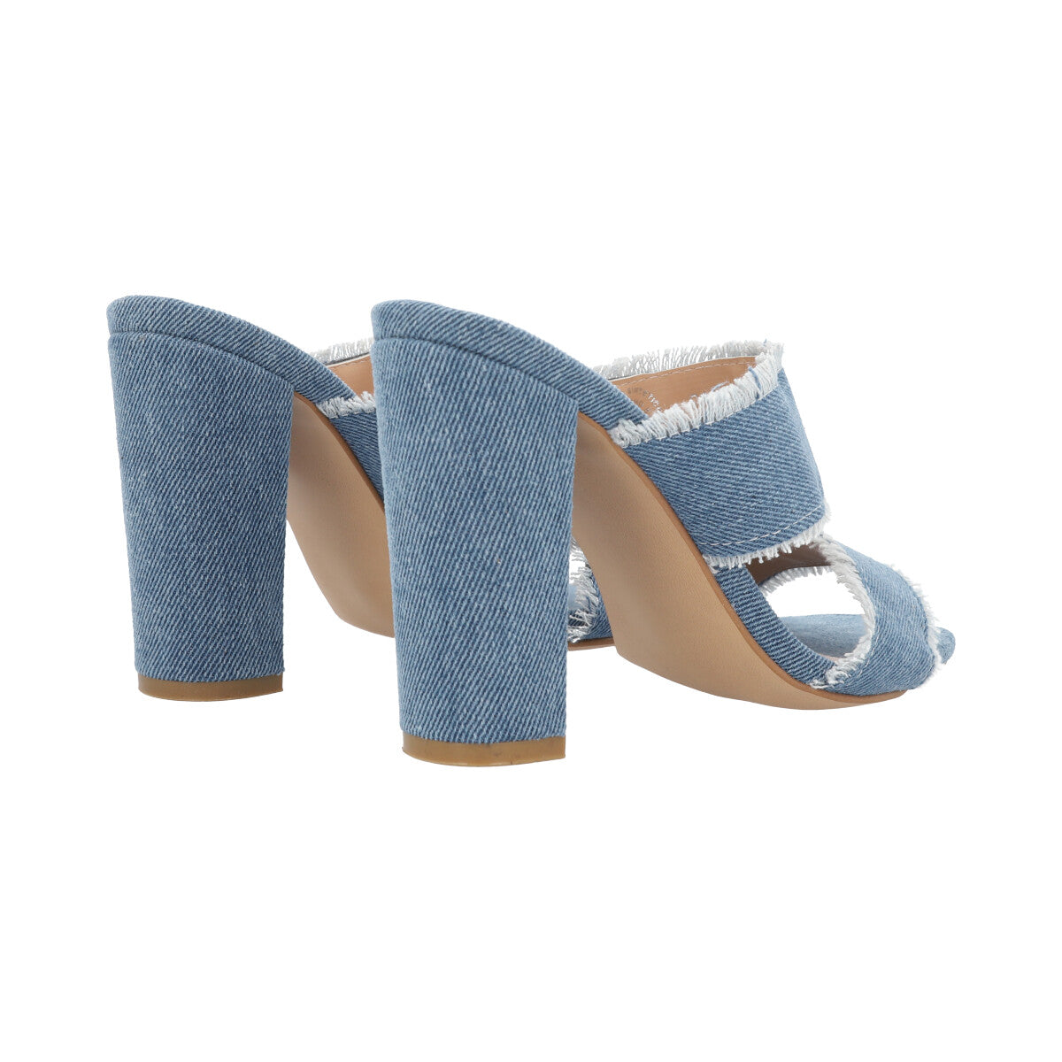 Zapatilla de tacón estilizado para mujer color mezclilla azul con látigos slip ajustables.