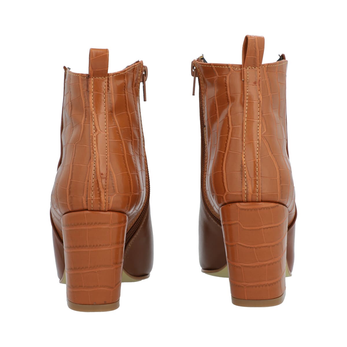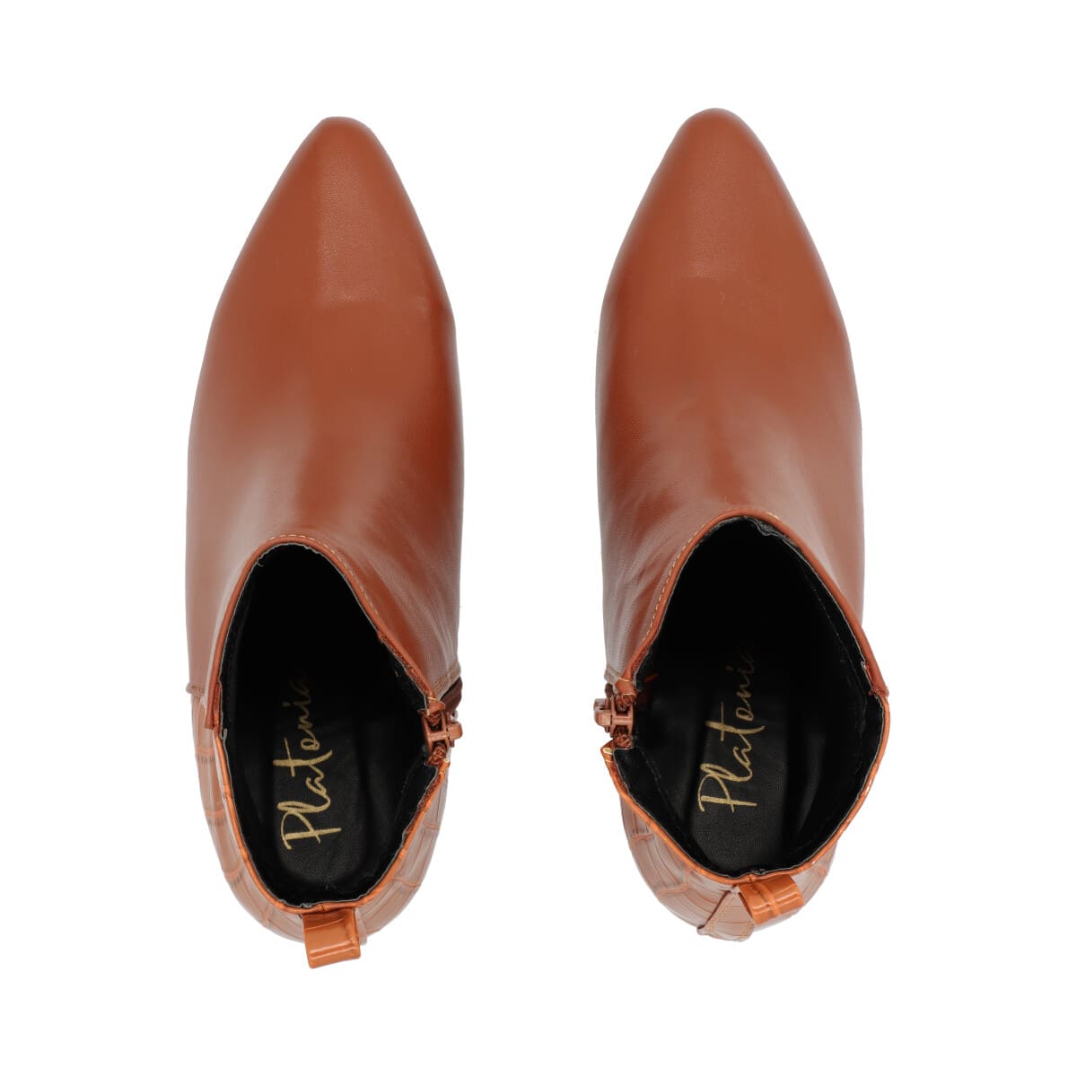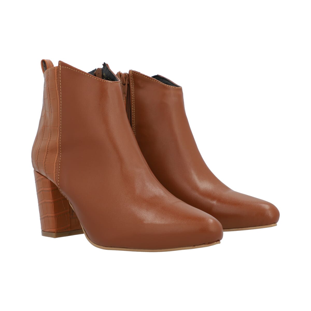 Botín tipo puntal con tacón grueso para mujer color camel y drillo, con cierre lateral reforzado color camel.