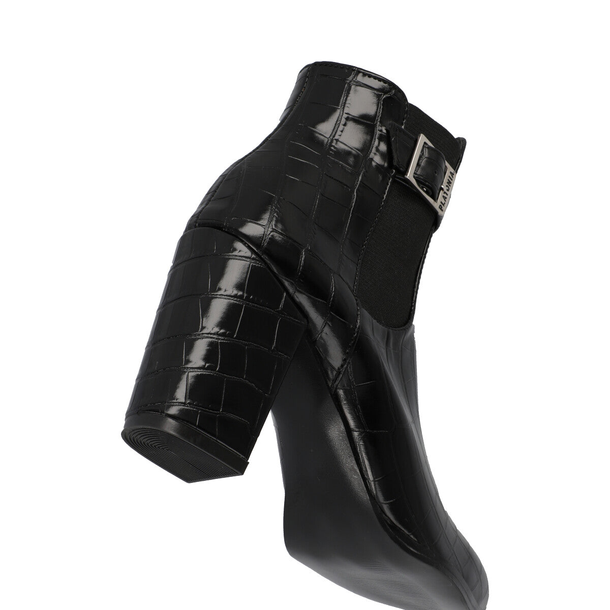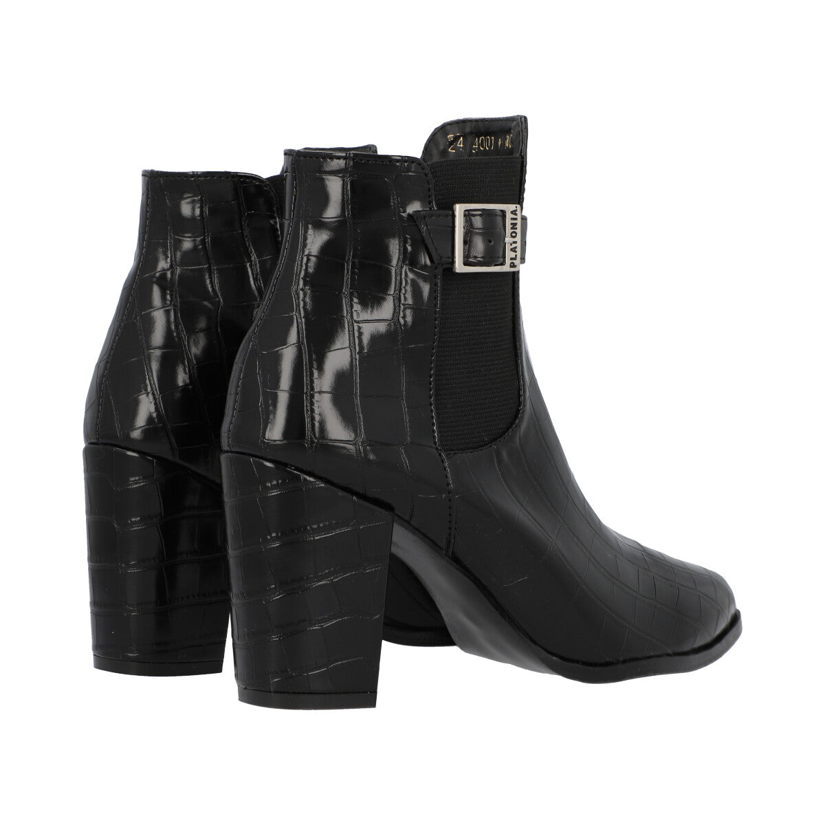 Botín de tacón alto al tobillo para mujer charol premium drillo negro con resorte y hebilla ajustable.