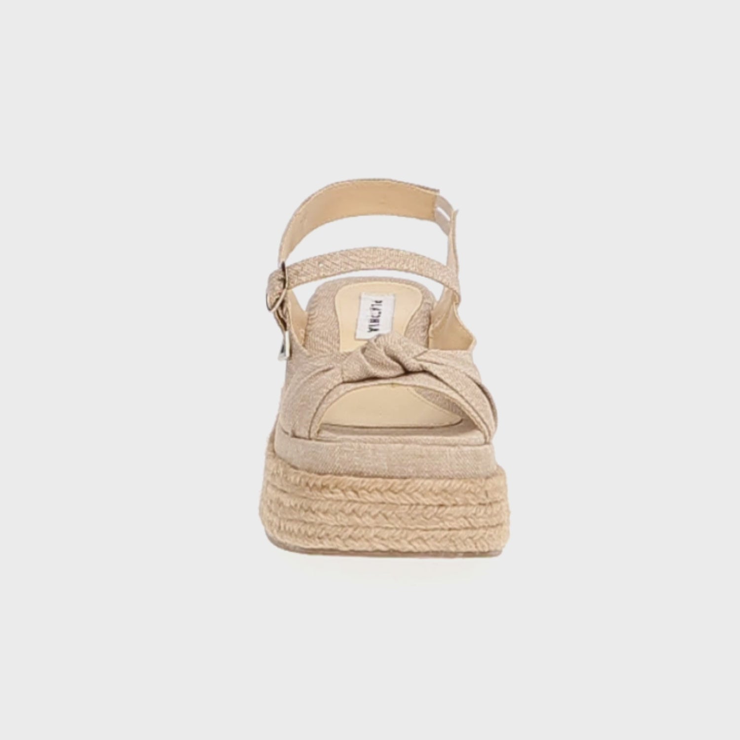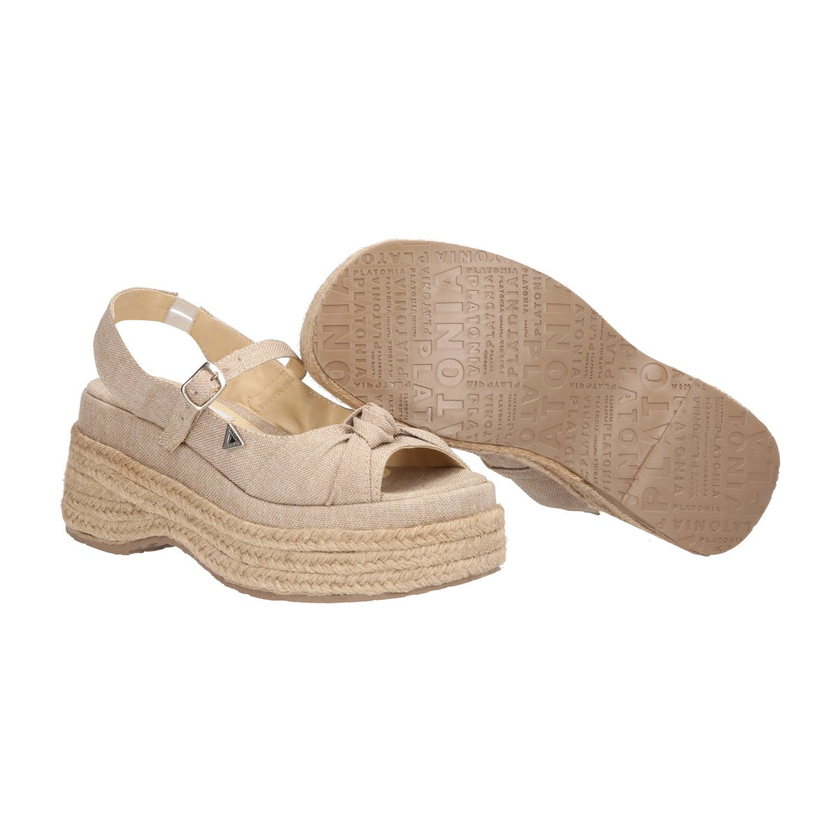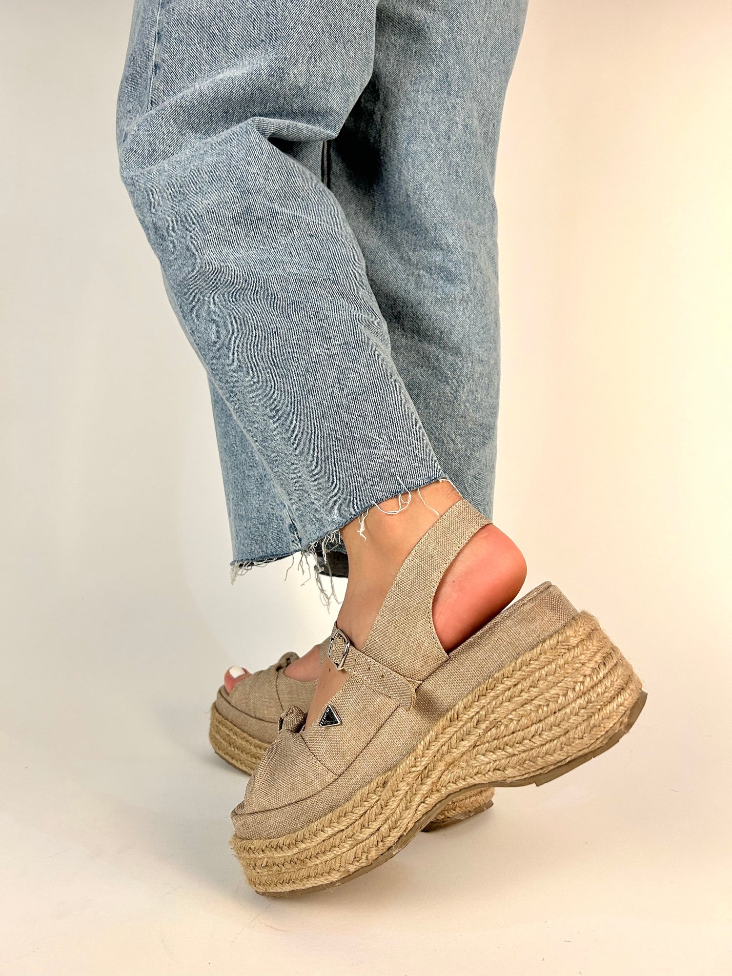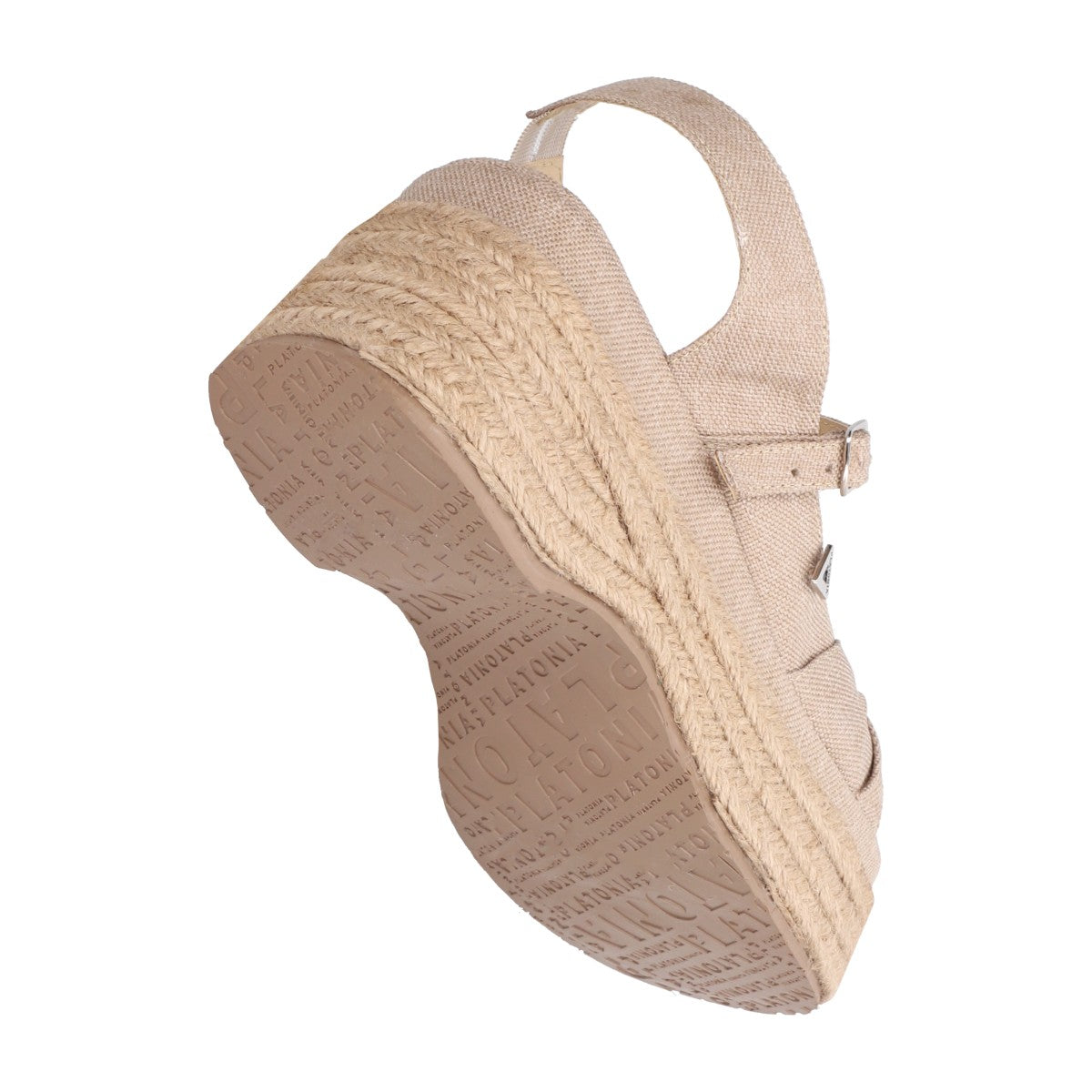 Sandalia de plataforma de yute con lona premium beige con ajuste de látigo y hebilla metálica.