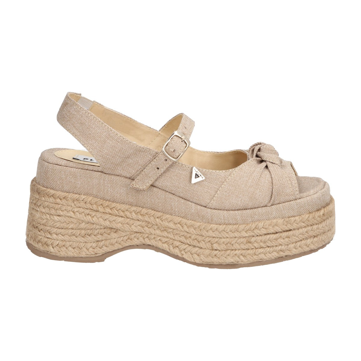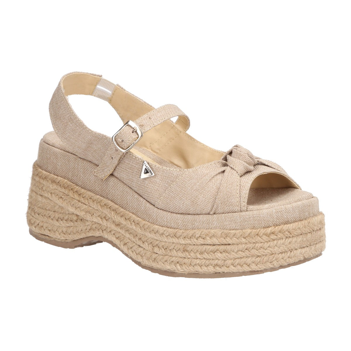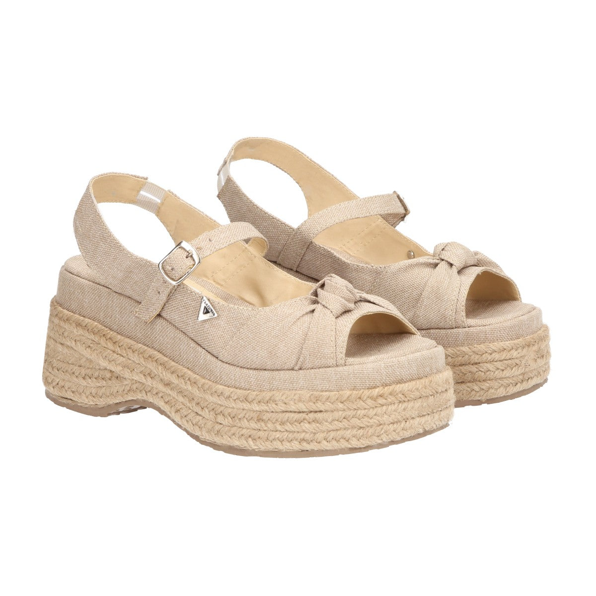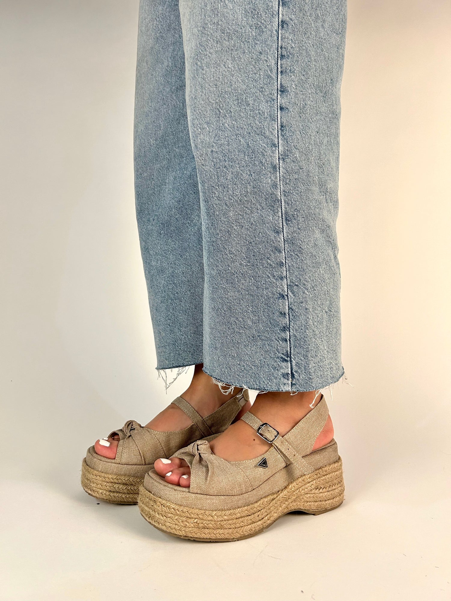 Sandalia de plataforma de yute con lona premium beige con ajuste de látigo y hebilla metálica.