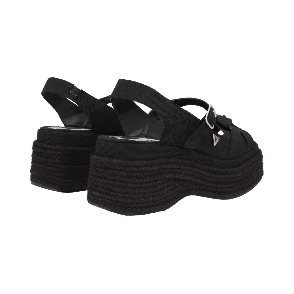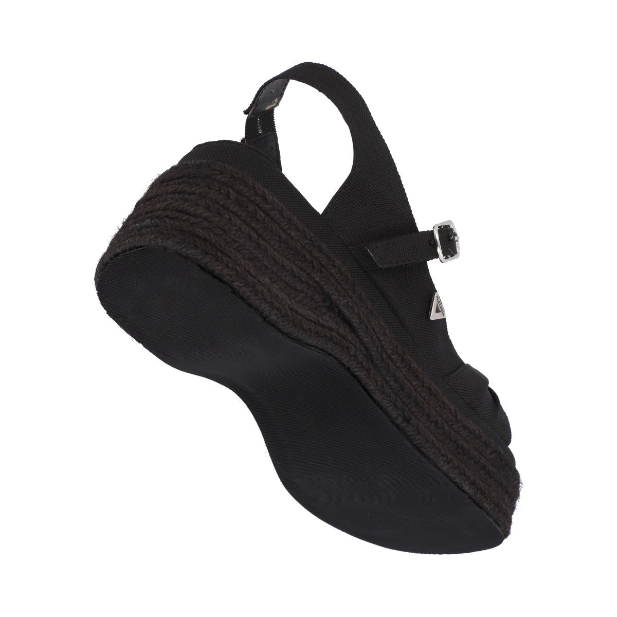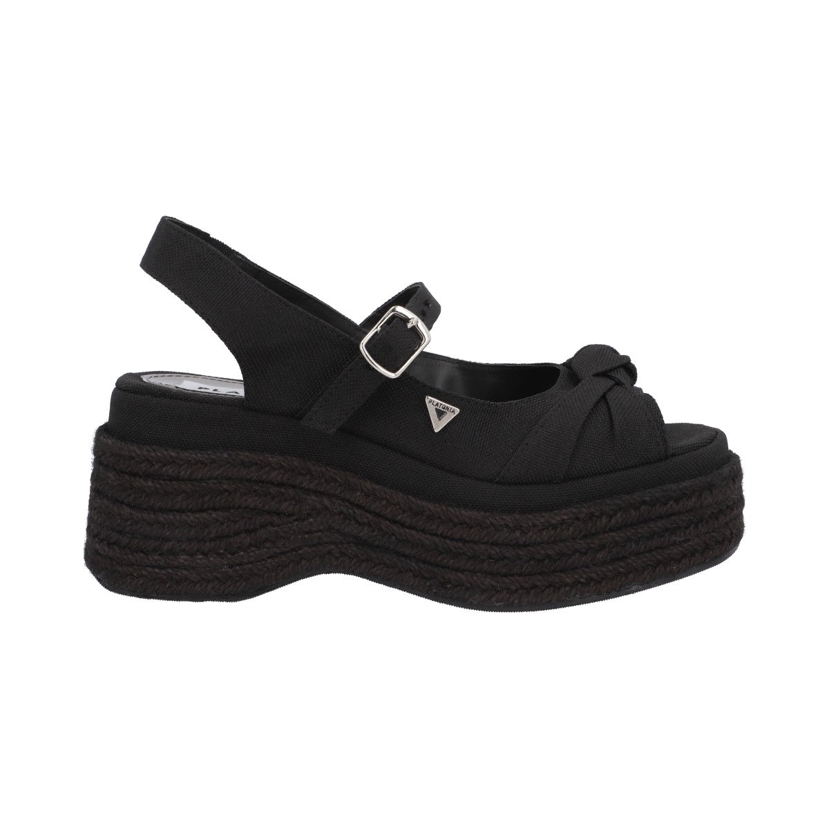 Sandalia de plataforma de yute con lona premium negro con ajuste de látigo y hebilla metálica.