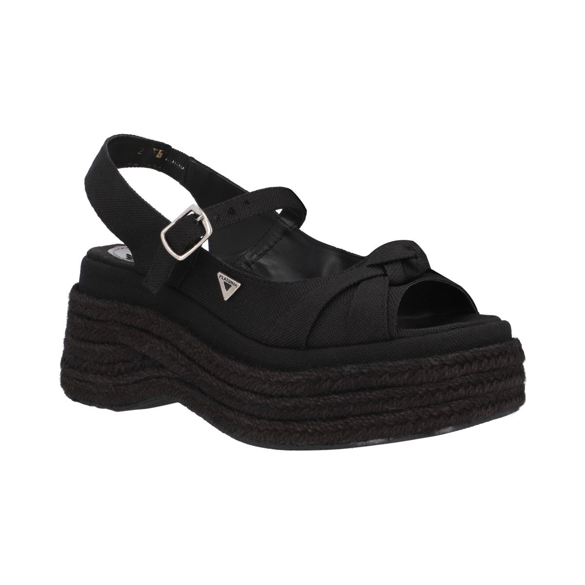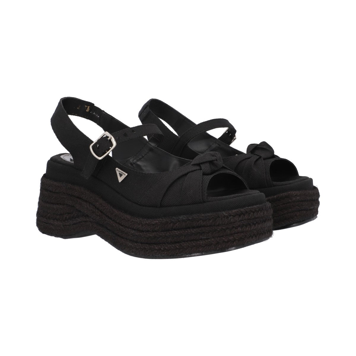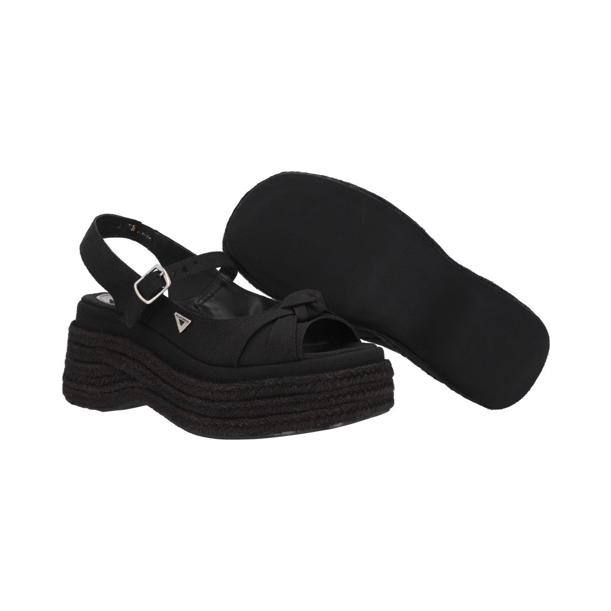 Sandalia de plataforma de yute con lona premium negro con ajuste de látigo y hebilla metálica.