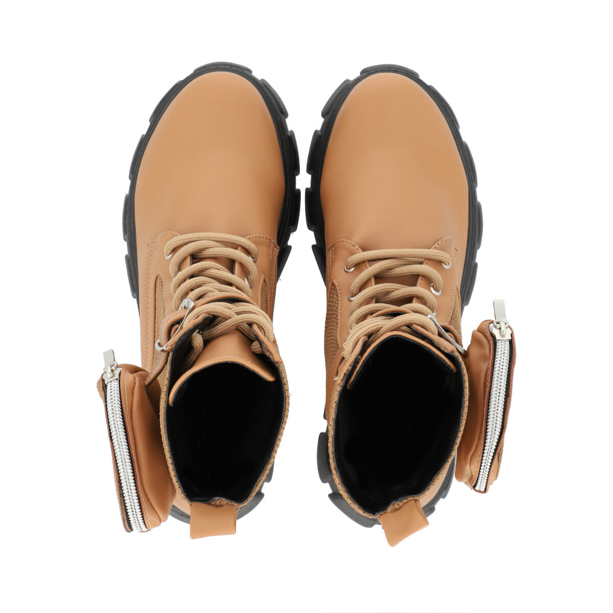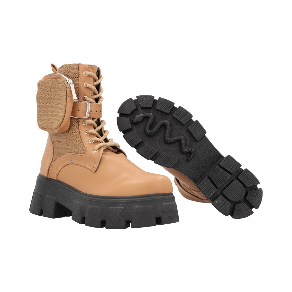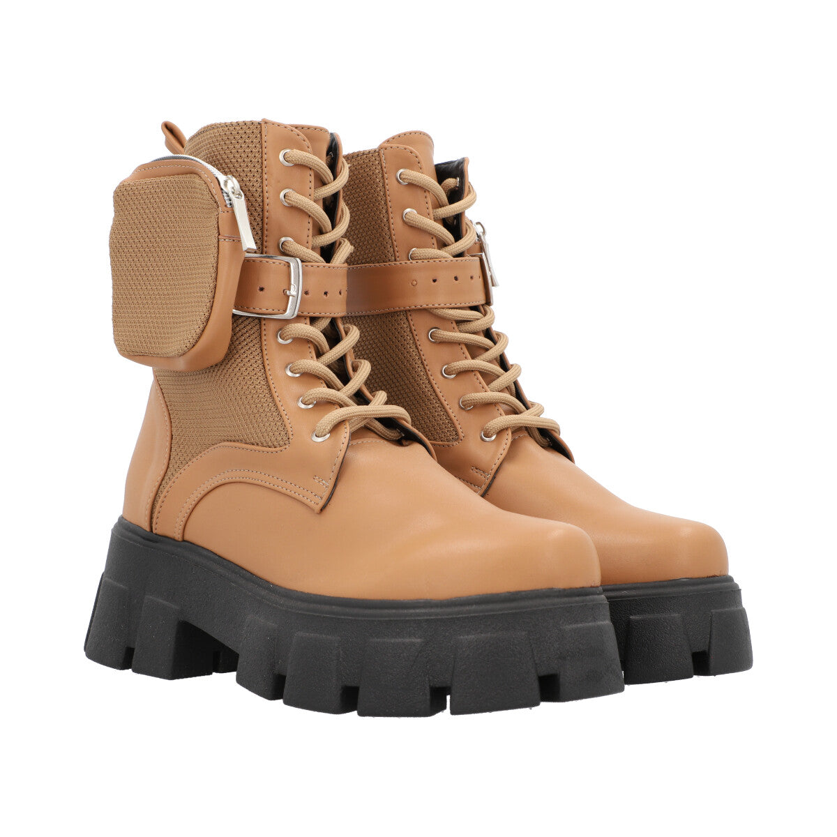 Bota tipo boots combat con suela gruesa para mujer color camel con bolsita cool con agujetas para ajuste..