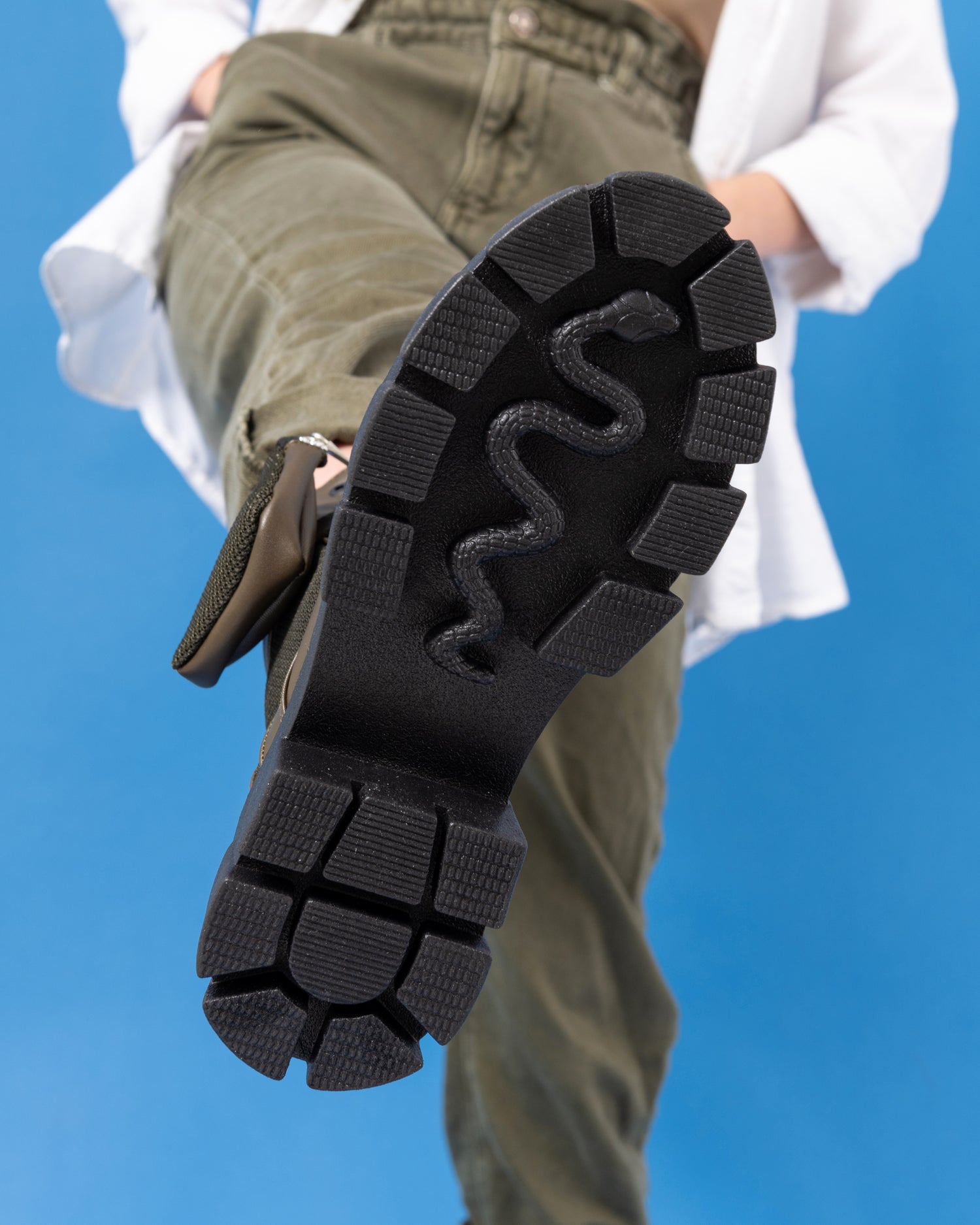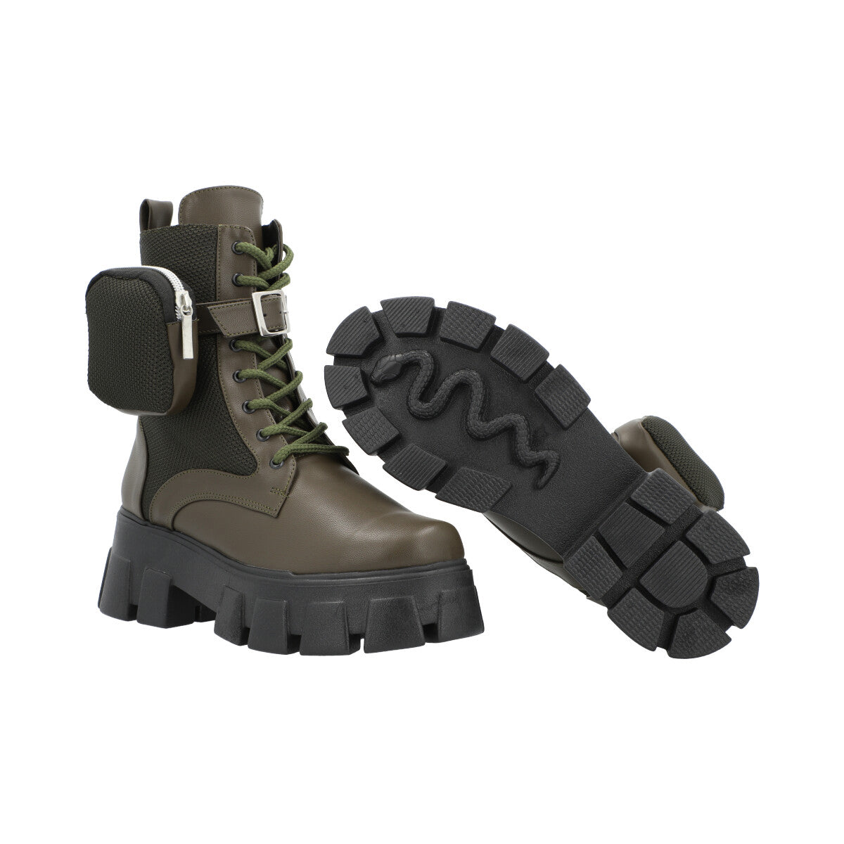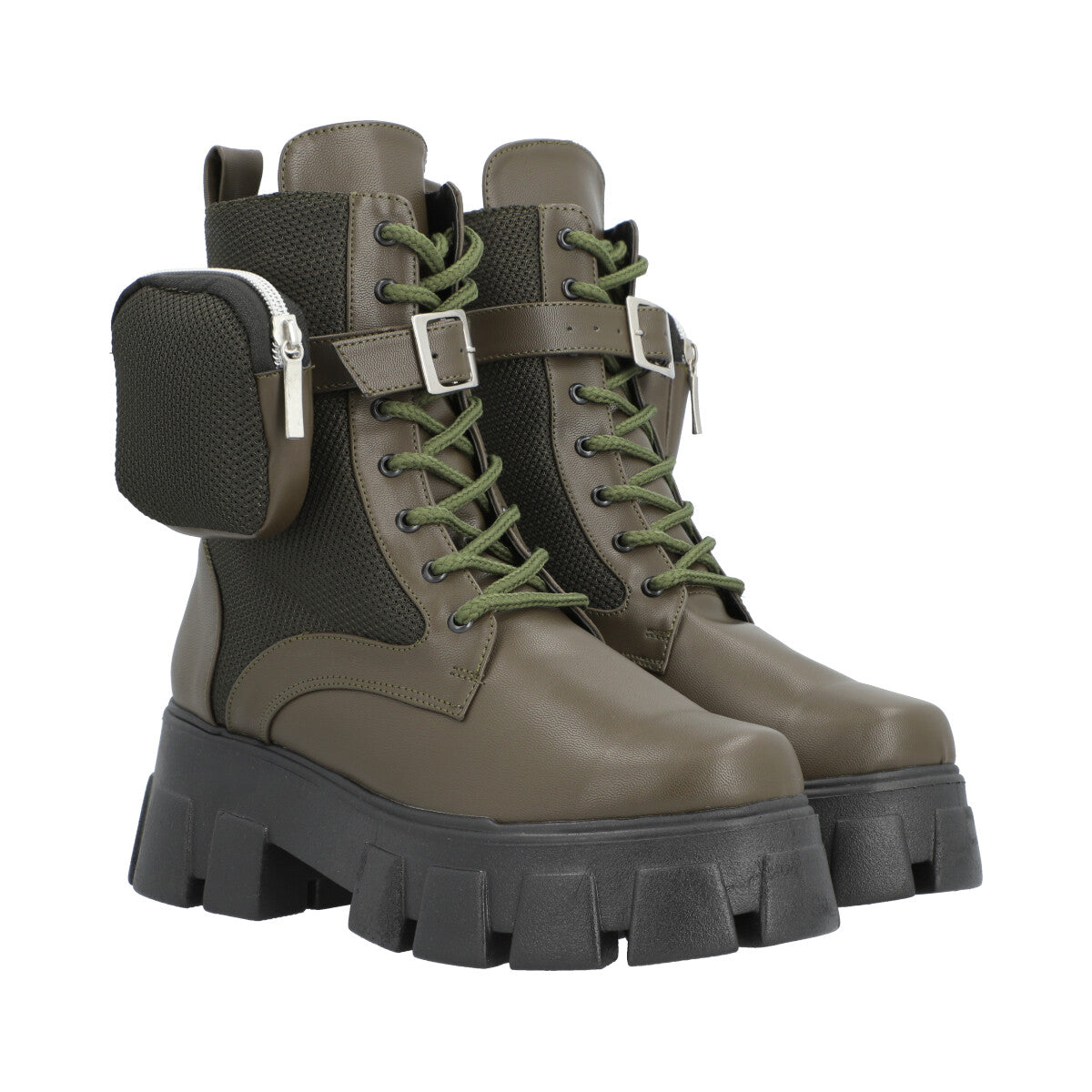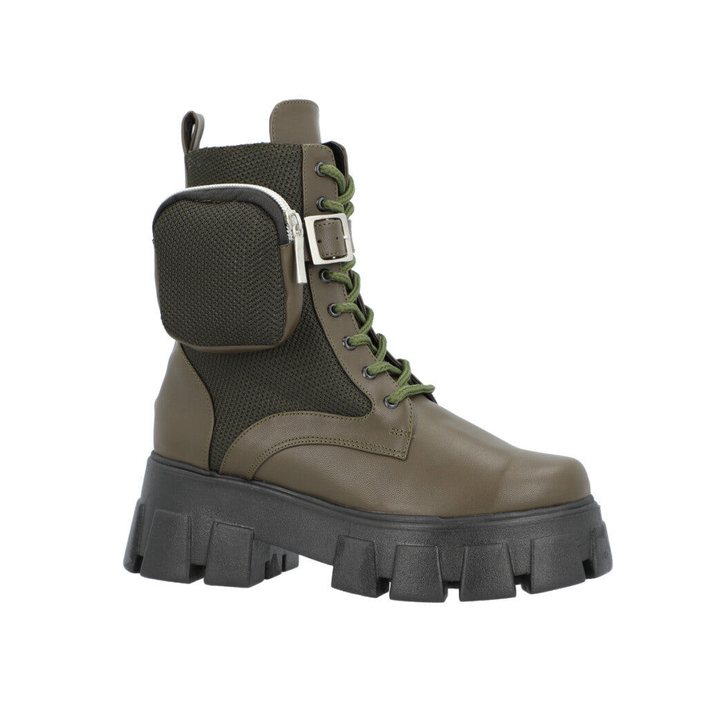 Bota tipo boots combat con suela gruesa para mujer color verde musgo con bolsita cool con agujetas para ajuste.
