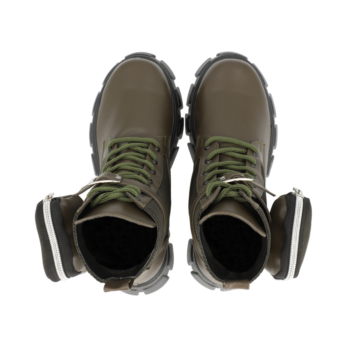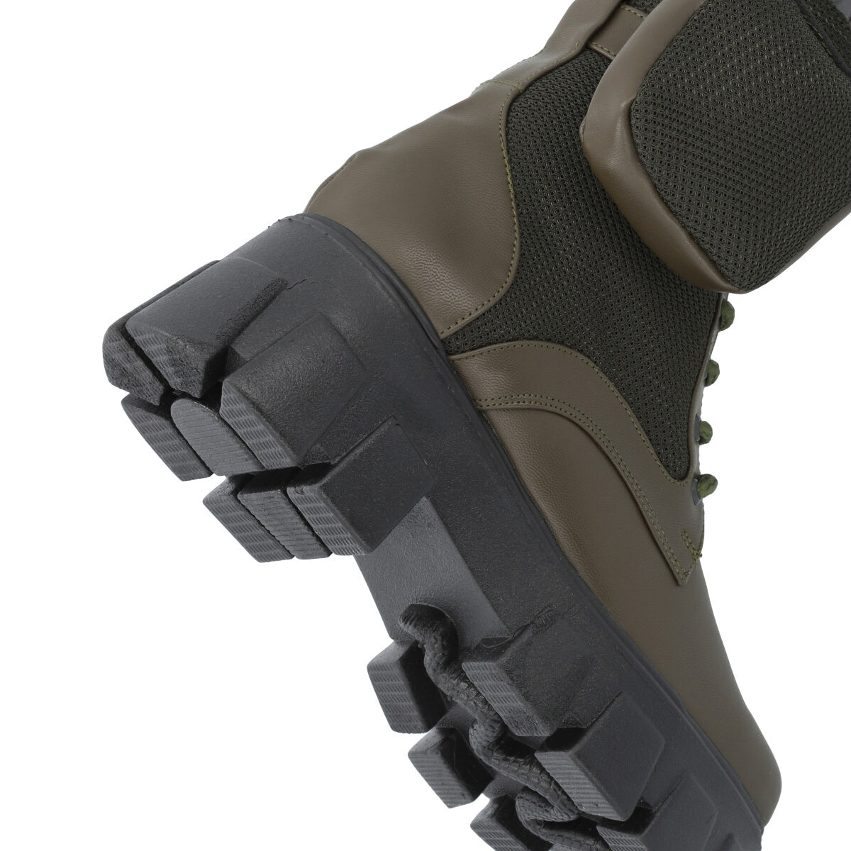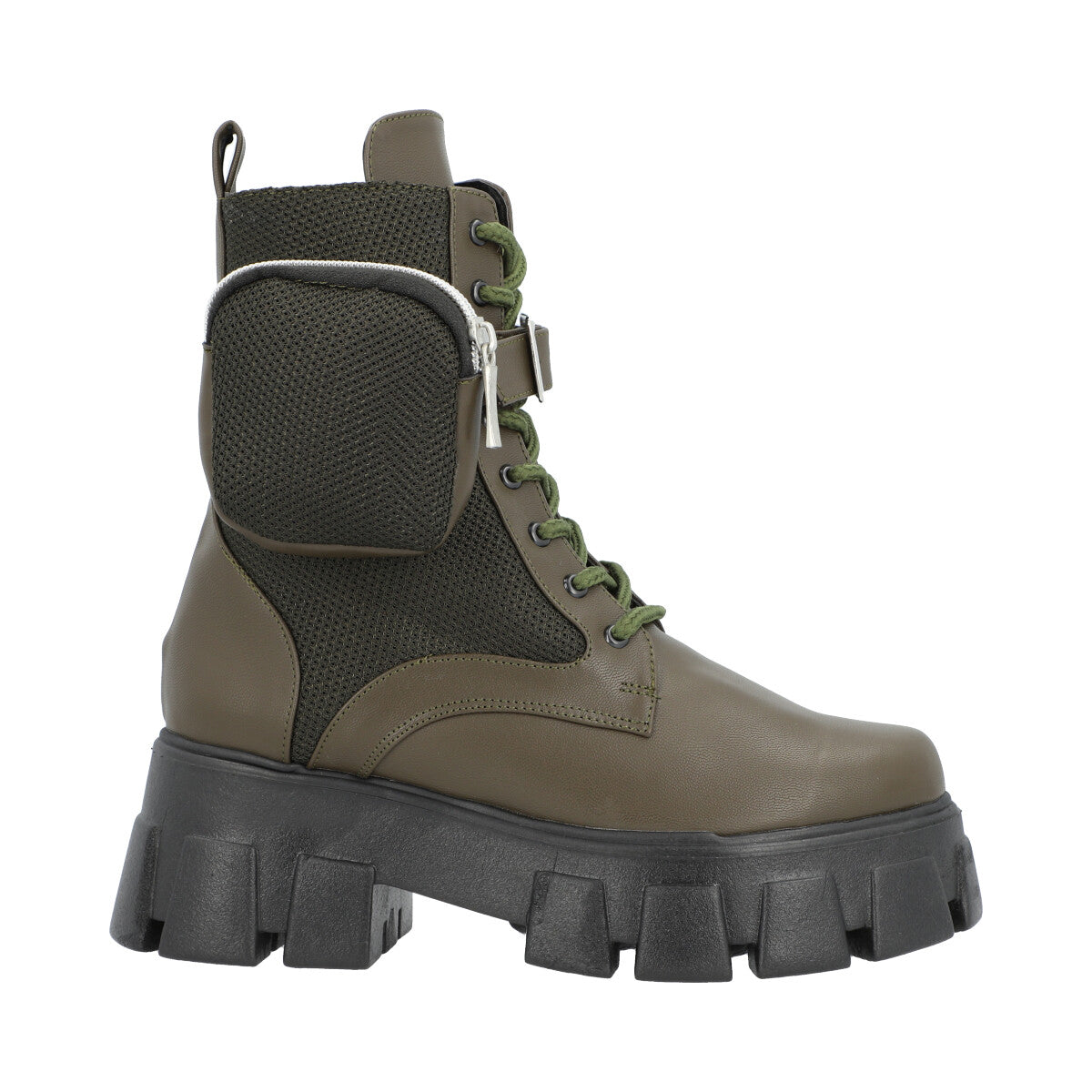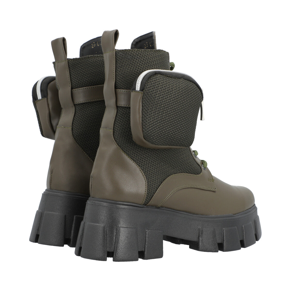 Bota tipo boots combat con suela gruesa para mujer color verde musgo con bolsita cool con agujetas para ajuste.