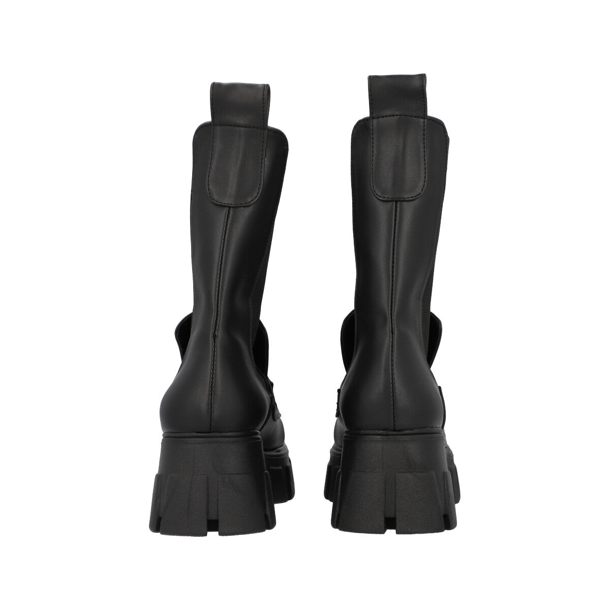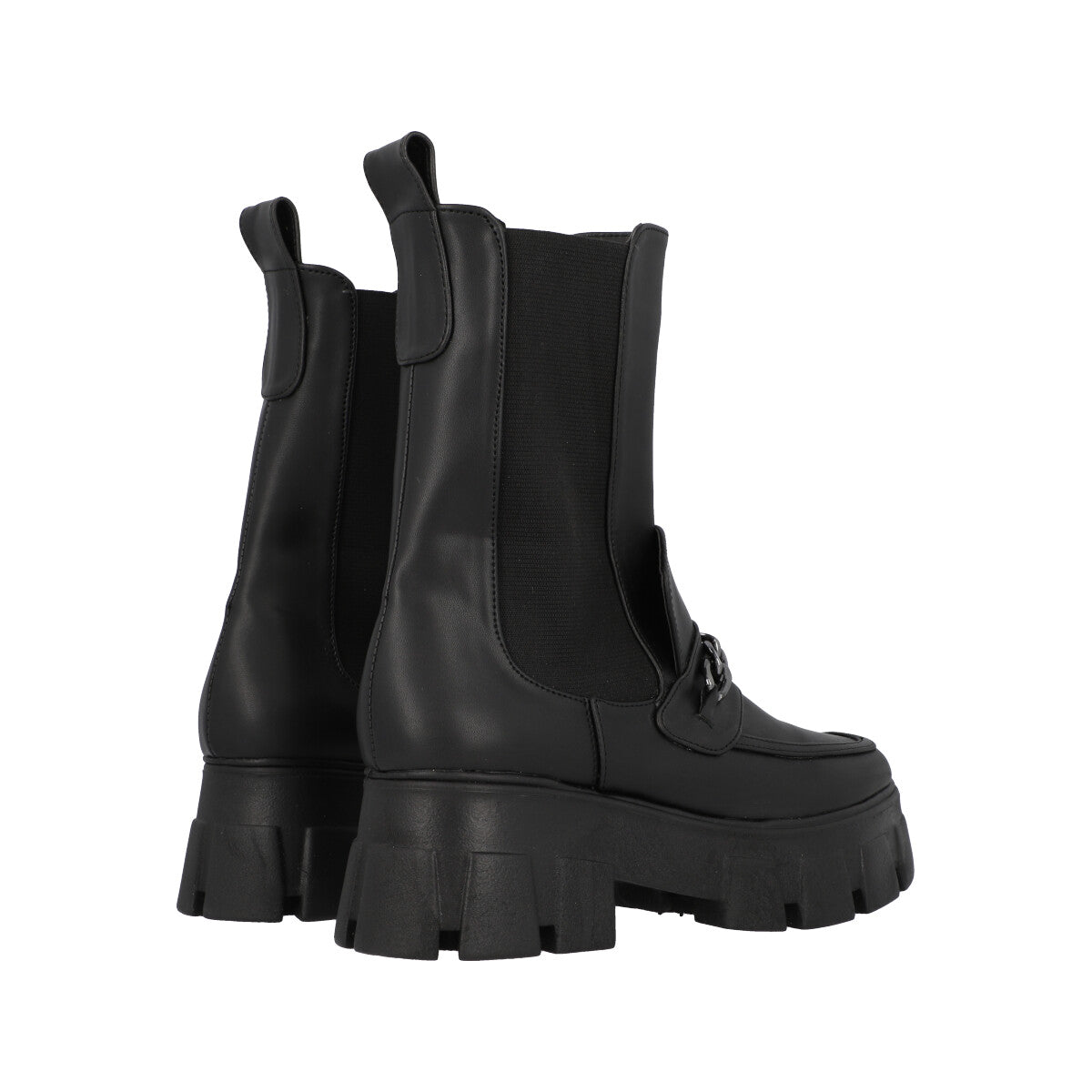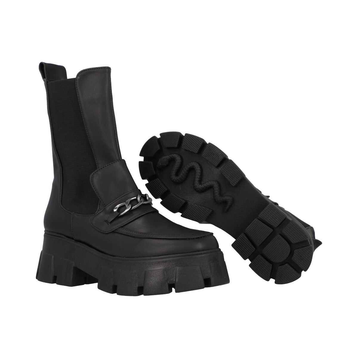 Bota tipo boots combat con suela gruesa para mujer cabra piel sintético negro, con resorte lateral para ajuste estilizado.