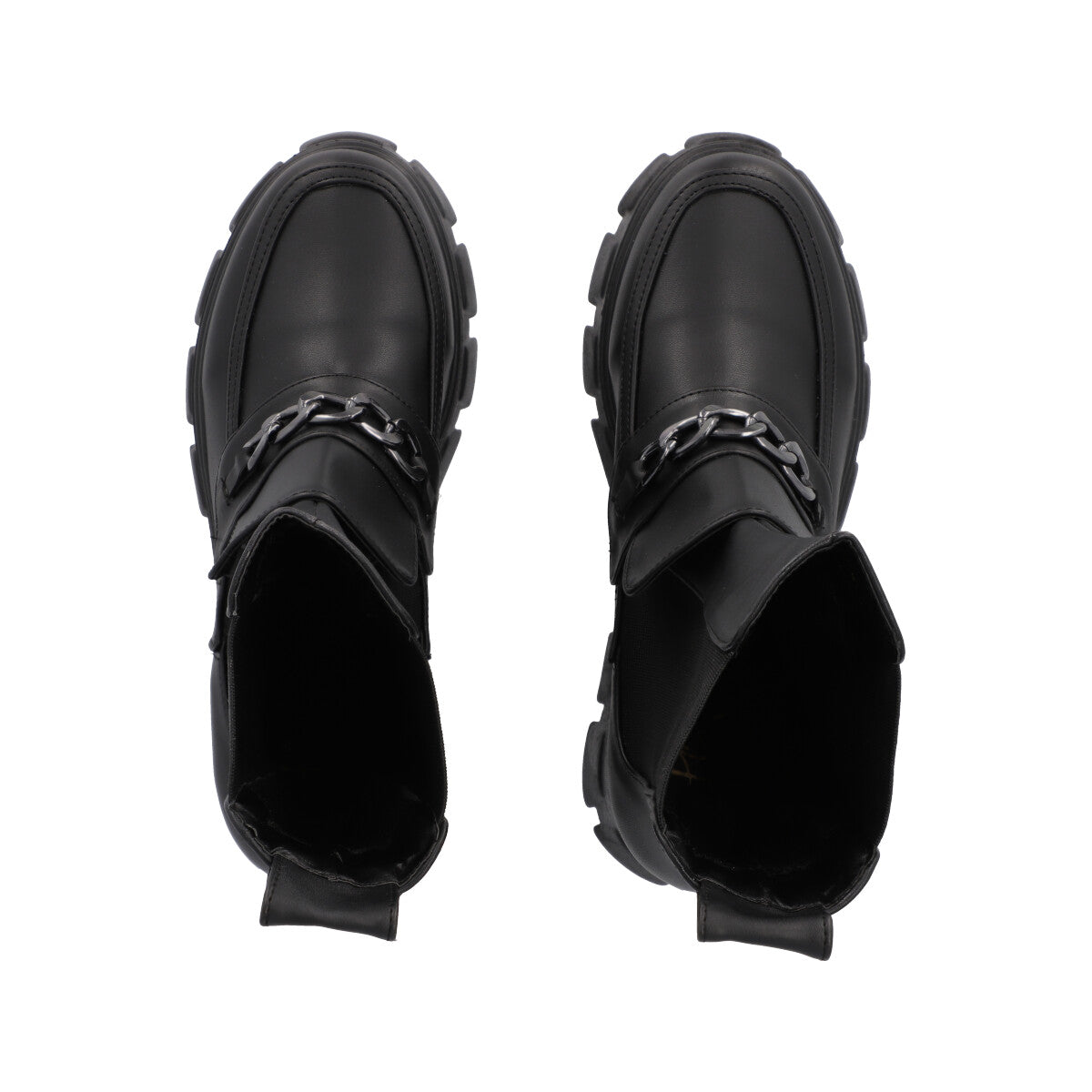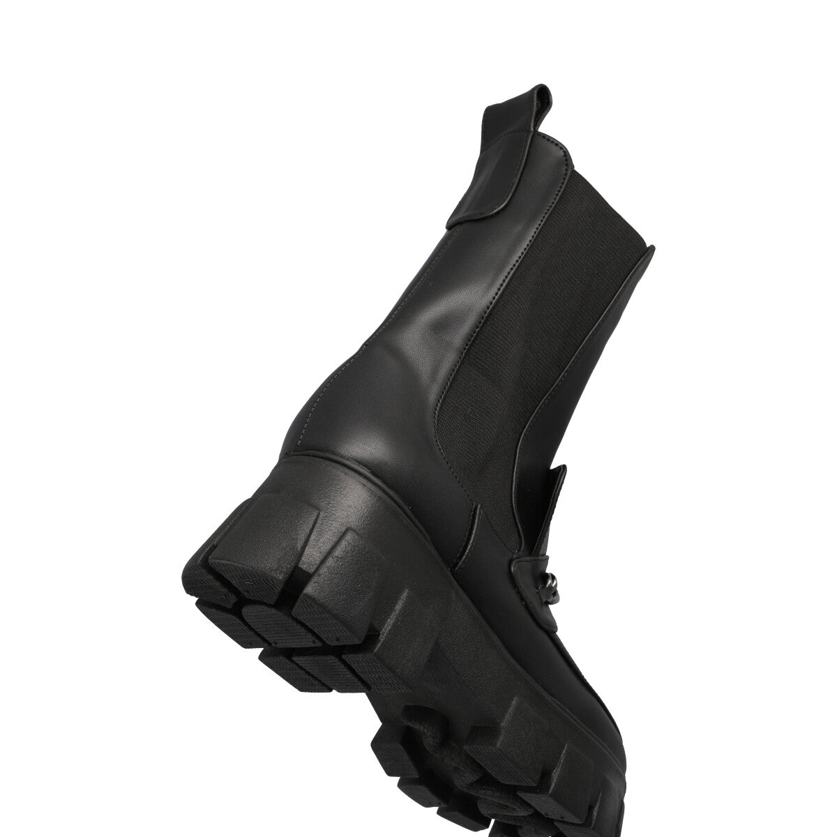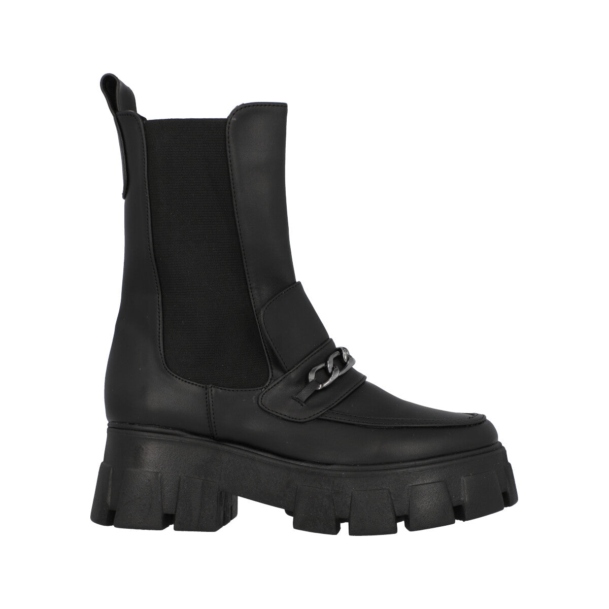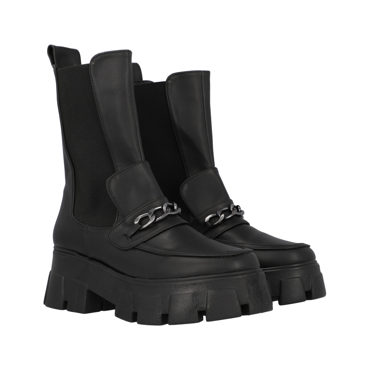 Bota tipo boots combat con suela gruesa para mujer cabra piel sintético negro, con resorte lateral para ajuste estilizado.