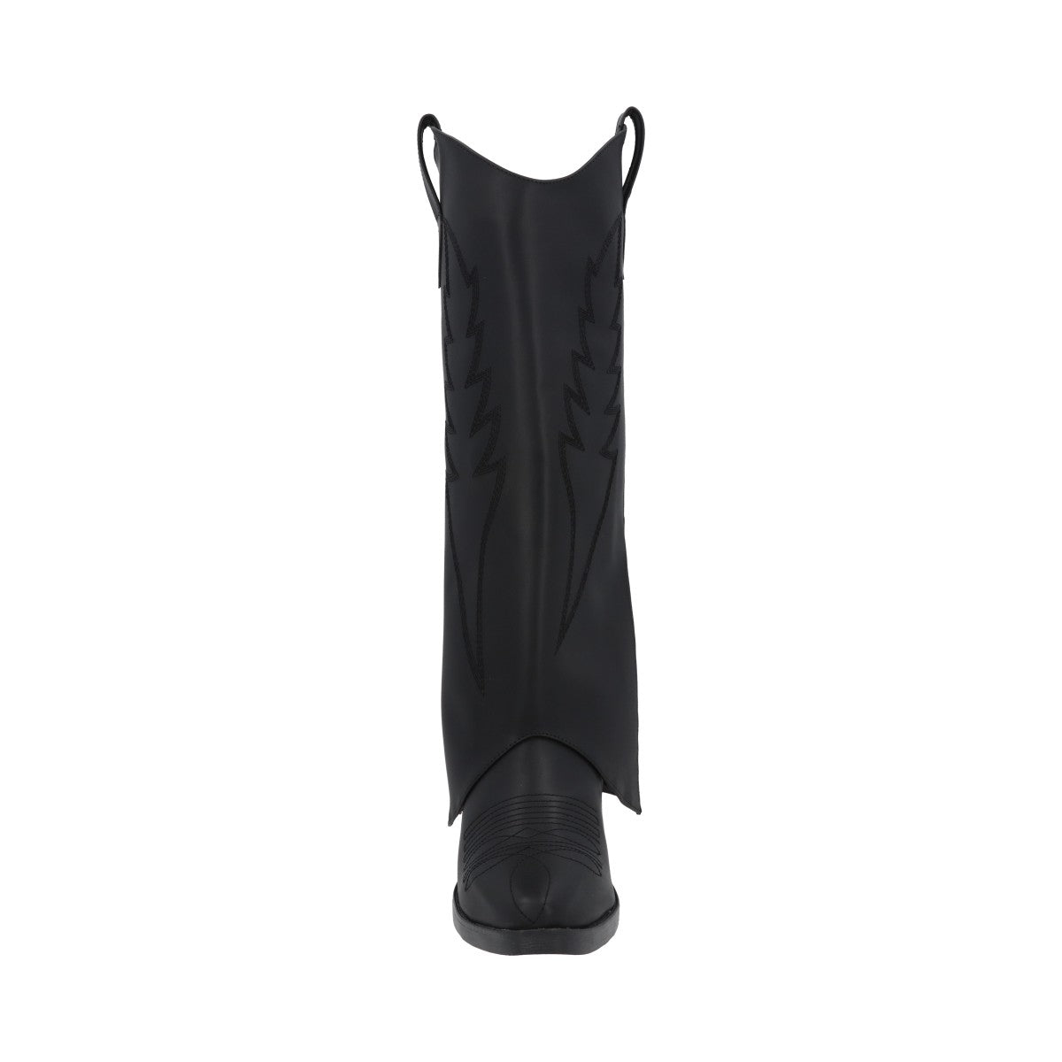 Descubre la Bota Vaquera Larga Con Diseño Rodeo en Cabra Piel Sintético Color Negro, una creación exclusiva de Platonia que combina tradición y estilo contemporáneo.