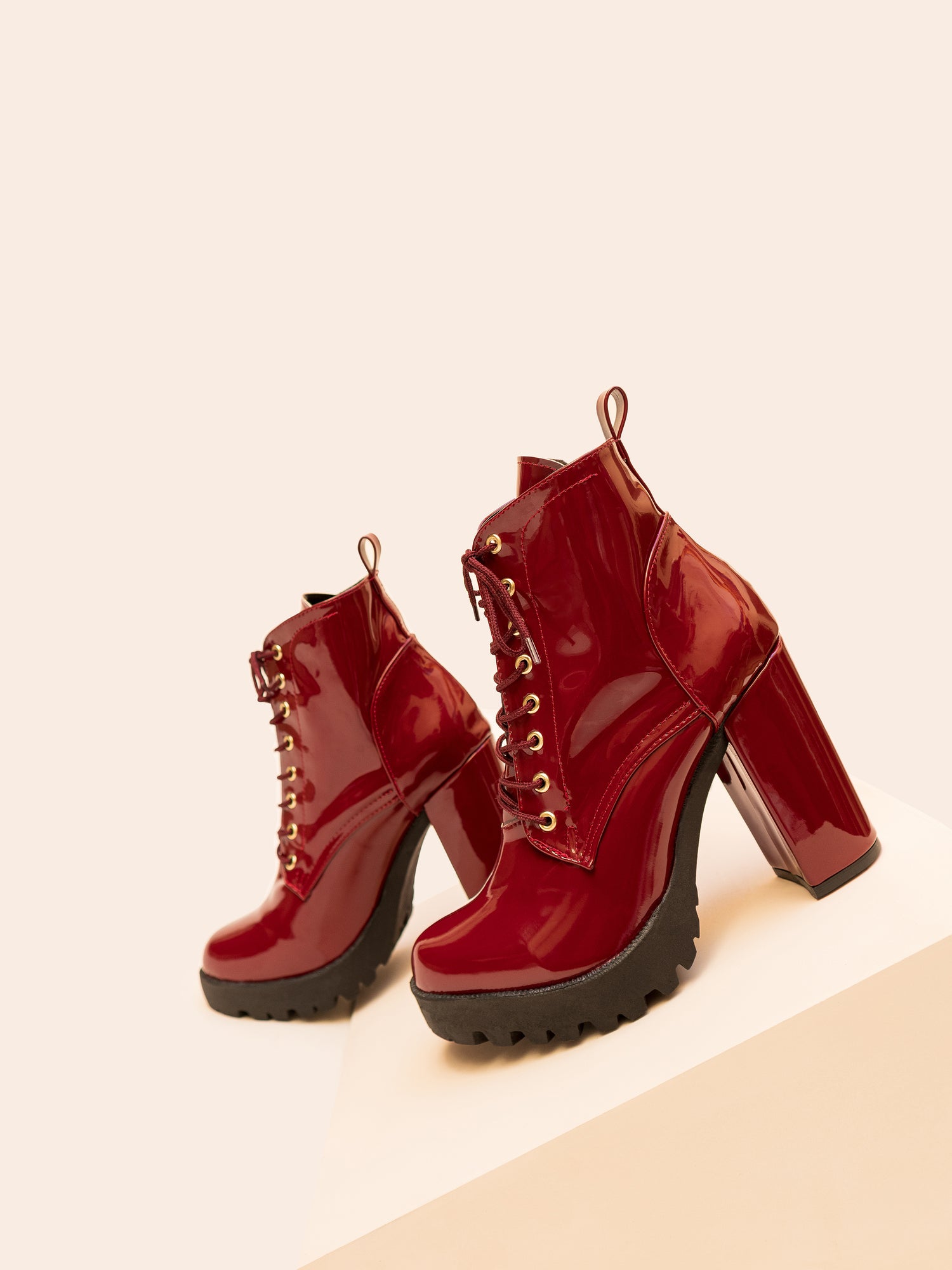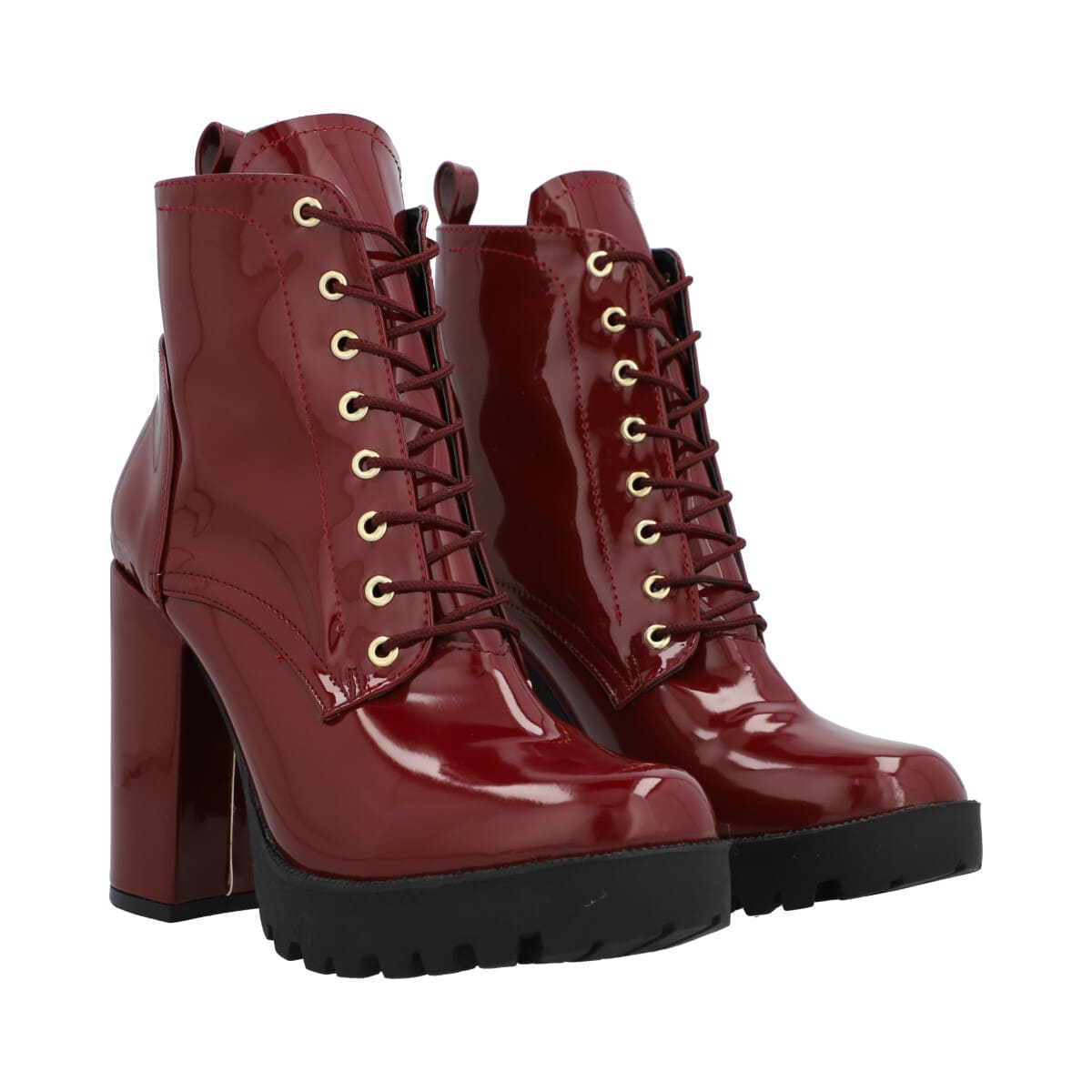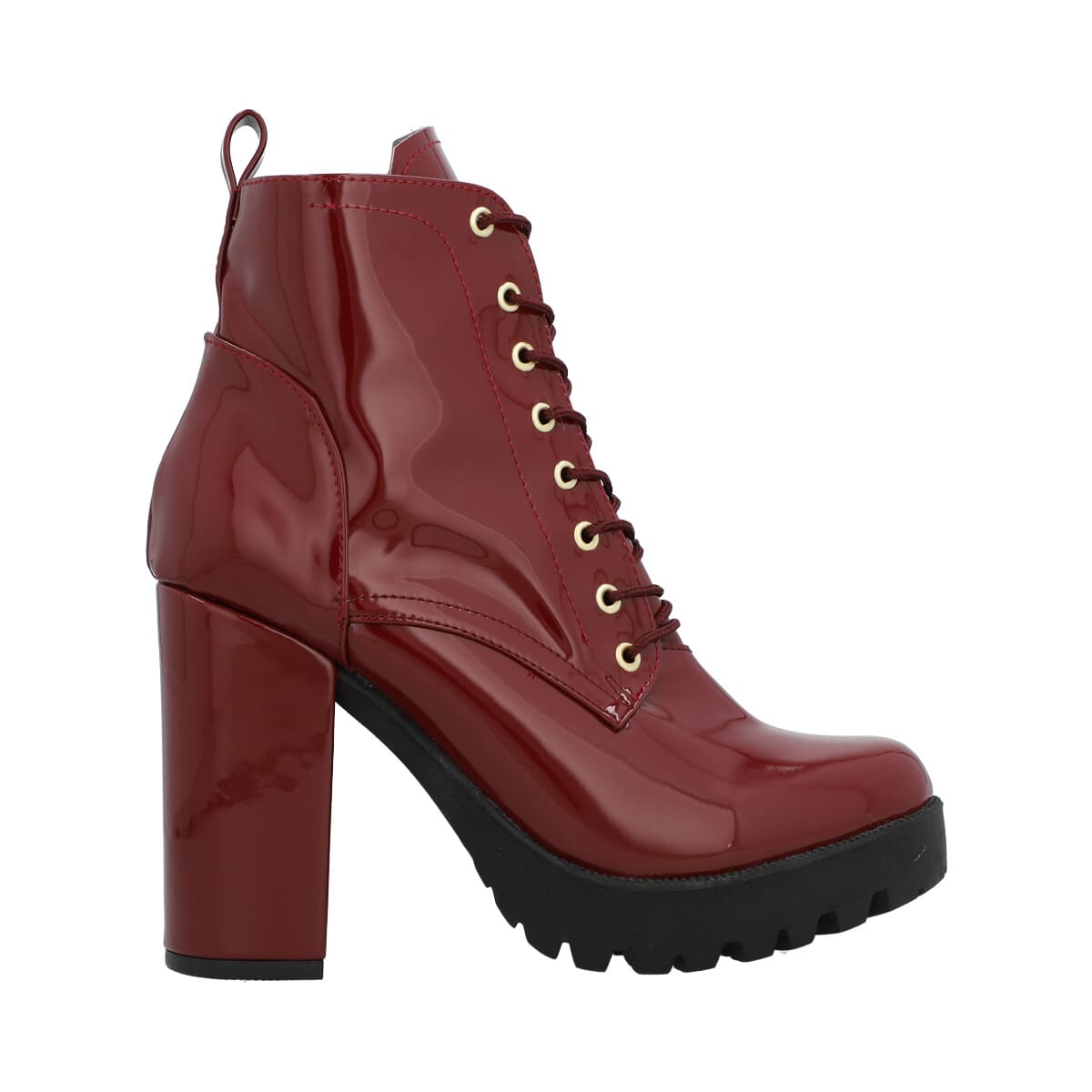Botín de plataforma para mujer charol premium color tinto con agujetas reforzadas tipo combat boots.