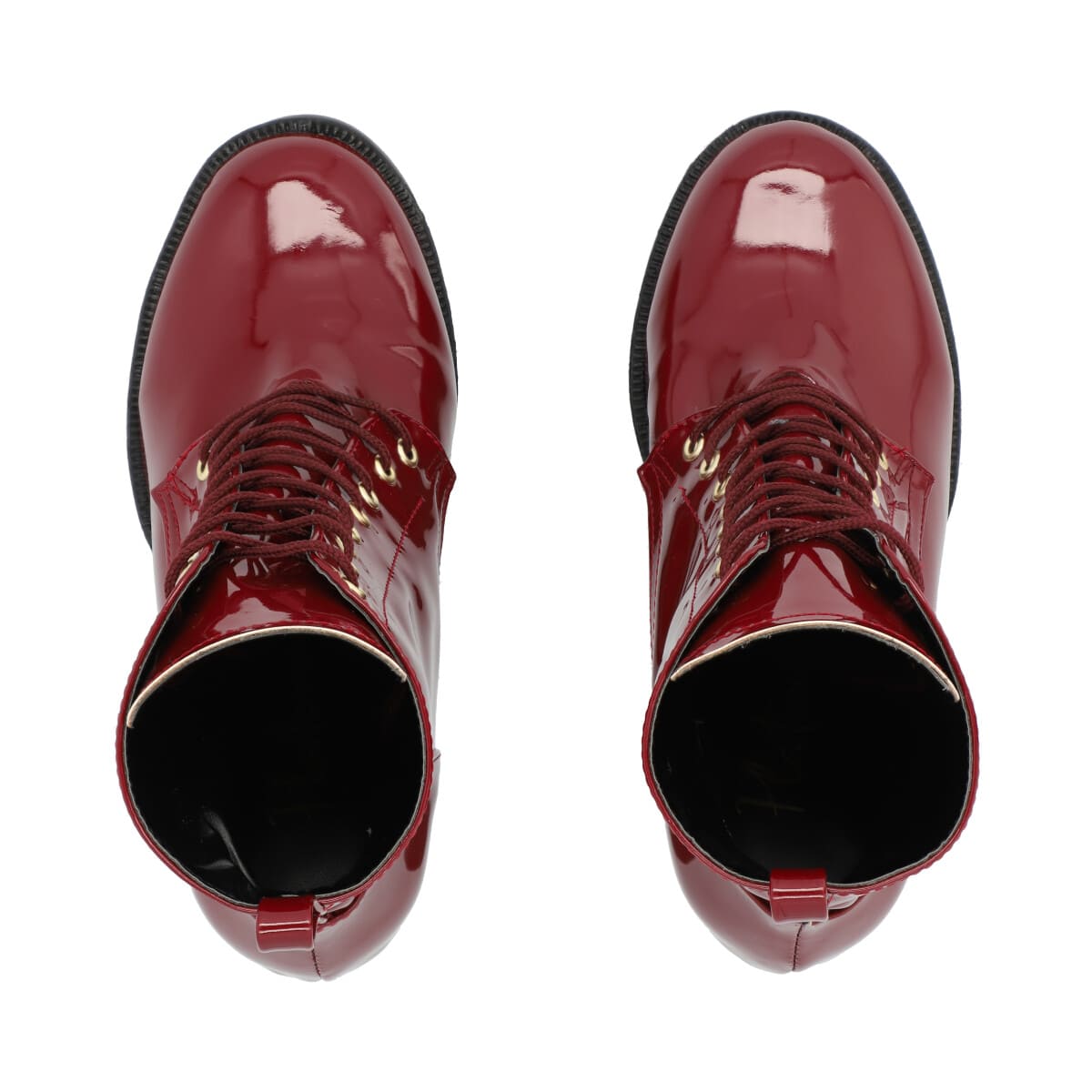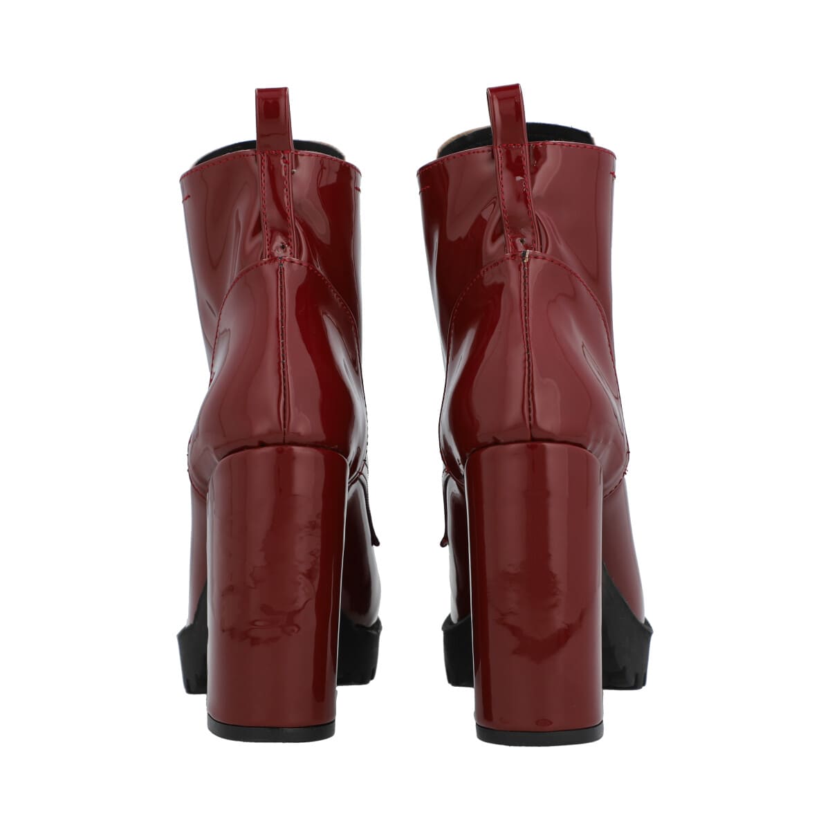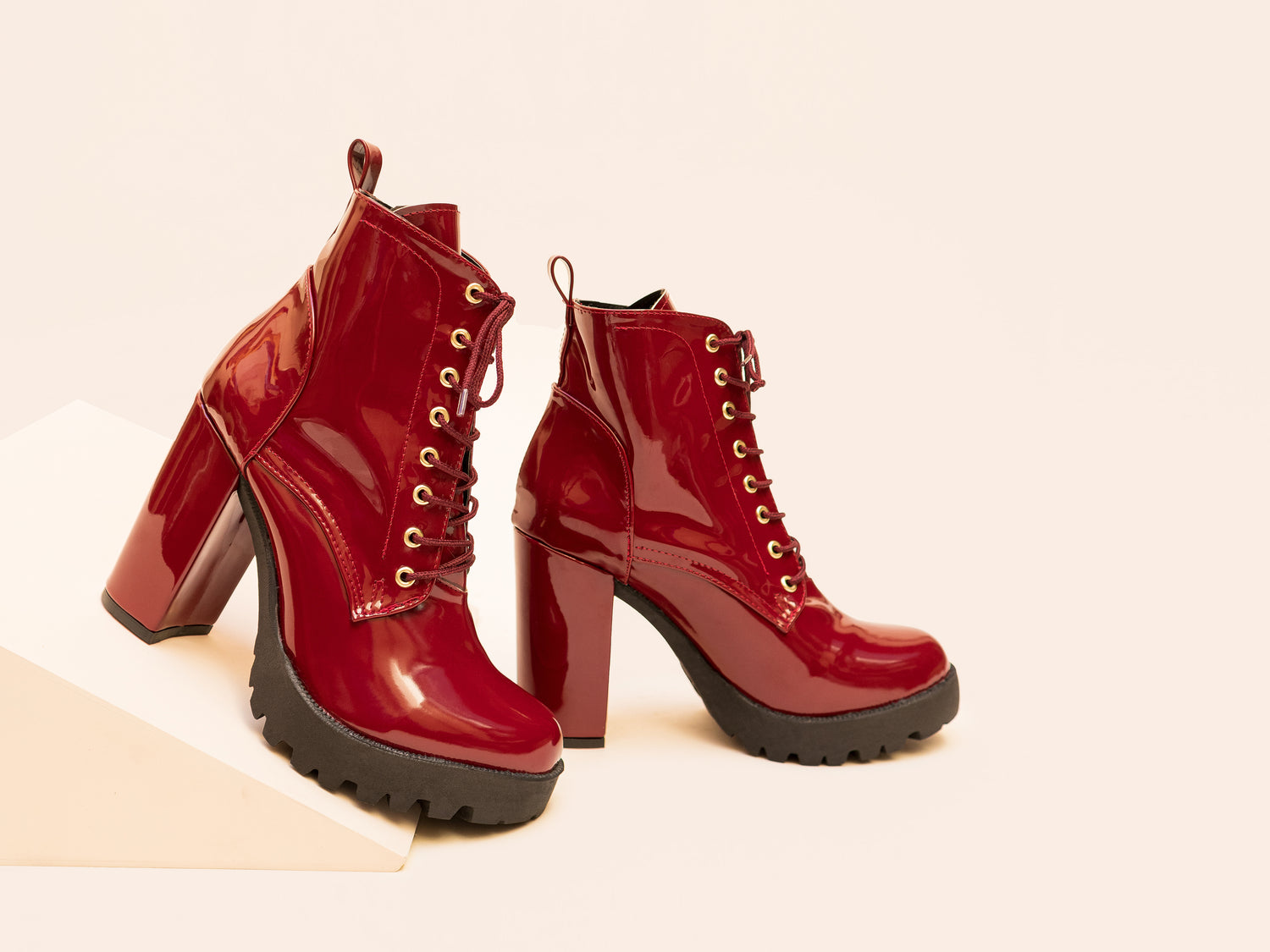 Botín de plataforma para mujer charol premium color tinto con agujetas reforzadas tipo combat boots.