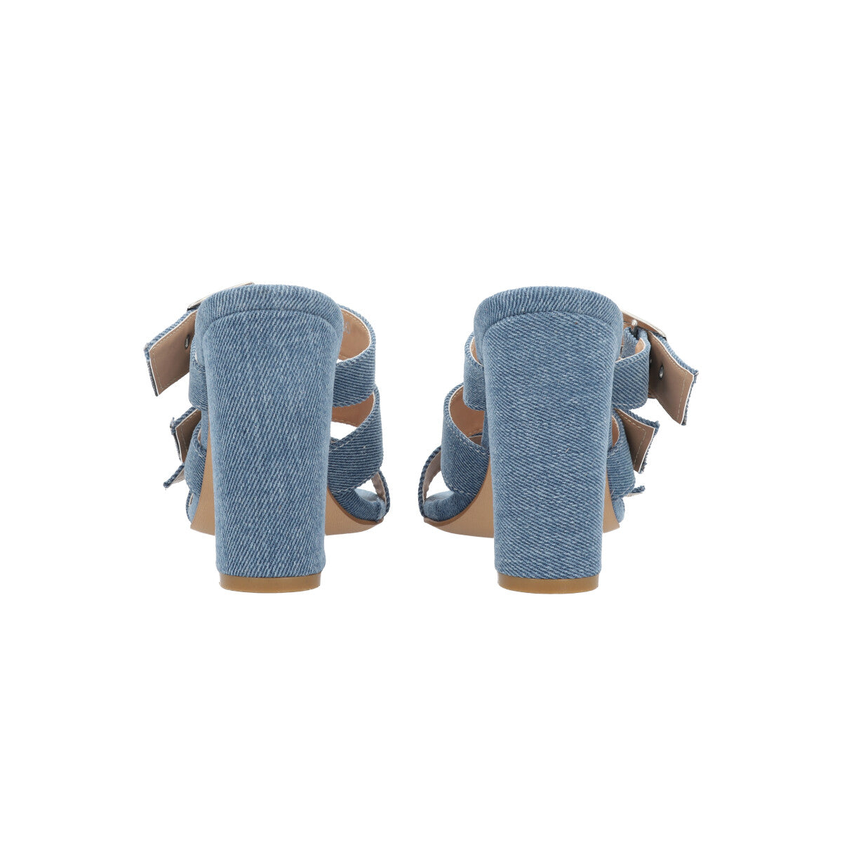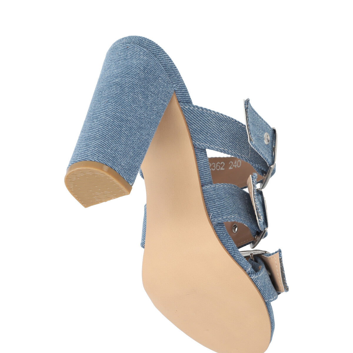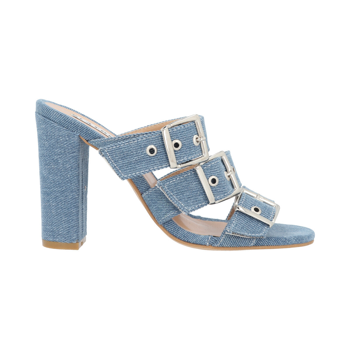 Zapatilla de tacón estilizado para mujer color mezclilla azul con hebillas y látigos ajustables.