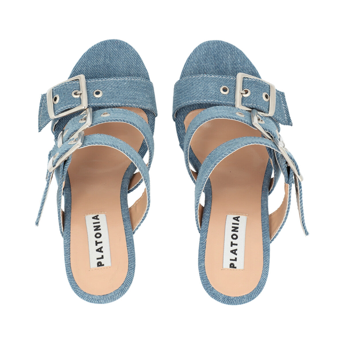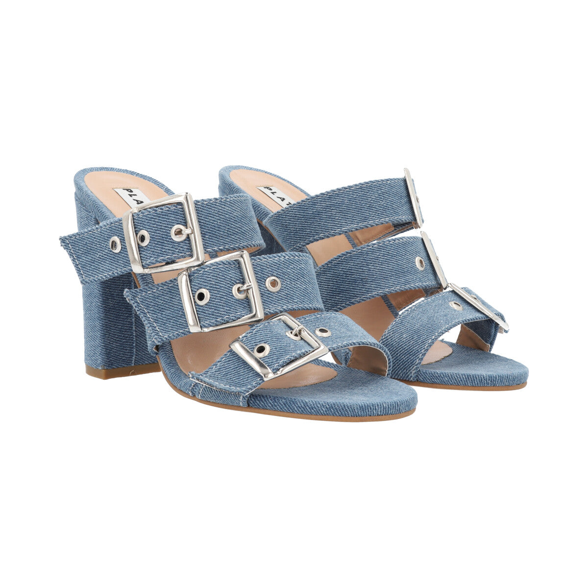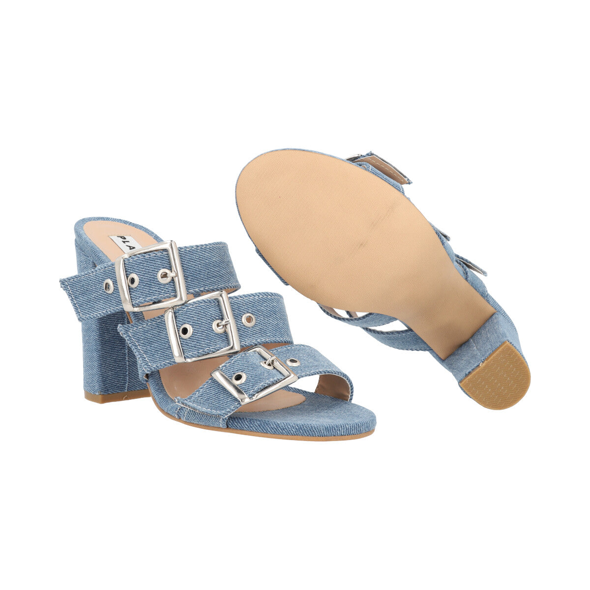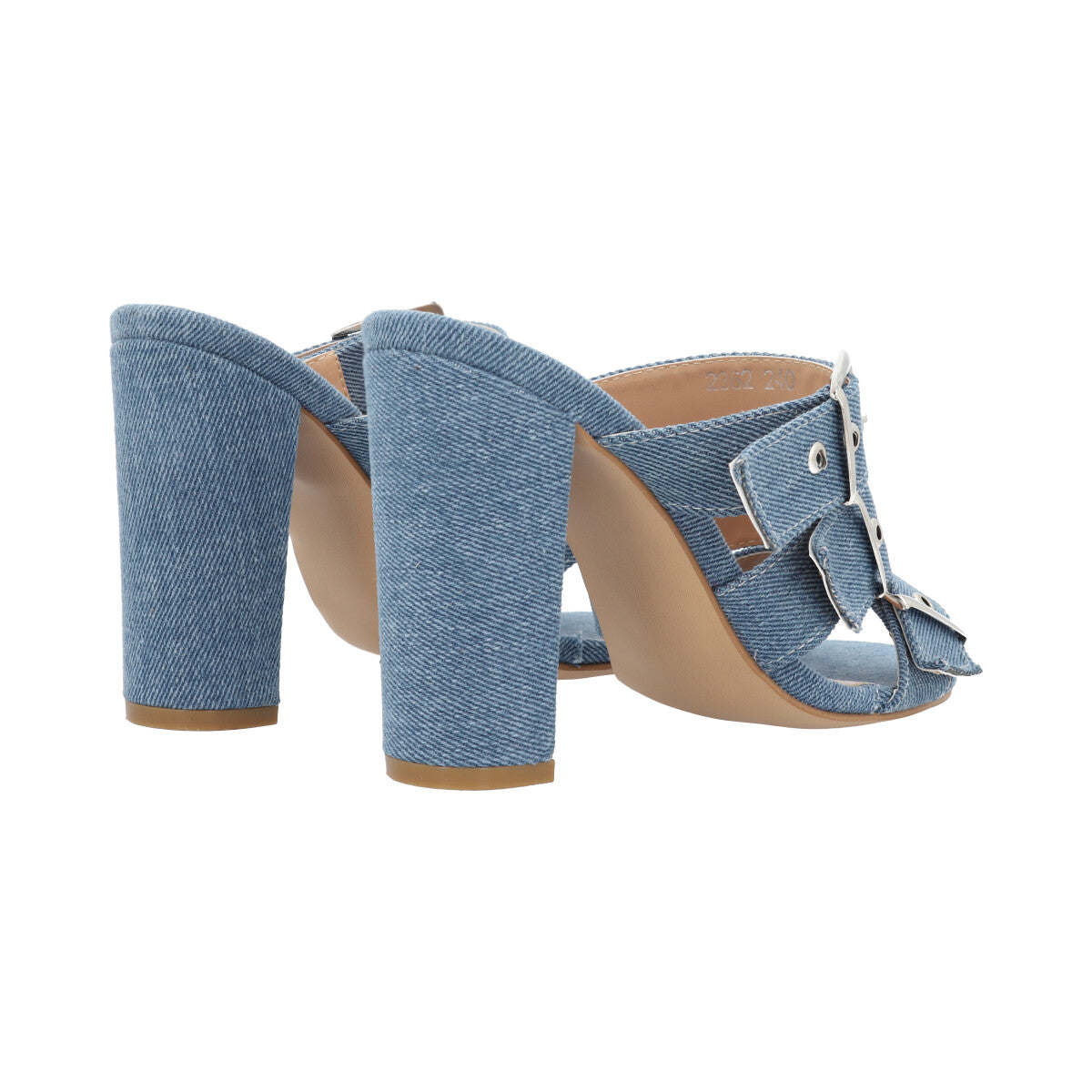 Zapatilla de tacón estilizado para mujer color mezclilla azul con hebillas y látigos ajustables.